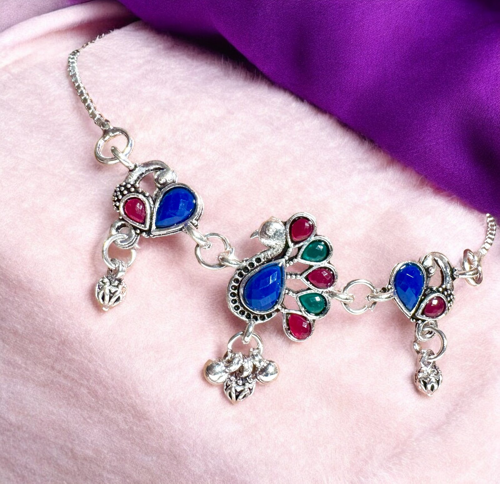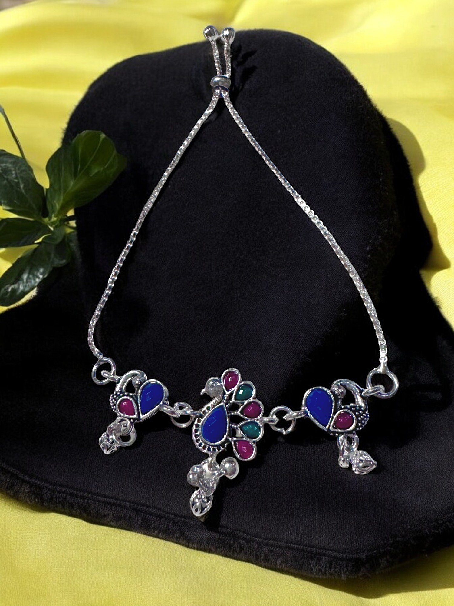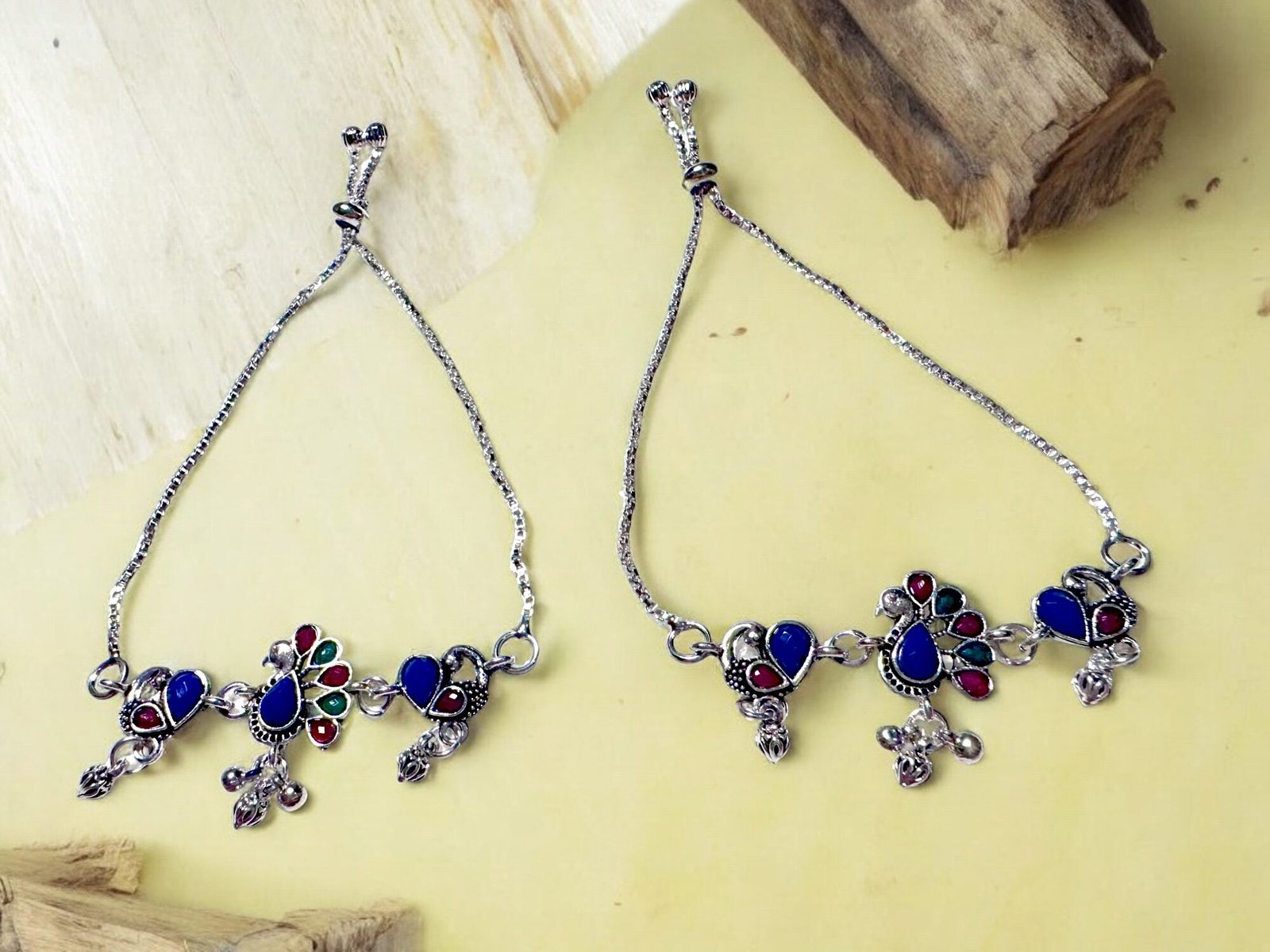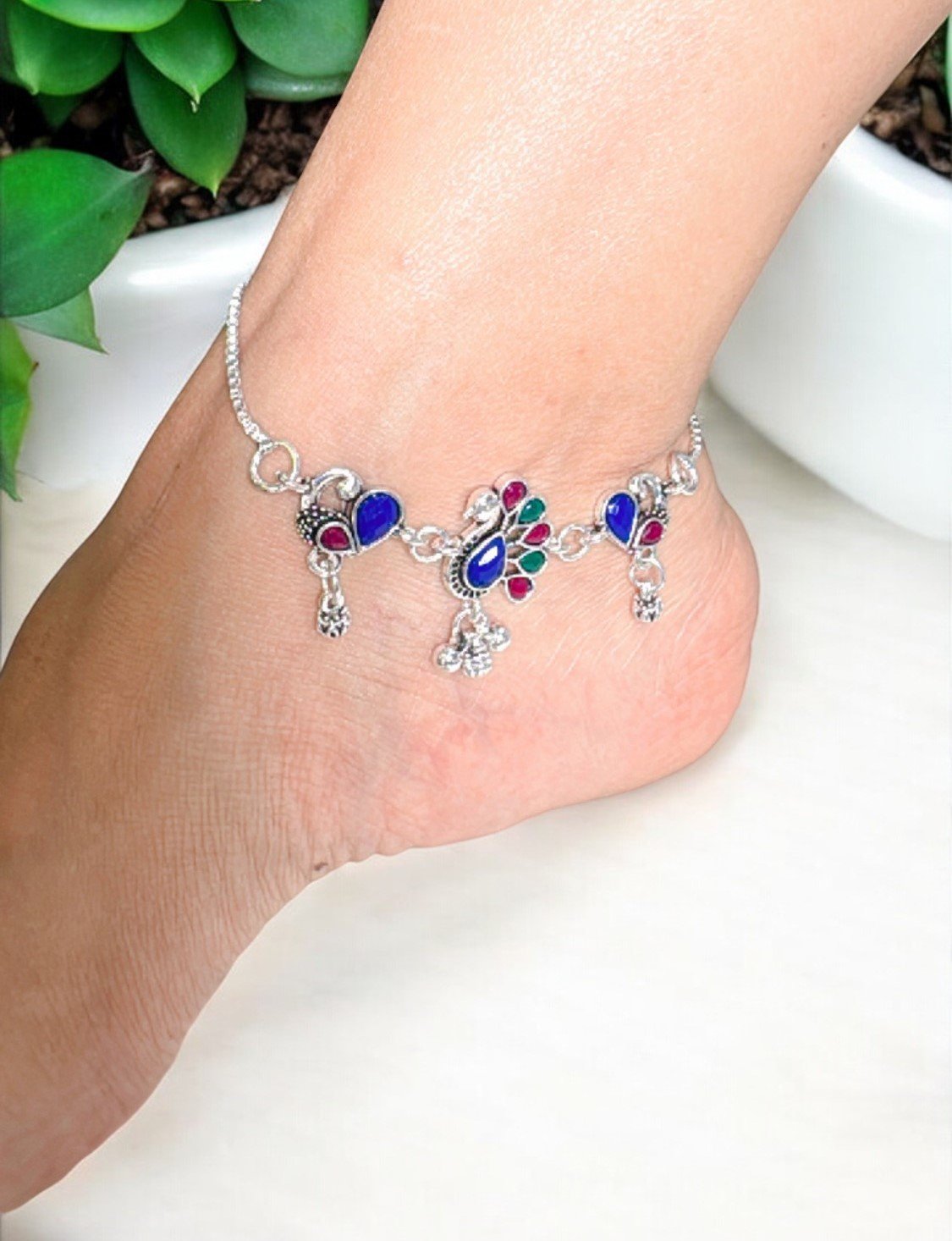 Silver anklet with peacock motifs and colorful gemstones. The anklet has a chain design with a series of peacock-shaped pendants. Each pendant is adorned with green, red, and blue gemstones. The anklet also has dangling charms with green and blue gemstones