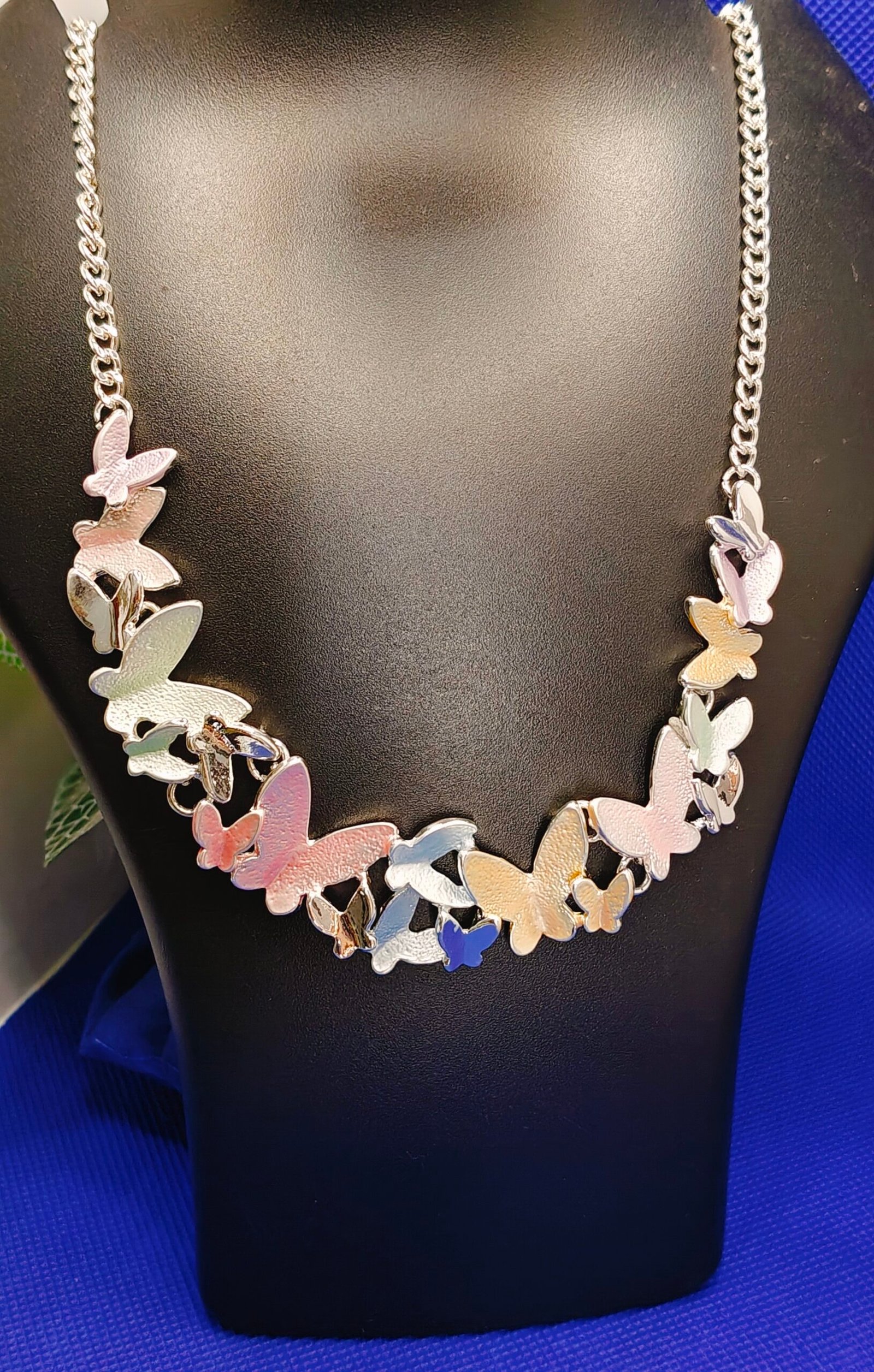 Flutter into style with this charming necklace featuring an array of delicate butterflies in various metallic tones. A playful and elegant accessory perfect for adding a touch of nature-inspired beauty to any outfit.