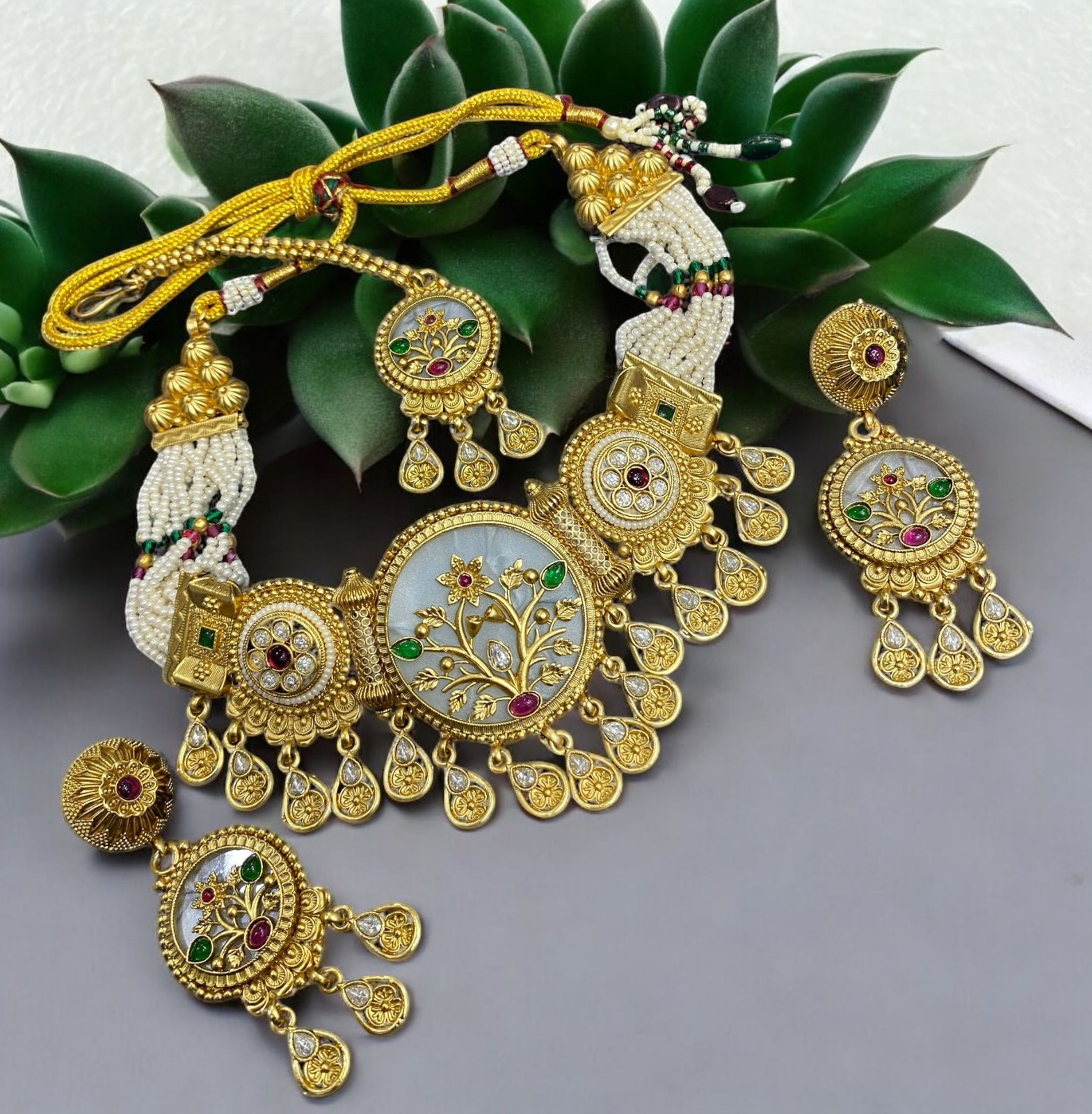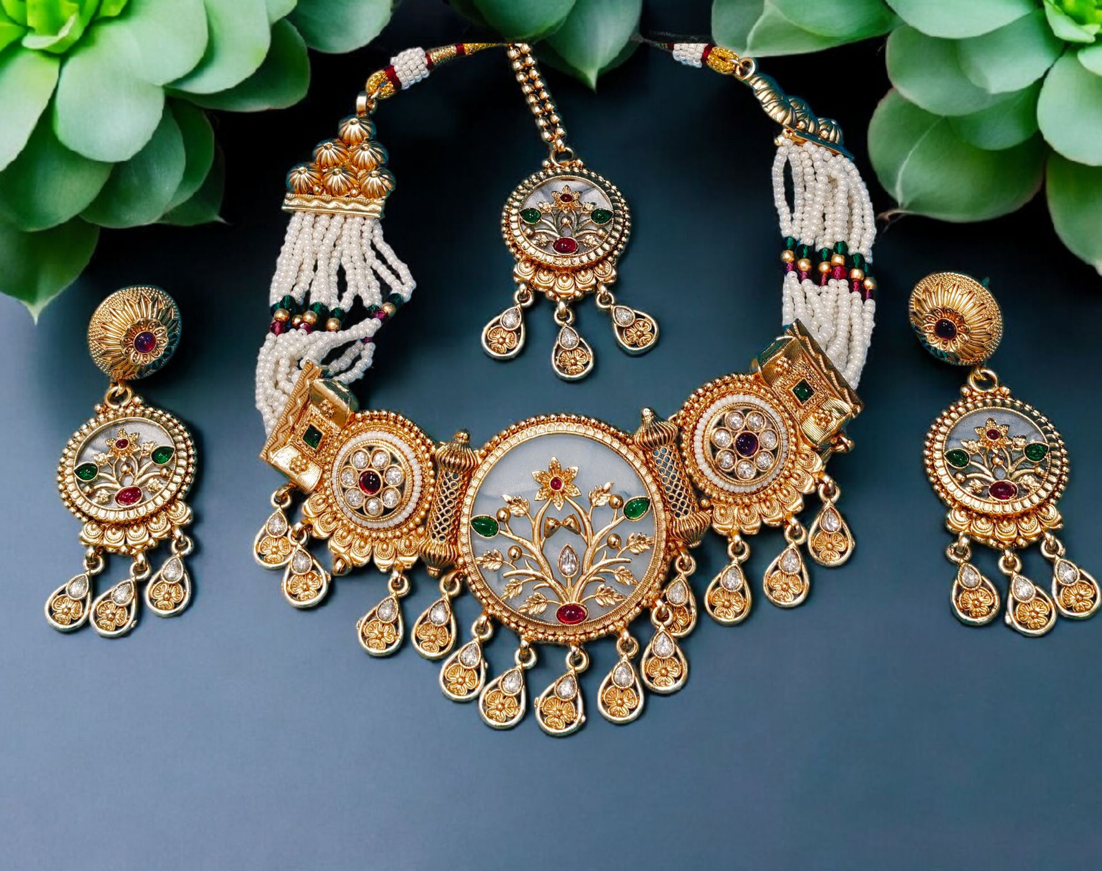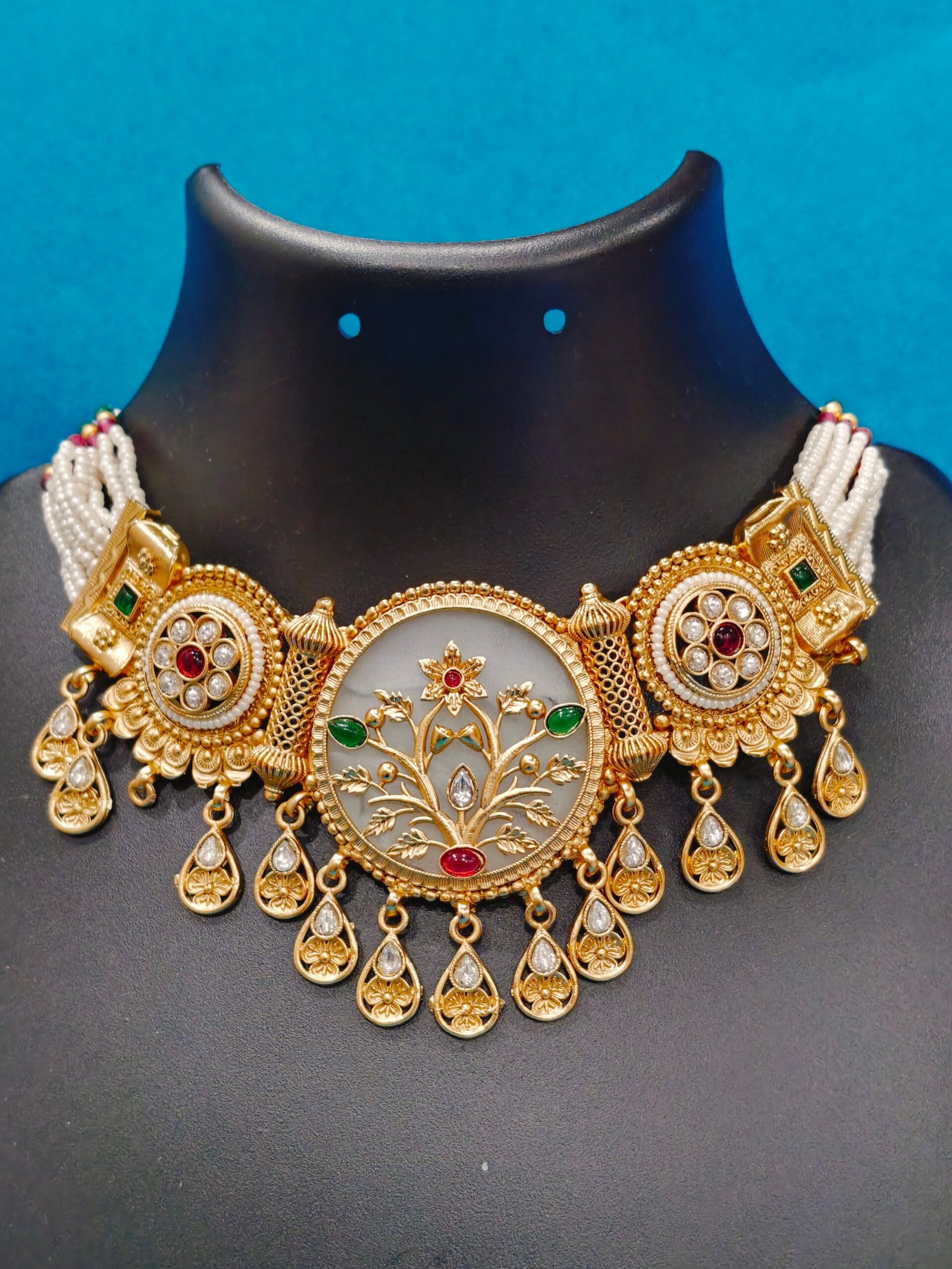 * Necklace Style: Choker necklace with a central pendant and multi-strand pearl detailing.