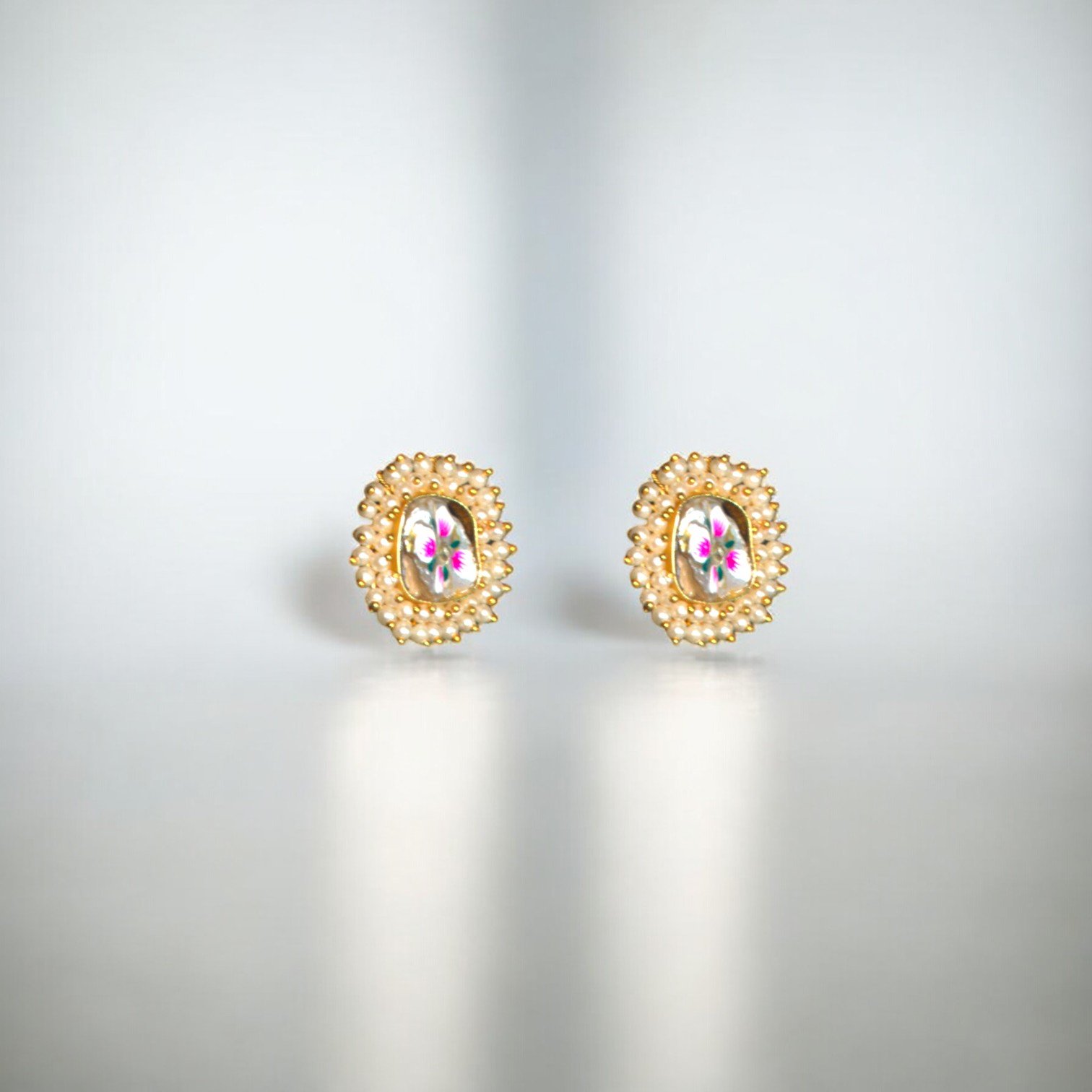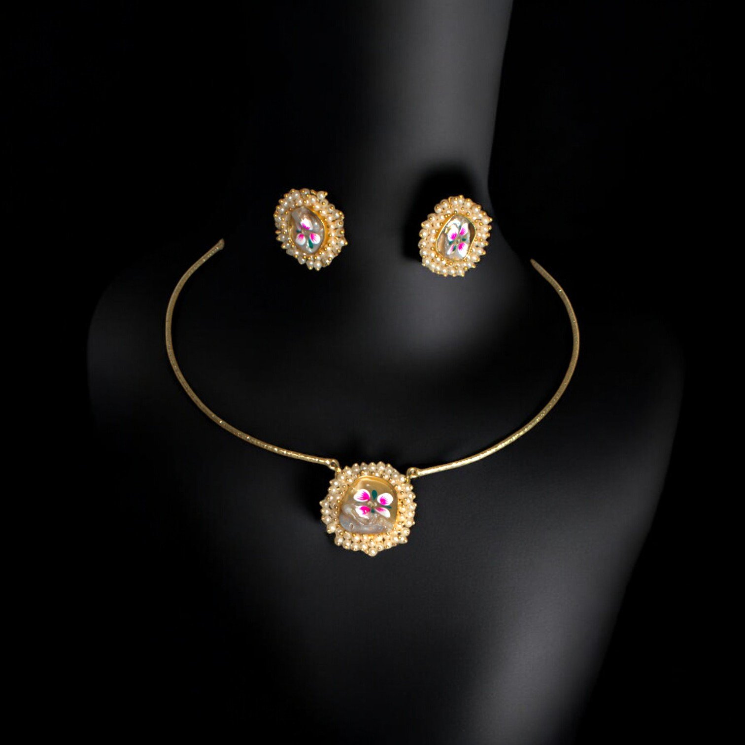 Channel timeless elegance with the Blossom Pearl Choker Set. Featuring a delicate gold-toned choker and matching stud earrings, this set is adorned with intricate floral motifs, hand-painted in vibrant hues, and framed by radiant pearl detailing. Perfect for adding a touch of regal charm to any occasion, this versatile design is your go-to for both traditional and modern looks.