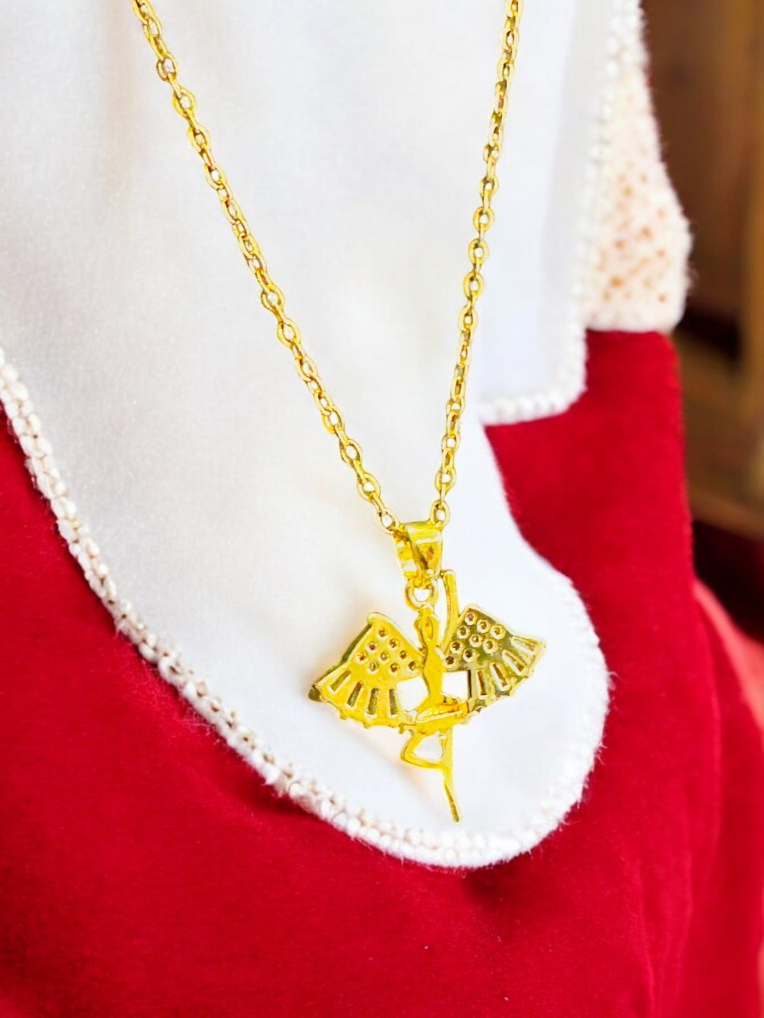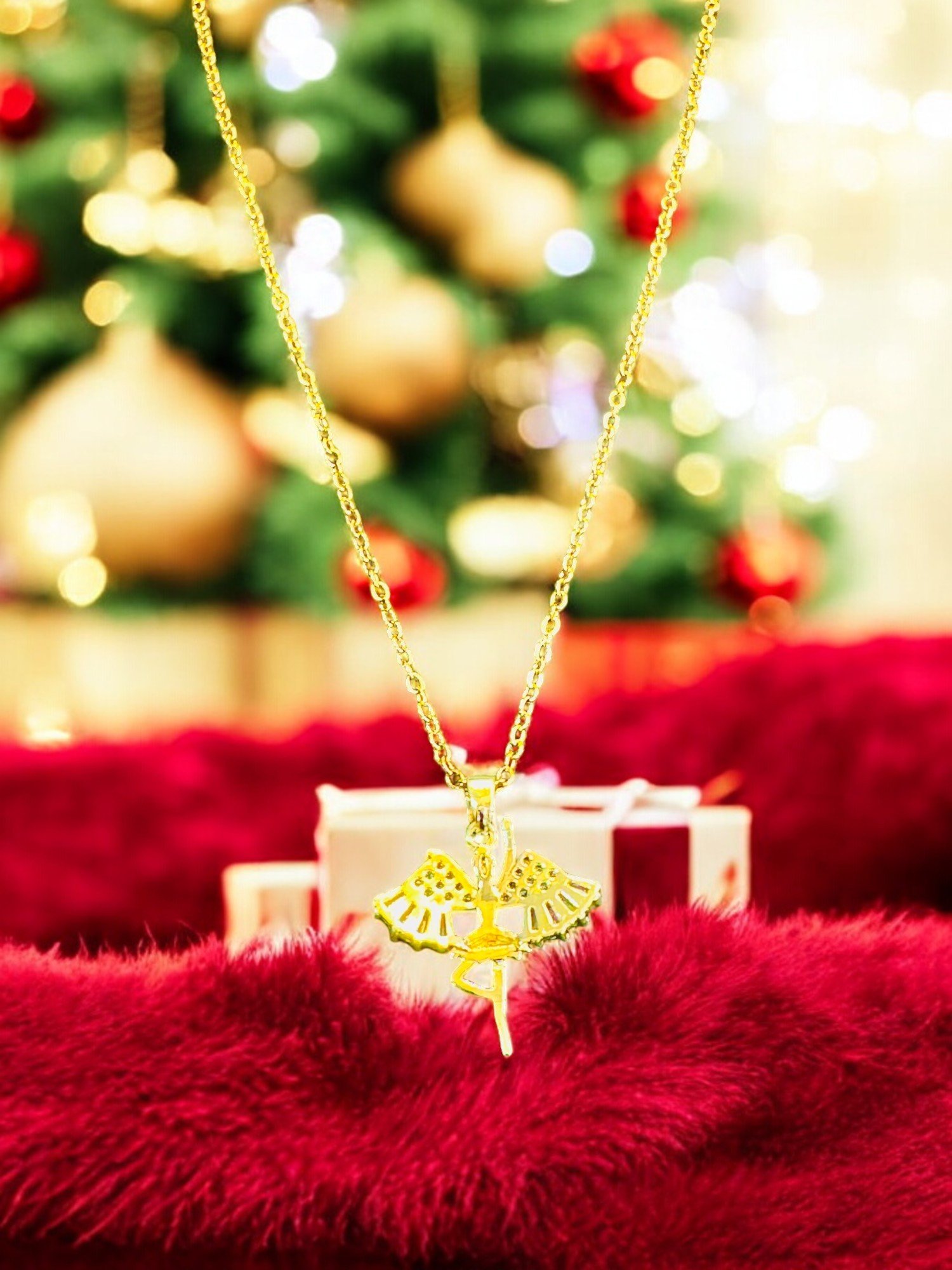 This dazzling gold necklace features a charming angel pendant adorned with sparkling cubic zirconia. Perfect for adding a touch of elegance and a celestial touch to any outfit.