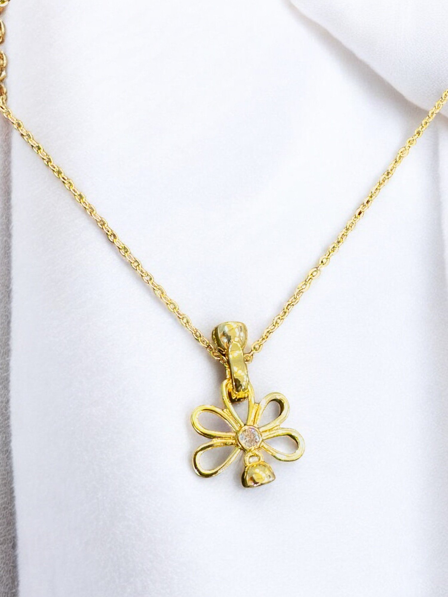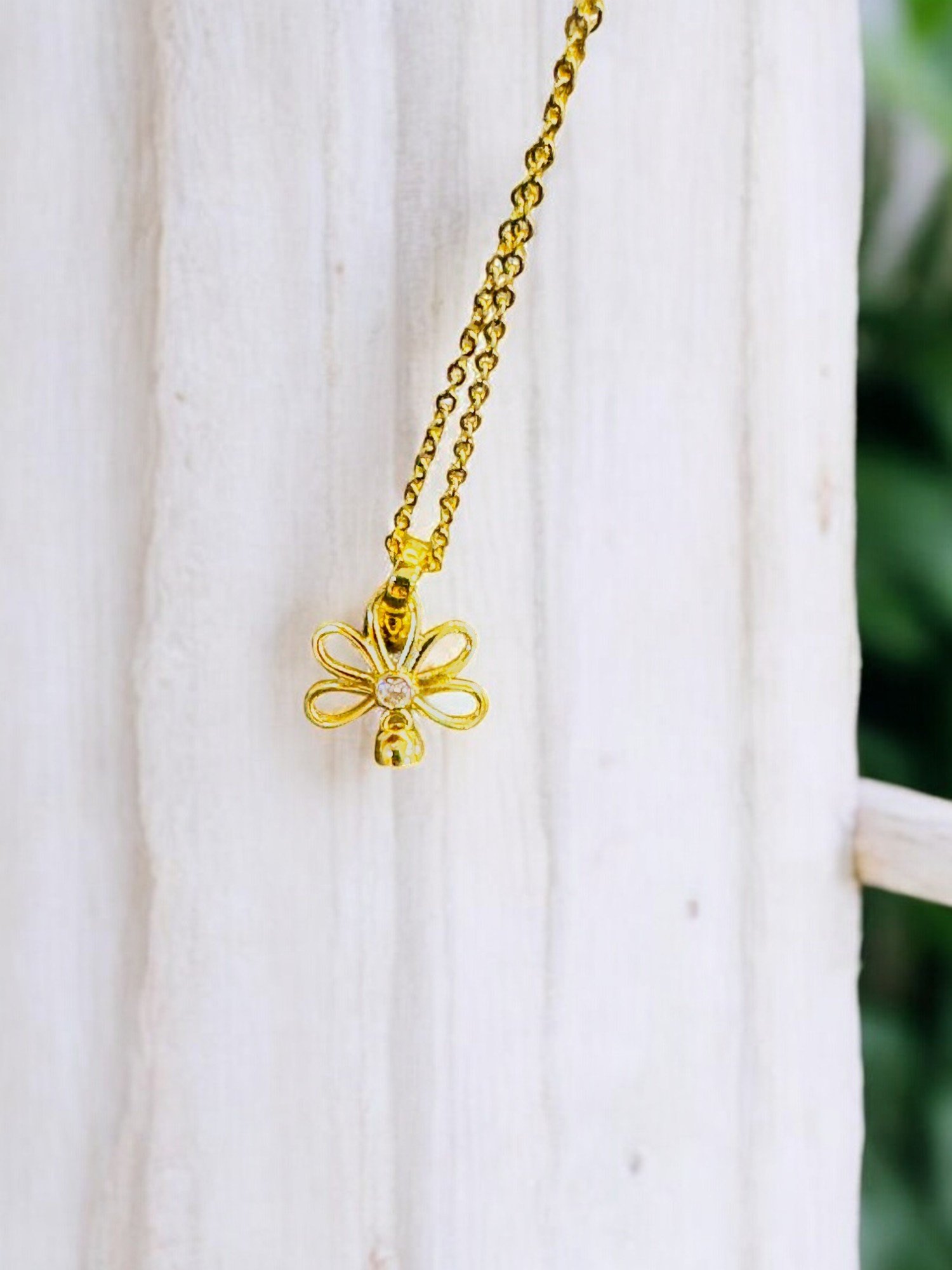 This delicate gold necklace features a charming flower pendant adorned with a sparkling cubic zirconia. Perfect for adding a touch of elegance and nature’s beauty to any outfit.