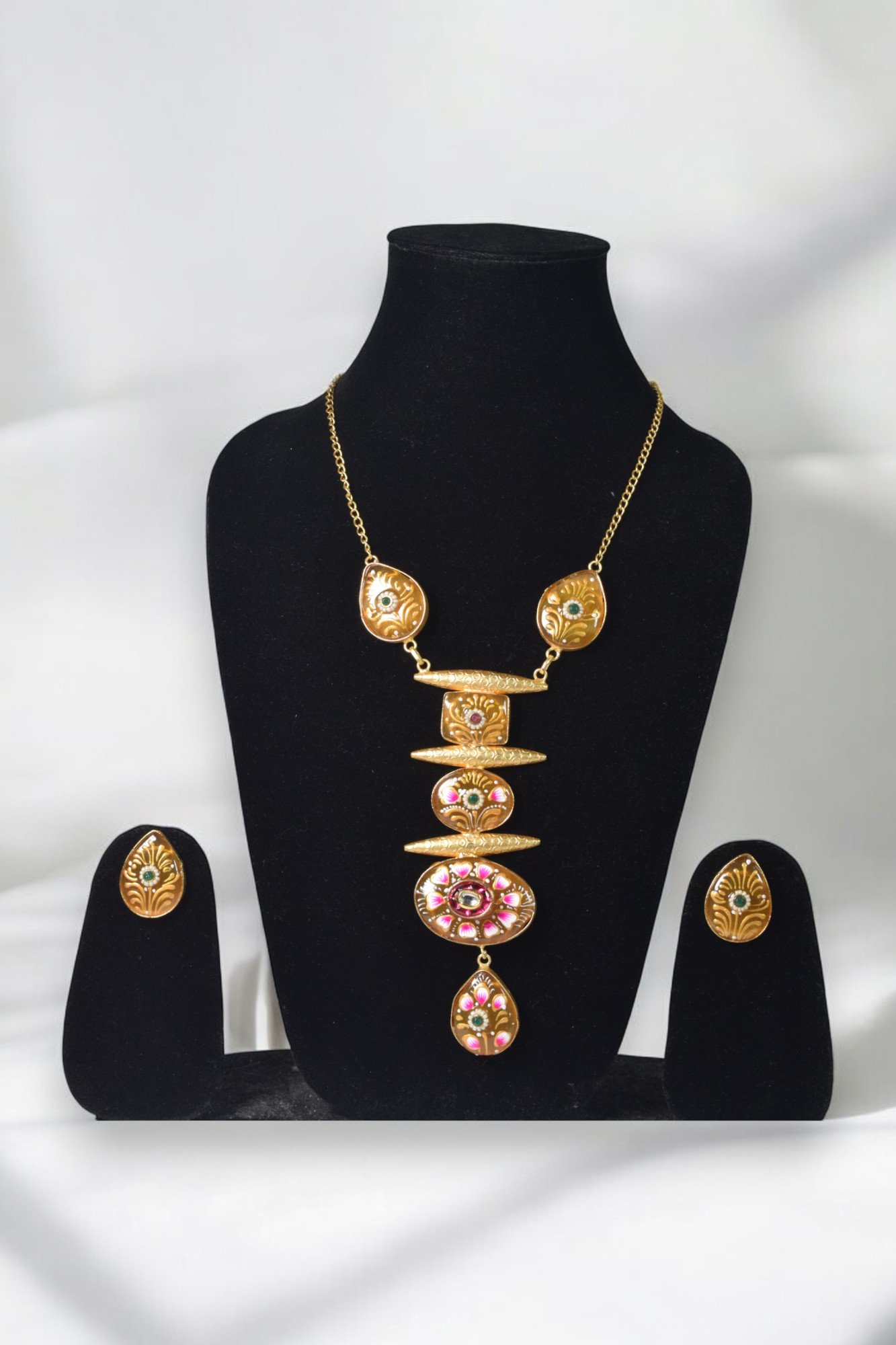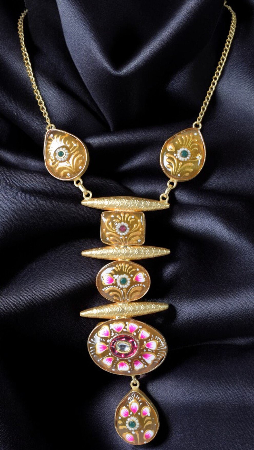 Stand out from the crowd with this truly unique gold-tone necklace in monalisa stone. The combination of geometric shapes, colorful enamel, and gemstone accents creates a one-of-a-kind piece that is both modern and timeless.