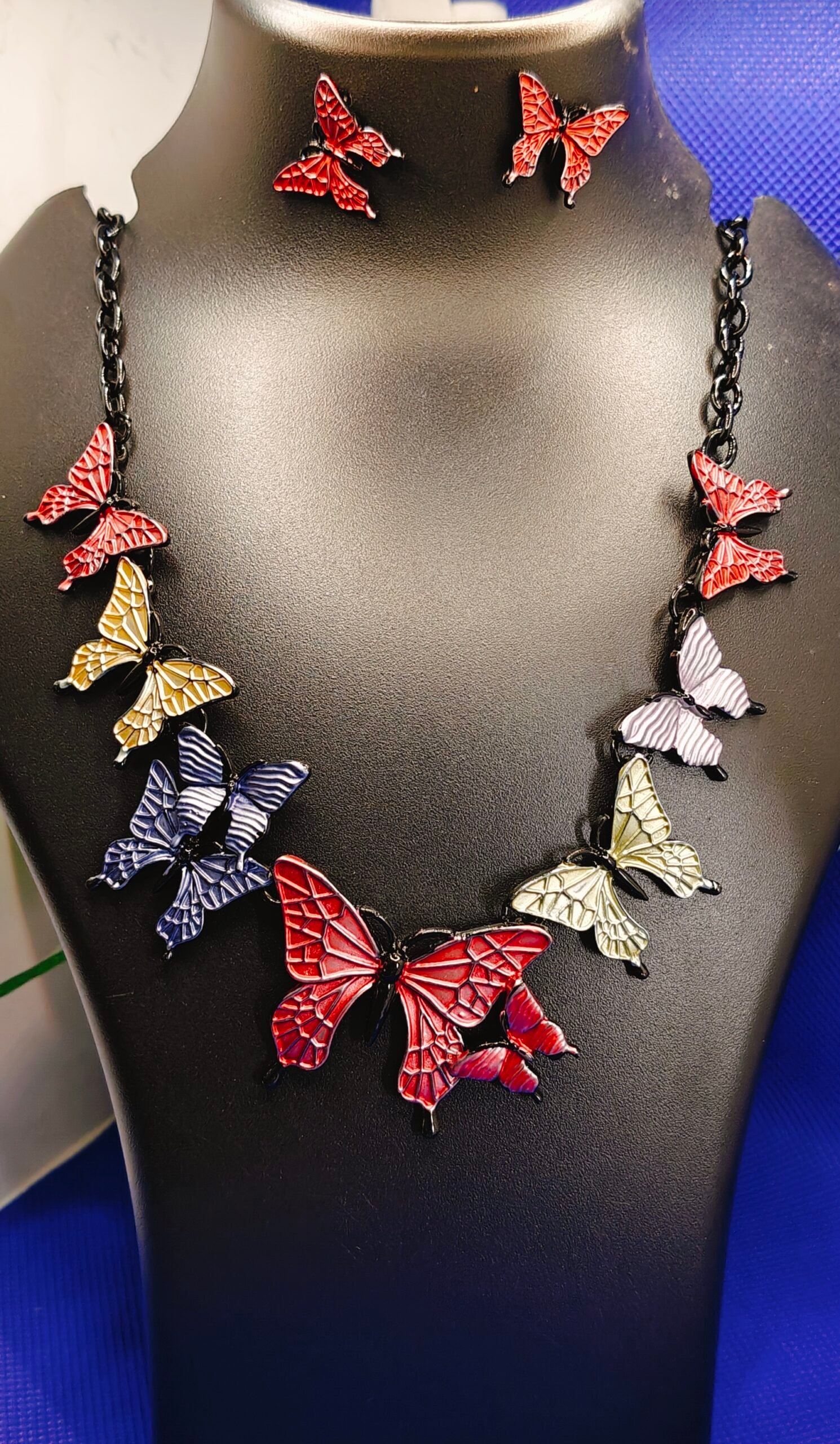 Make a bold statement with this fun butterfly jewelry set! Features a necklace adorned with colorful enamel butterflies in striking shades of red, yellow, blue, and more, perfectly matched with coordinating butterfly stud earrings