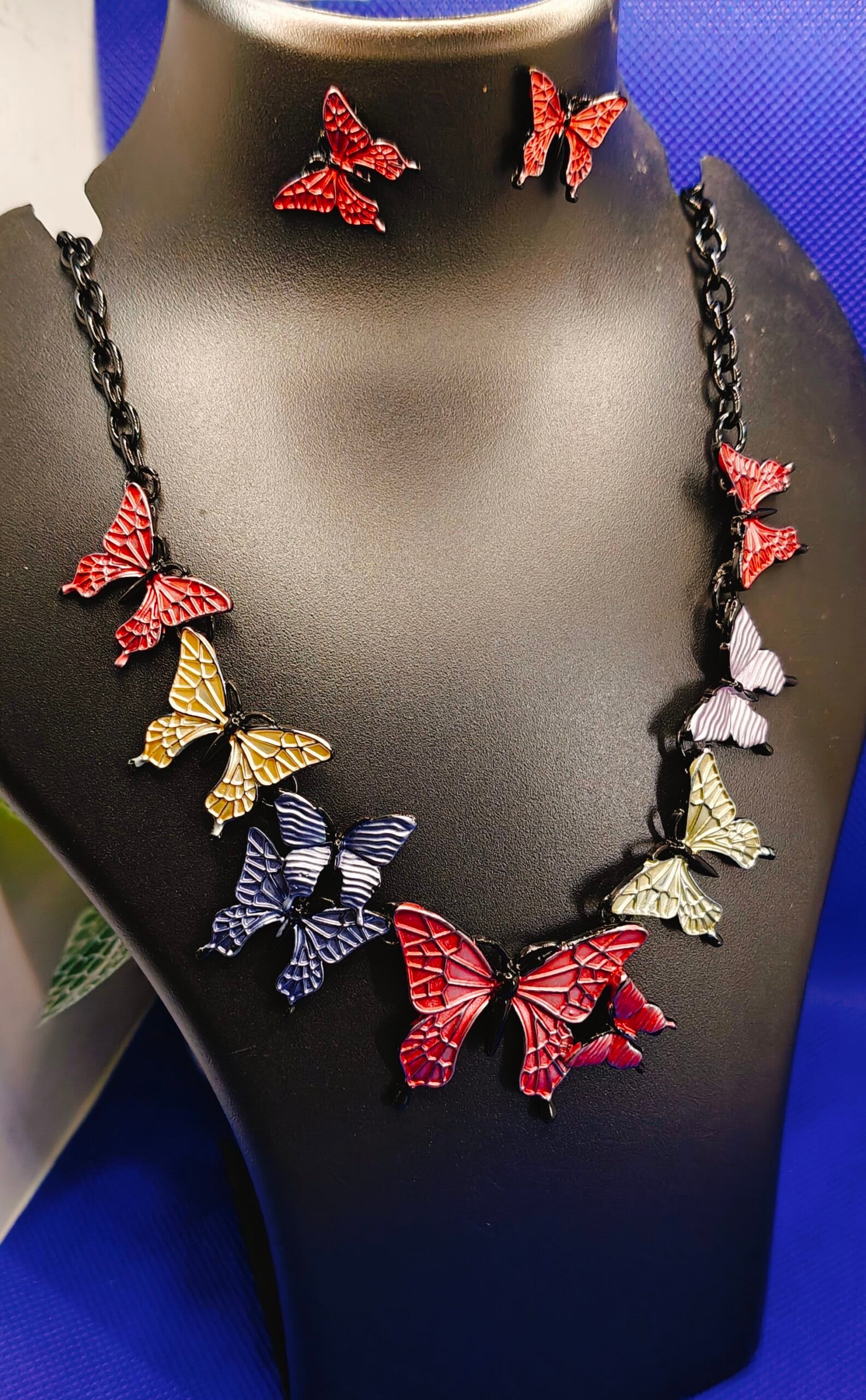 The necklace features an array of intricately detailed butterflies in a kaleidoscope of vibrant enamel colors, including fiery red, sunny yellow, deep navy, and subtle metallics. Each butterfly is beautifully textured, adding depth and interest. The coordinating stud earrings mirror the design, completing a lively and cohesive look.
