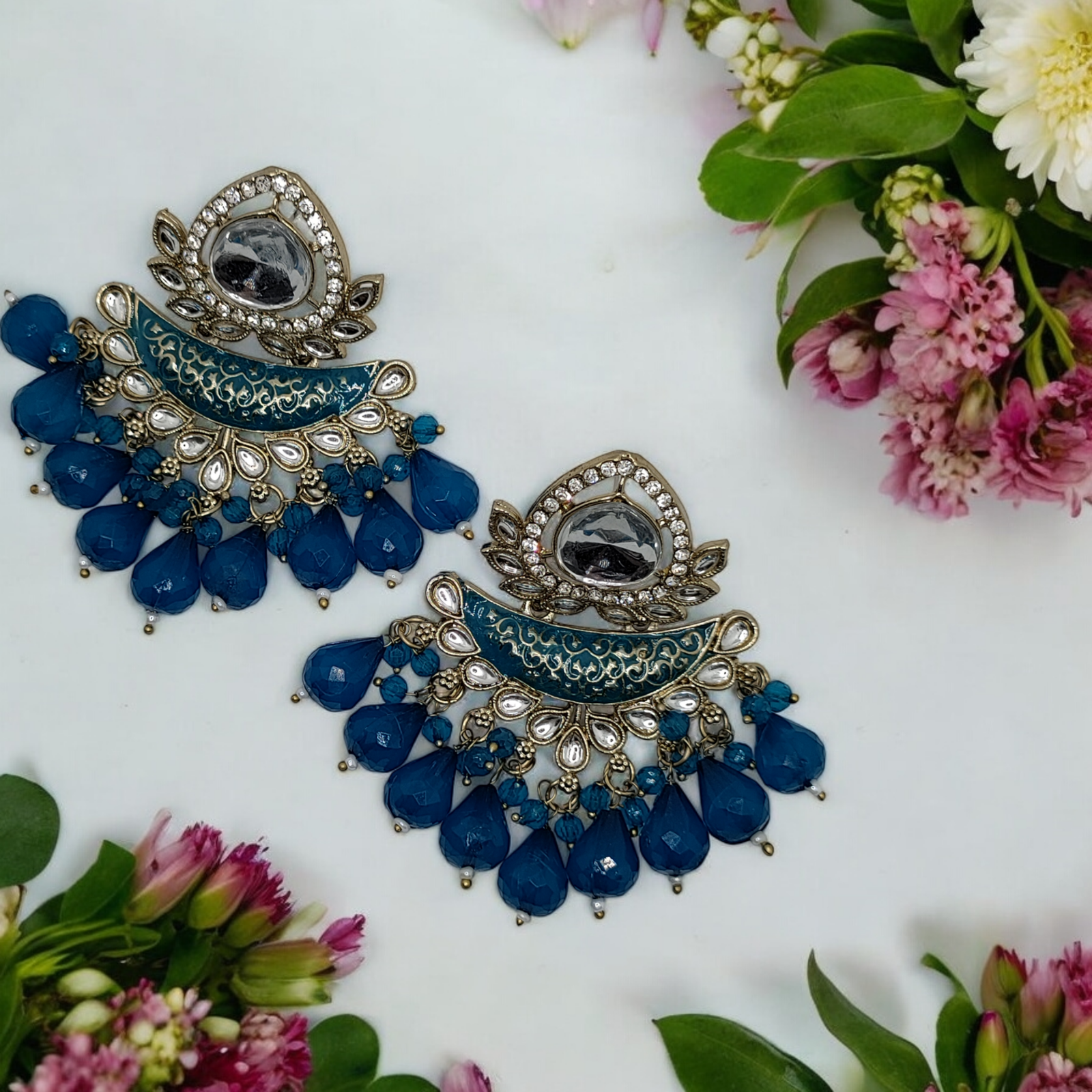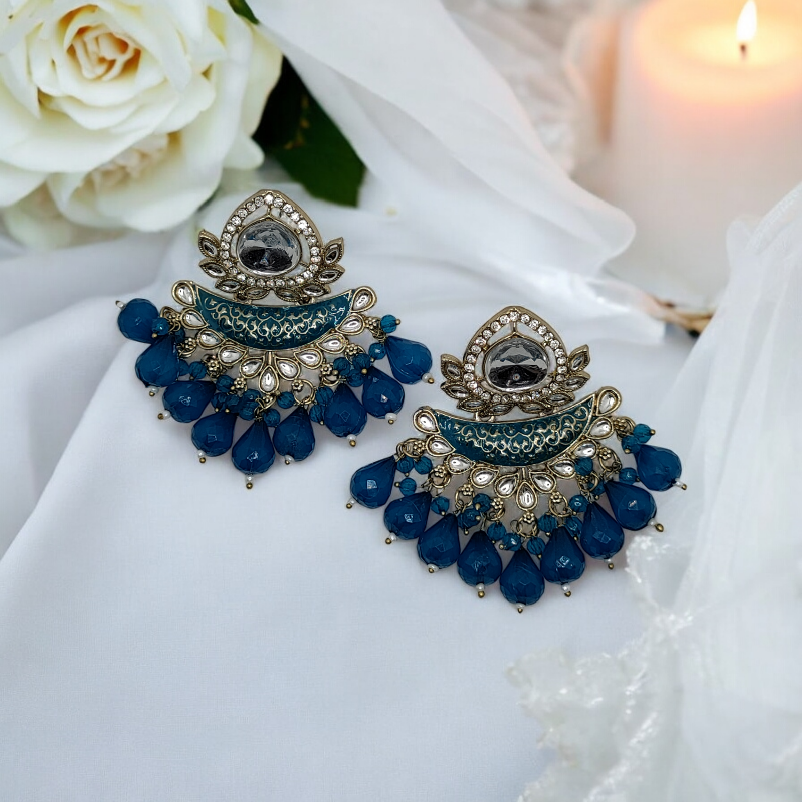 Intricate Crecent Earrings with Peacock Blue droplets and Large Clear Gemstone