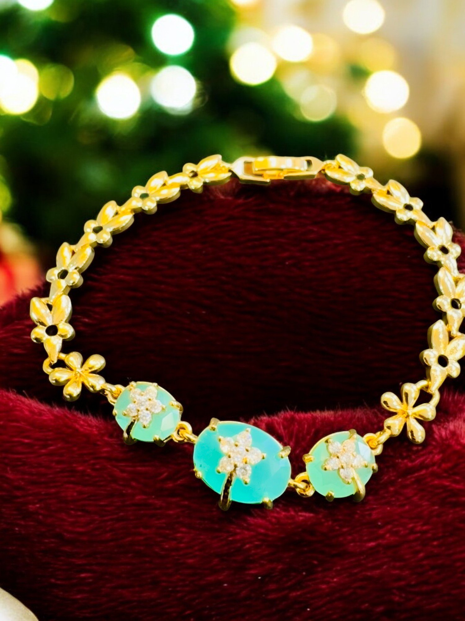 This elegant bracelet features a gold-plated floral design with sparkling crystal accents. The delicate chain and eye-catching details make it a perfect addition to any jewelry collection