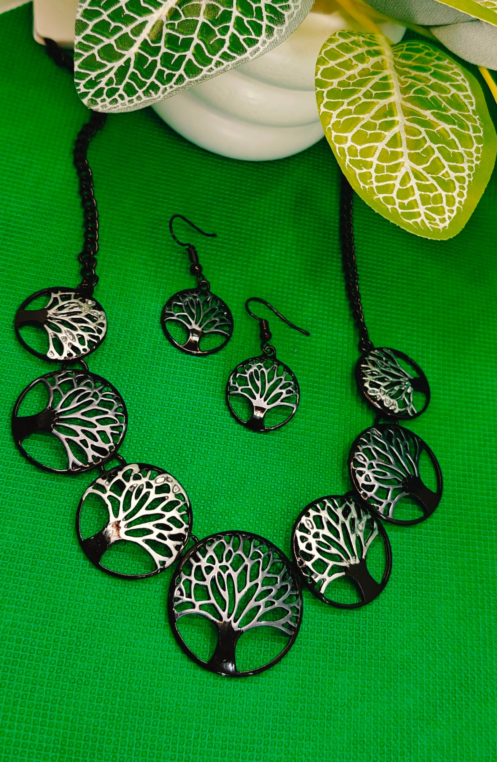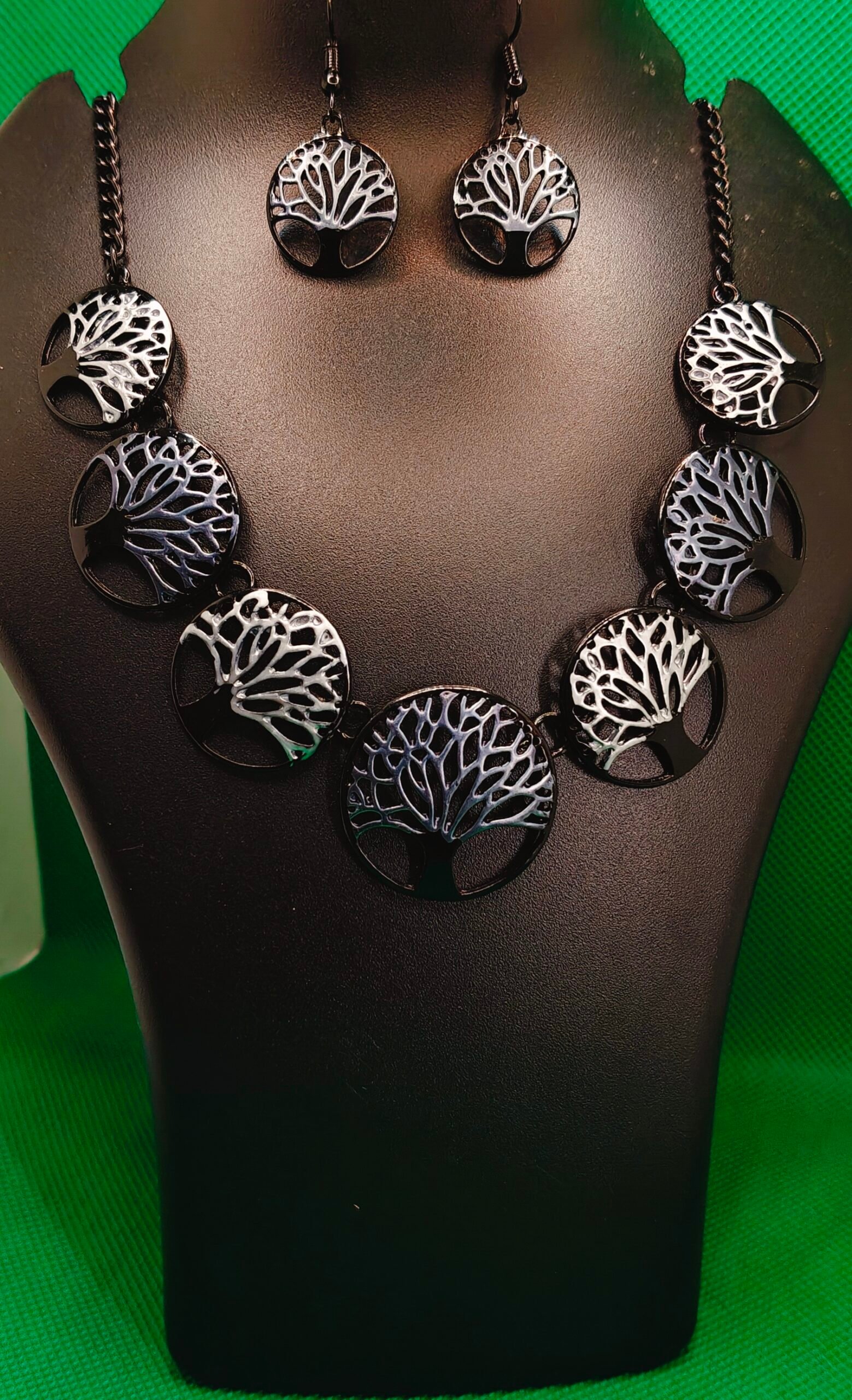 Embrace the beauty and symbolism of the “Tree of Life” with this elegant jewelry set. Features a striking necklace with multiple detailed tree motifs in a contrasting black and silver-tone finish, perfectly matched with delicate dangle earrings. A meaningful and stylish accessory for any occasion.