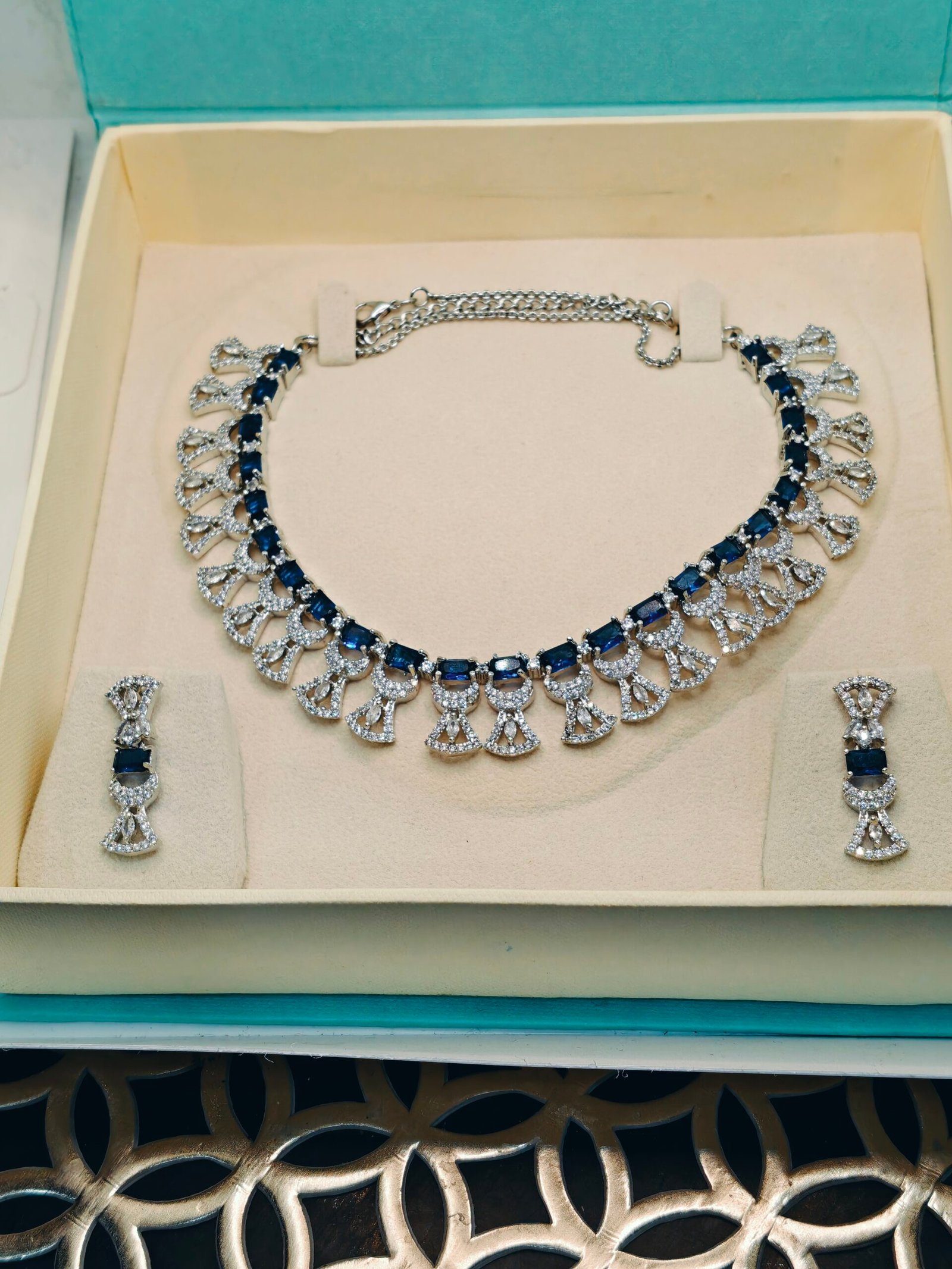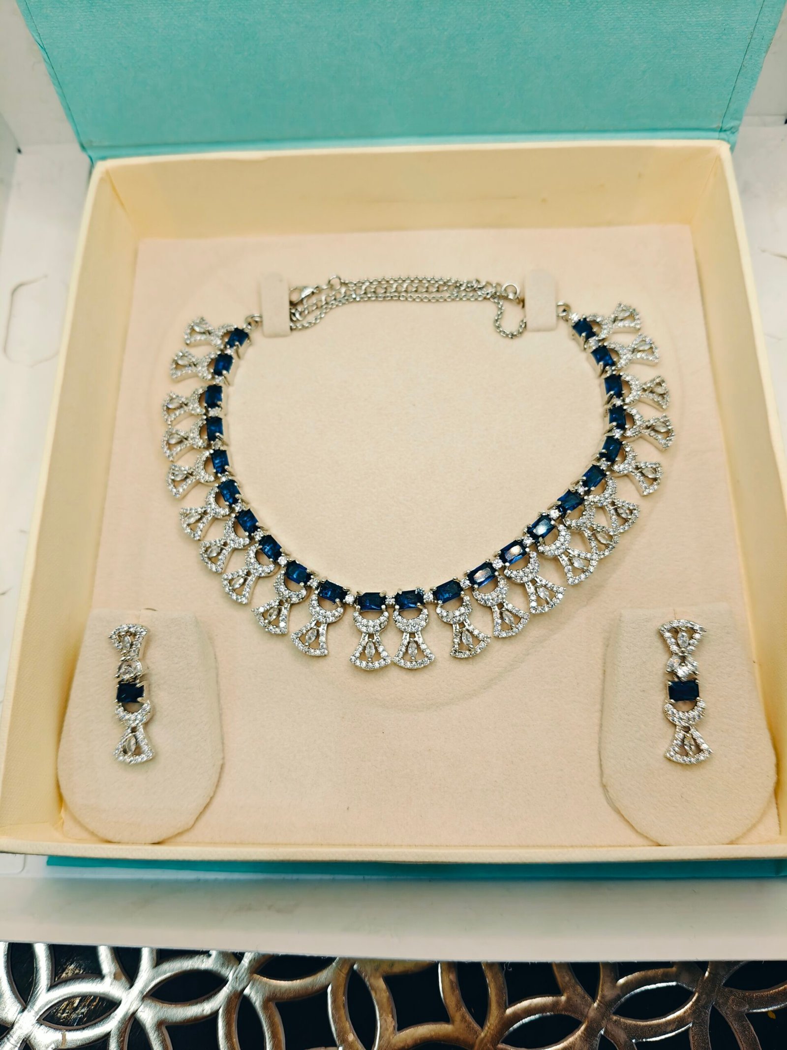 Radiate sophistication with this exquisite necklace and earring set. Featuring brilliant American Diamonds (AD) meticulously set around stunning sapphire blue cubic zirconia stones, this set offers the luxurious sparkle of real diamonds at an accessible price. The necklace boasts an elegant graduated design that sits beautifully on the neckline, complemented by perfectly matching dangle earrings. Ideal for special occasions, weddings, or adding a touch of timeless glamour to any formal attire.