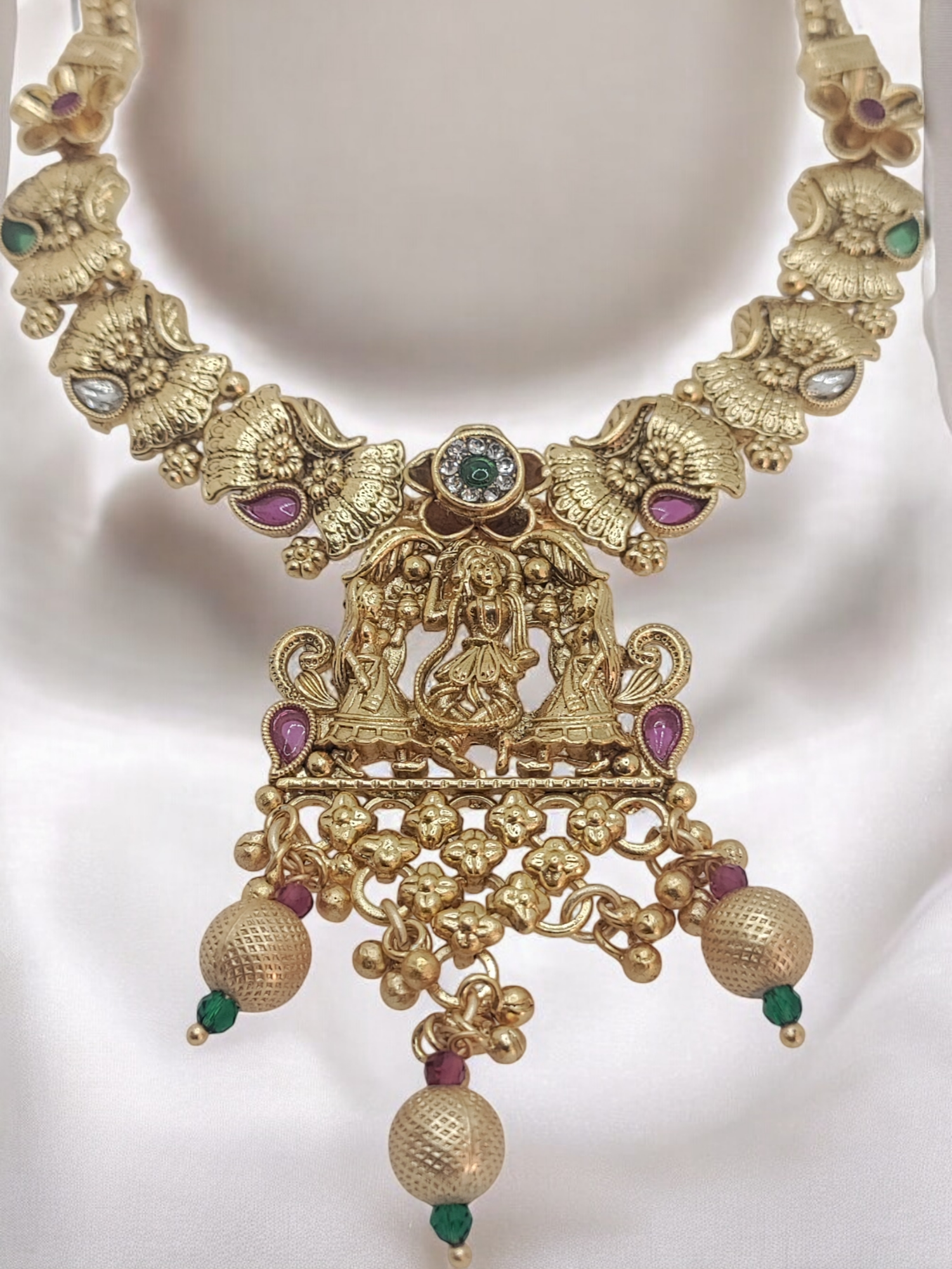 • Intricate Design: The necklace features a captivating floral motif, complemented by a central pendant showcasing Lord Krishna, symbolizing divine grace and protection.