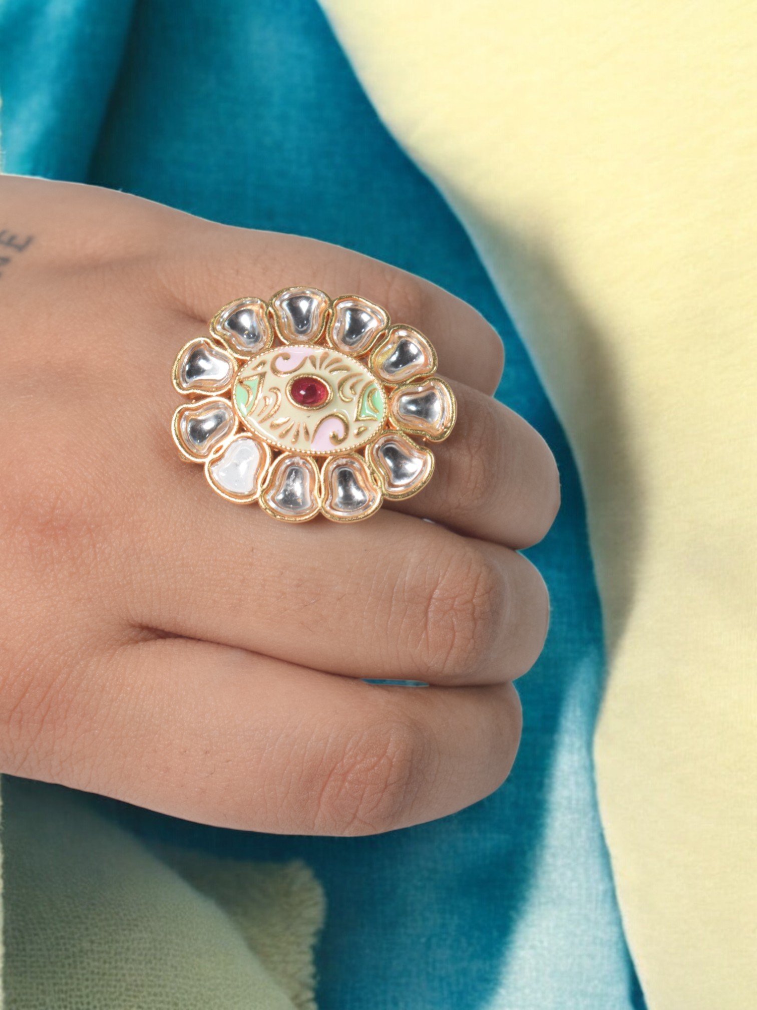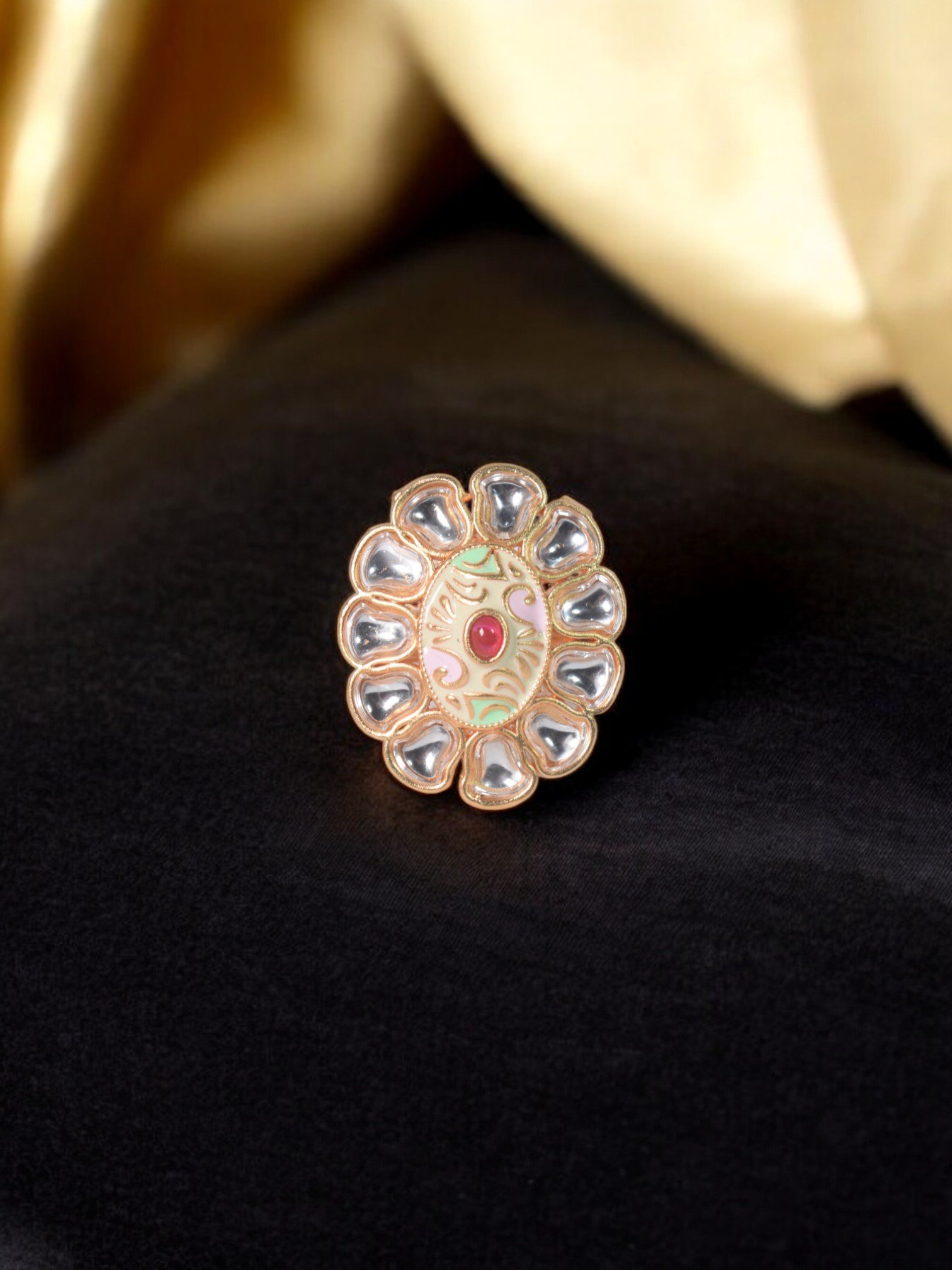 Embrace timeless elegance with this exquisite Divine Floral Kundan Ring. Featuring a delicate floral motif, this piece is adorned with luminous kundan accents and intricate enamel detailing, making it a must-have for your festive or bridal jewelry collection.