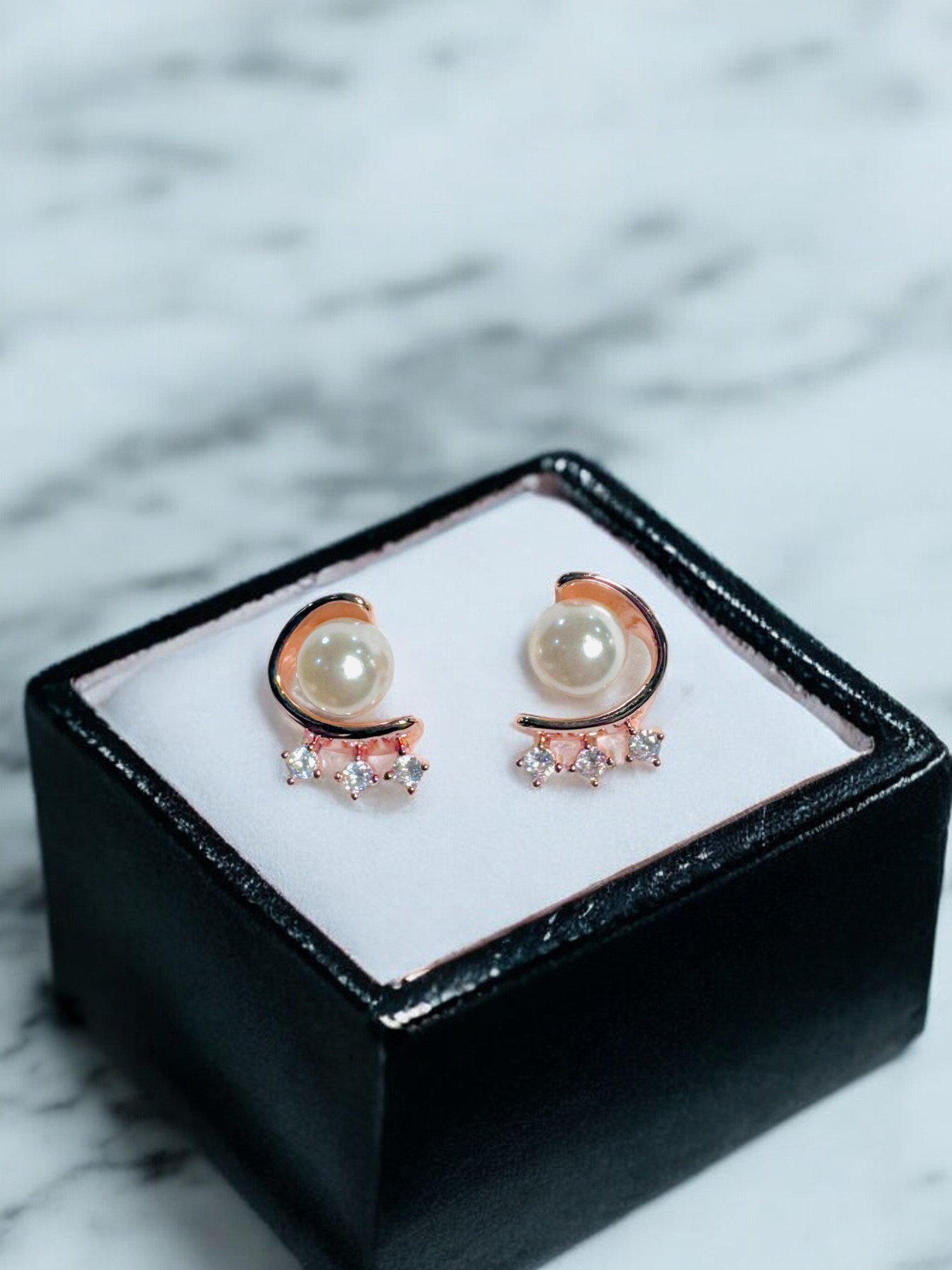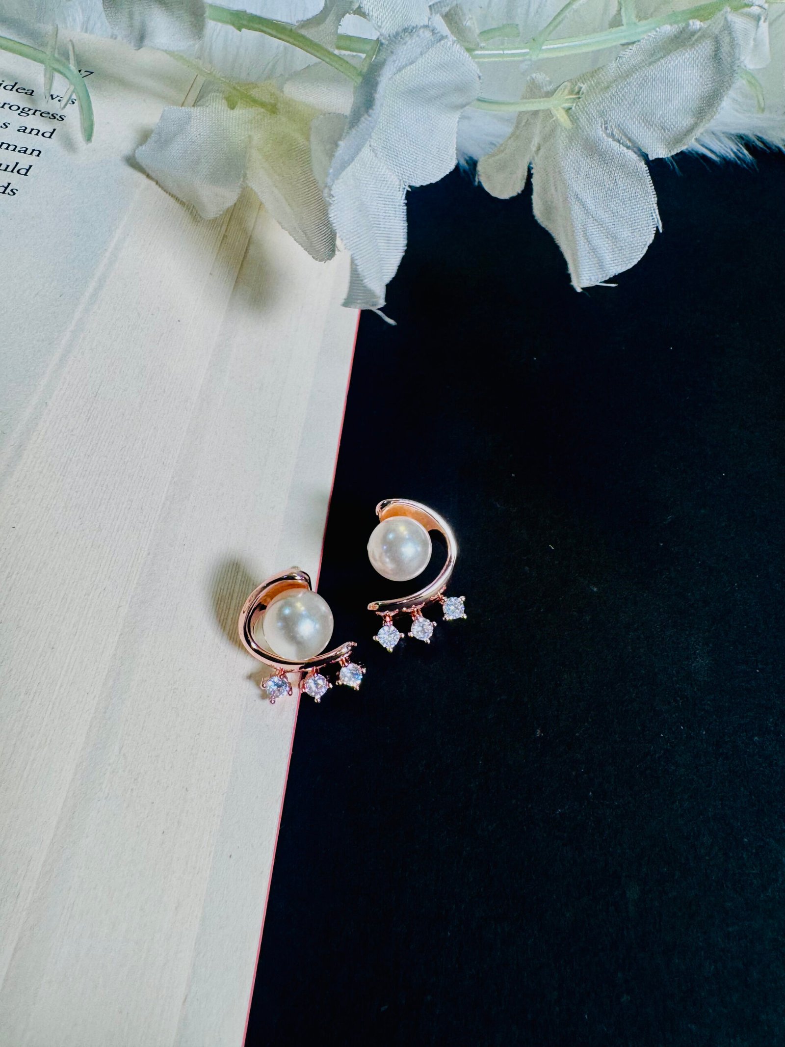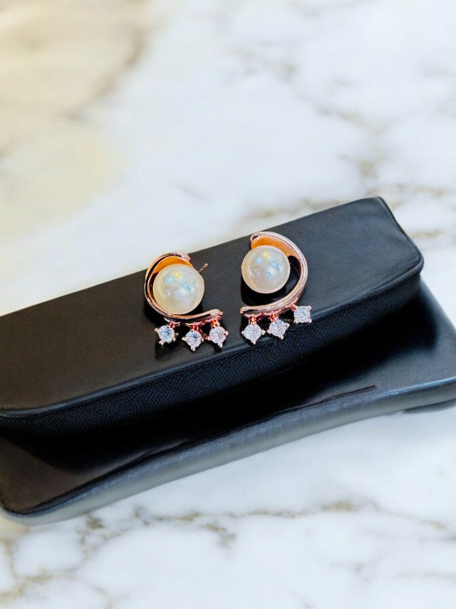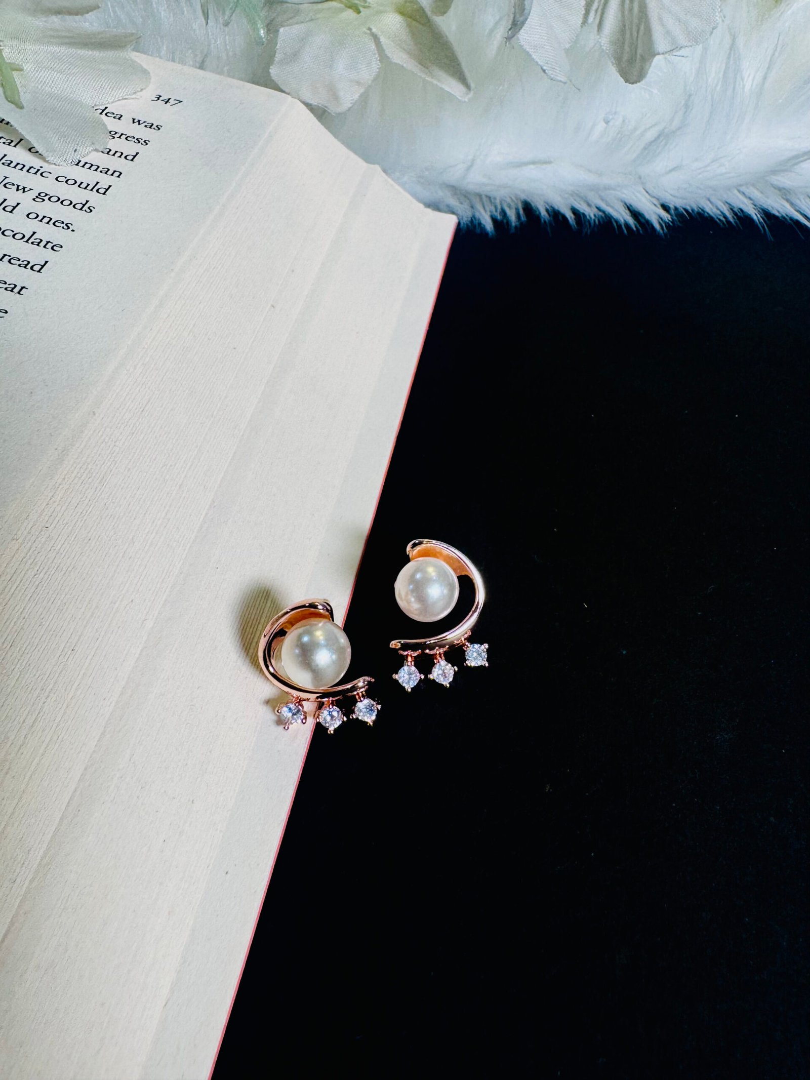 Elegant contempary design consist of a medium, lustrous pearl suspended from a curved, rose gold-toned metal wire. The wire is adorned with three sparkling clear stones that dangle gracefully below the pearl. The overall look is chic and sophisticated.