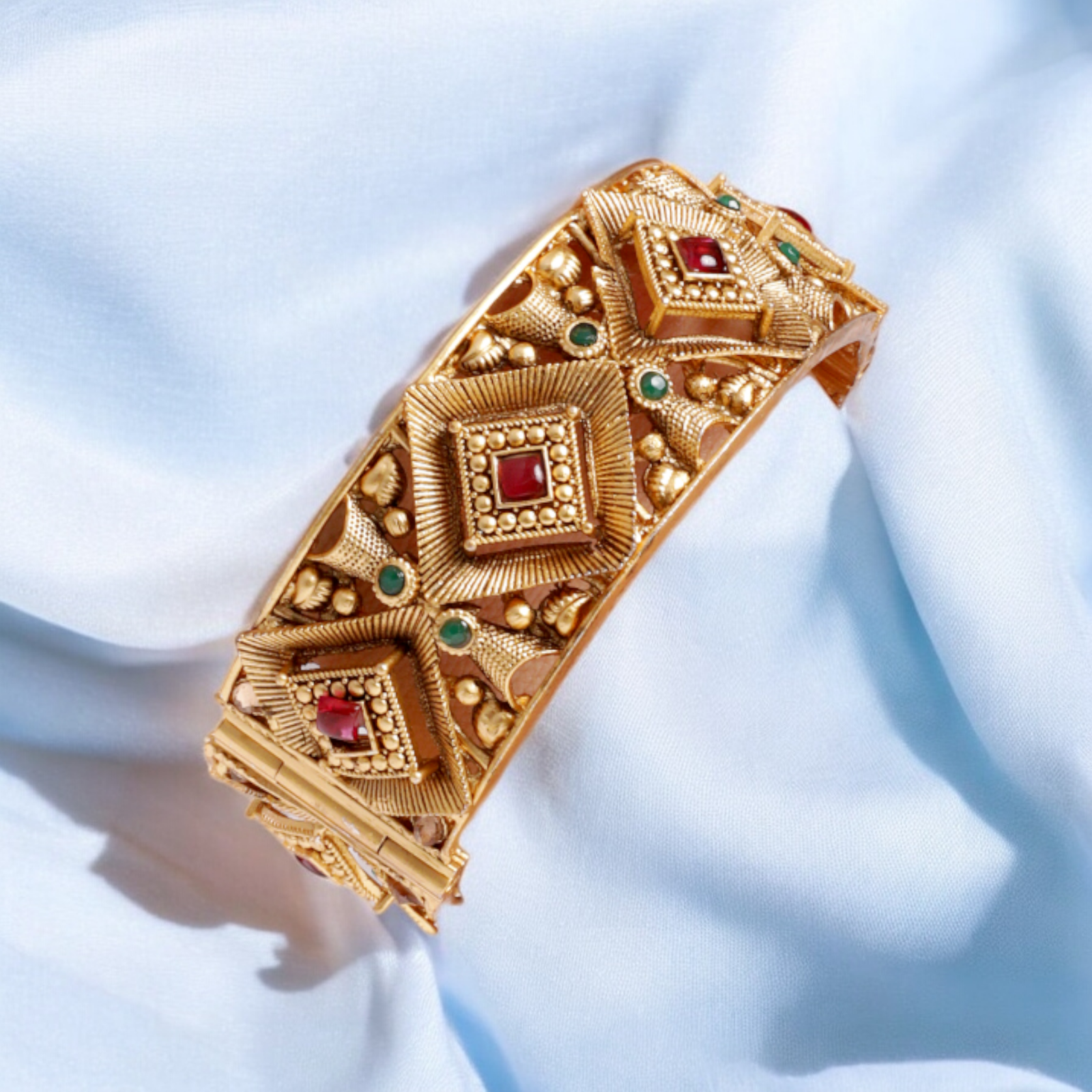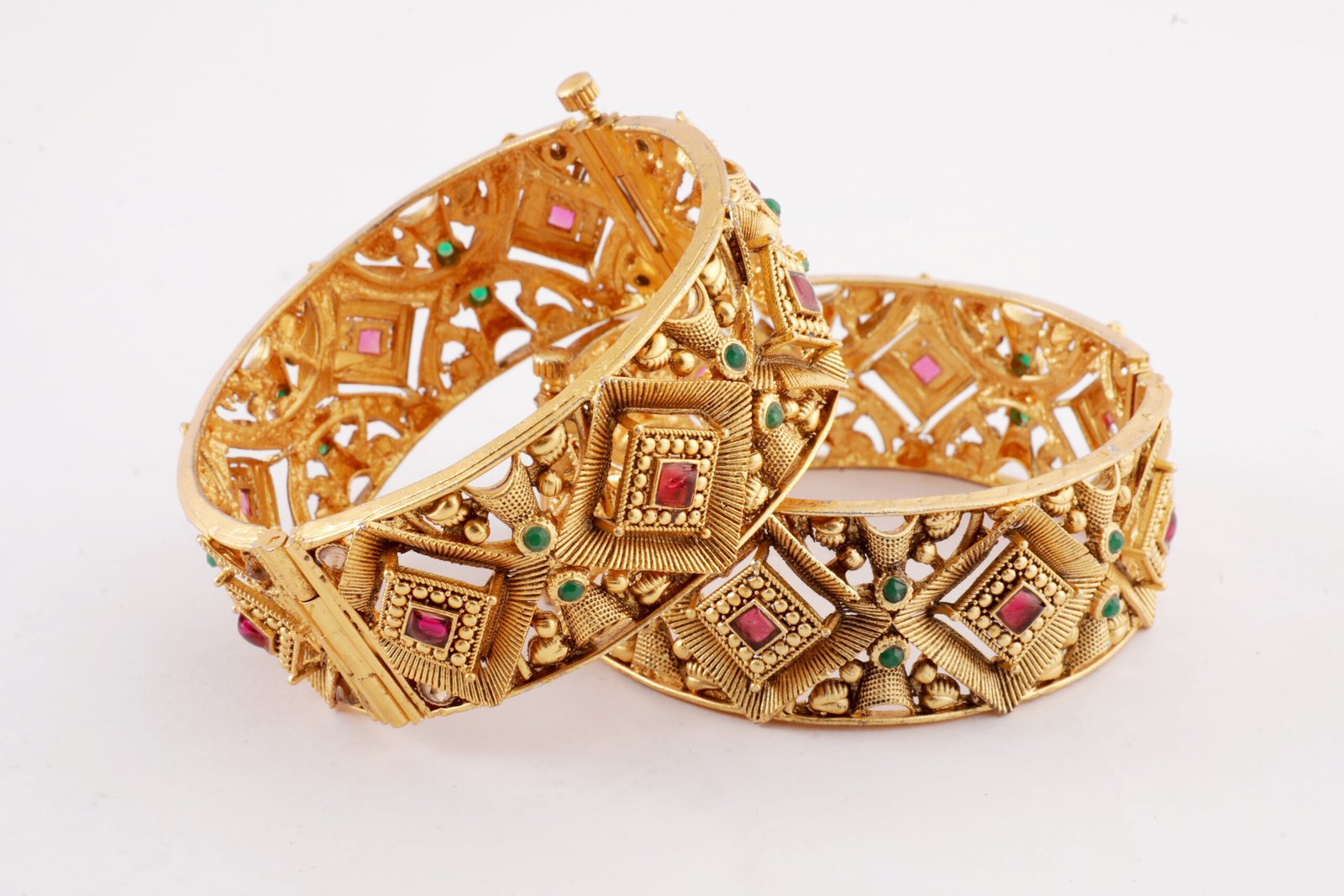 These exquisite gold bangles are perfect for adding a touch of luxury and tradition to any outfit. Crafted with intricate detailing and adorned with vibrant gemstones, these bangles are sure to make a statement. The timeless design ensures they will remain a cherished piece in your jewelry collection for years to come.