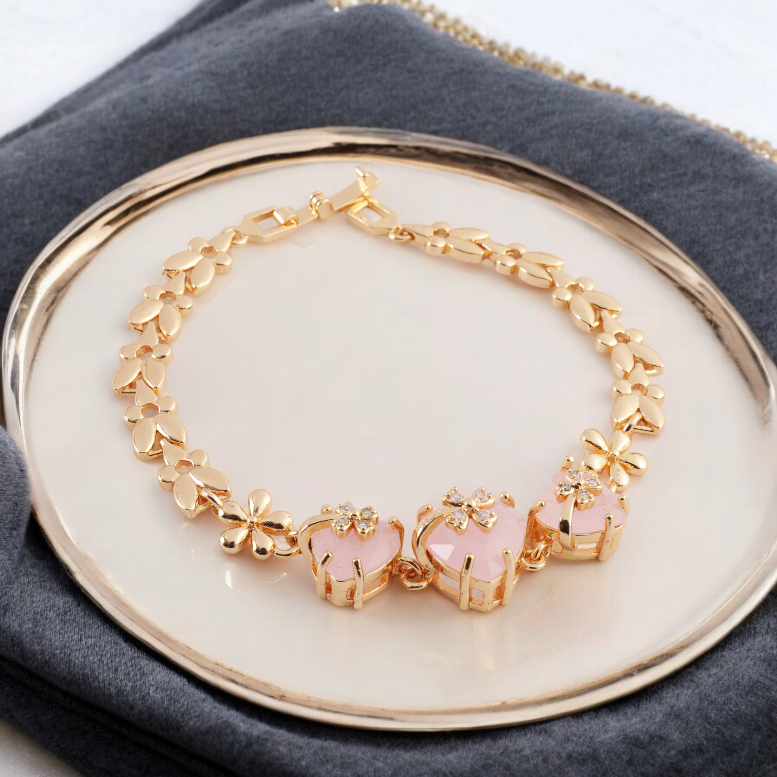 Elevate your style with this exquisite gold bracelet featuring three heart-shaped pink gemstones. The delicate leaf and flower design adds a touch of femininity and sophistication. Perfect for any occasion, this bracelet is a timeless piece that will complement your wardrobe beautifully.