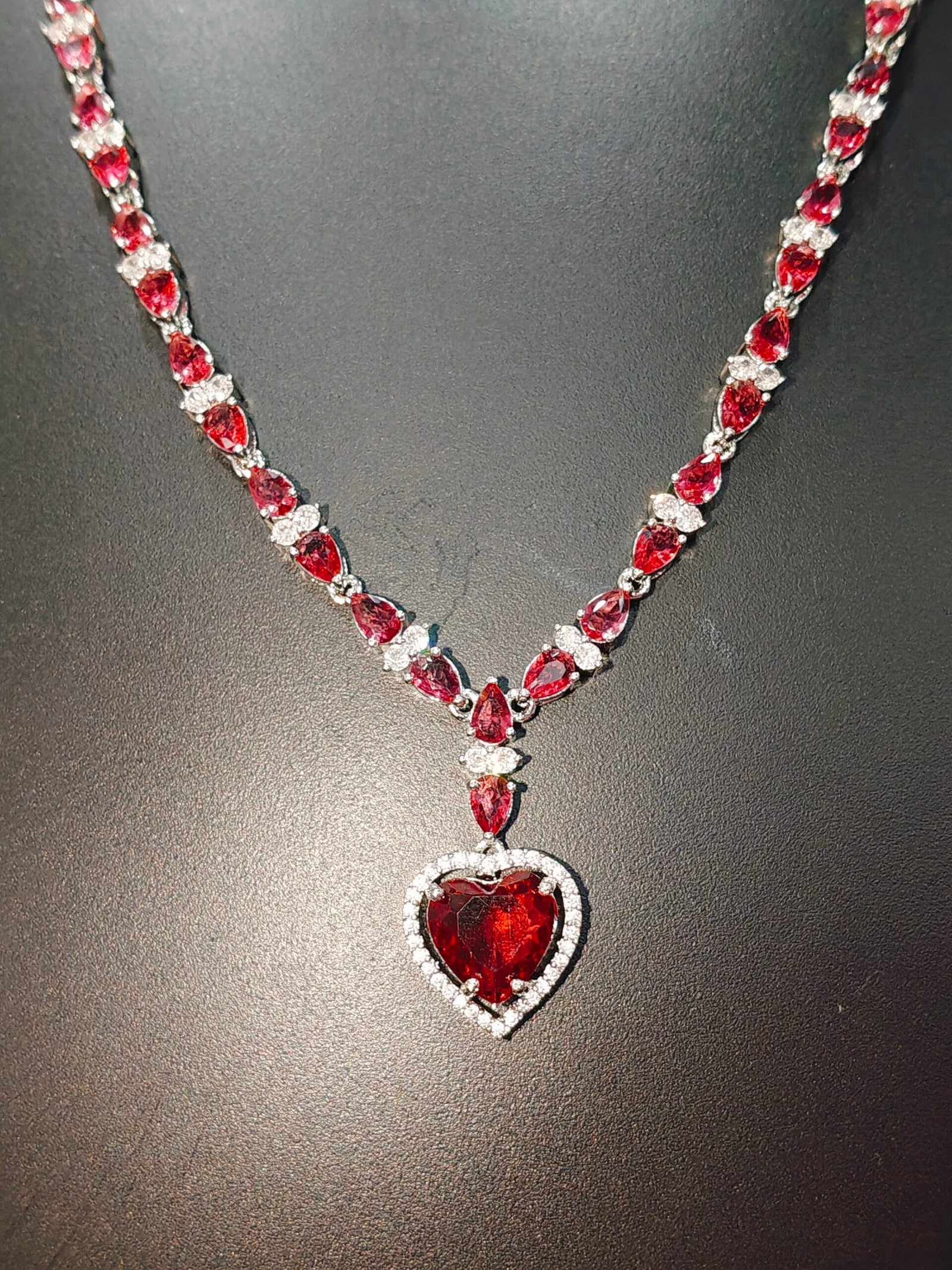 Capture hearts with the timeless elegance of our Enchanting Evermore necklace and earring set. This exquisite jewelry ensemble features a mesmerizing heart-shaped pendant and matching earrings, meticulously crafted with sparkling American Diamonds that radiate brilliance from every angle. The deep, captivating red hue of the central stones adds a touch of romance and sophistication, making it a perfect accessory for both special occasions and everyday glamour.