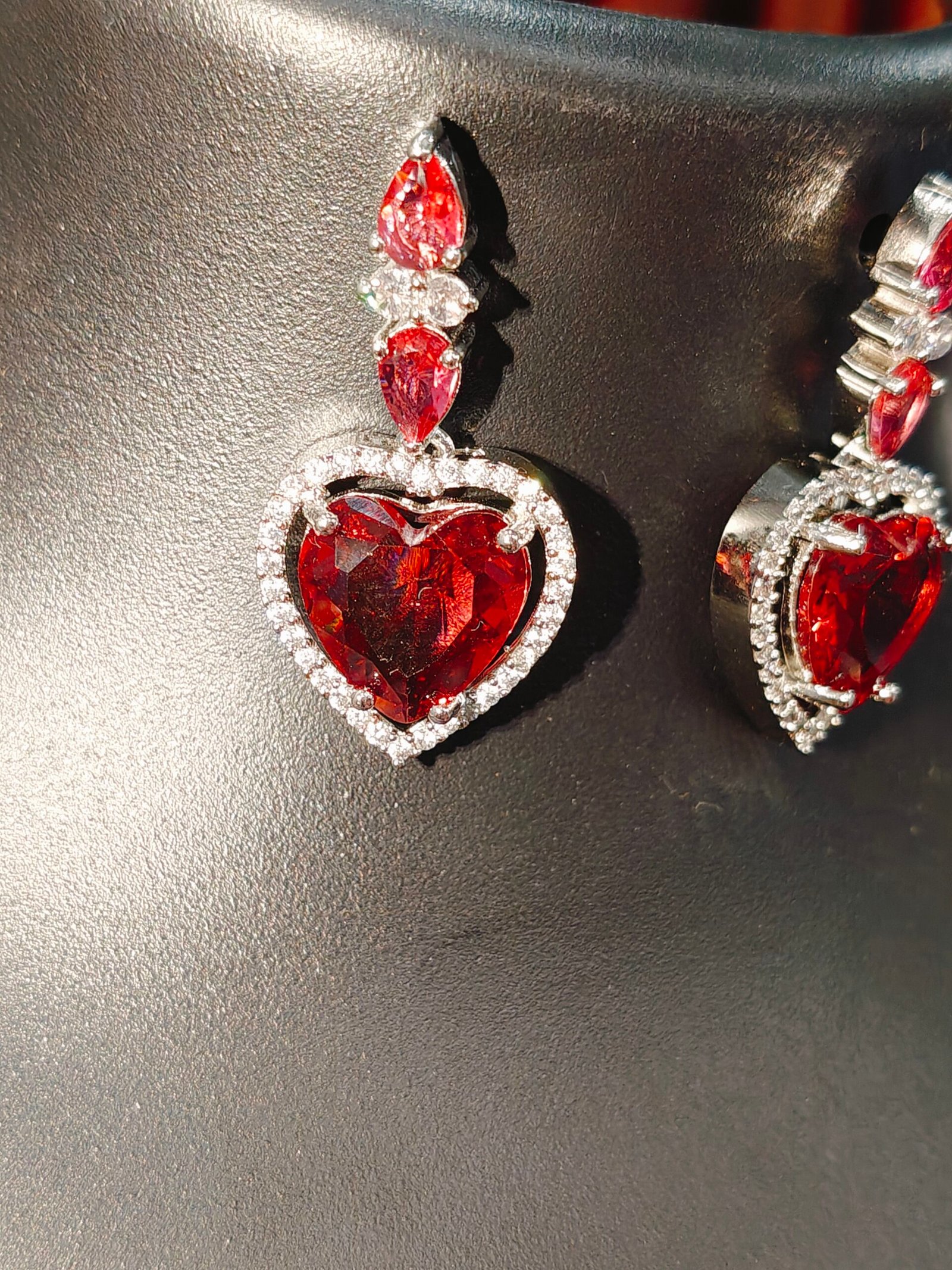 * Stones: Brilliant-cut American Diamonds (also known as Cubic Zirconia) meticulously handset to ensure maximum sparkle and brilliance. The rich red color of the central heart-shaped stones adds a captivating pop of color.