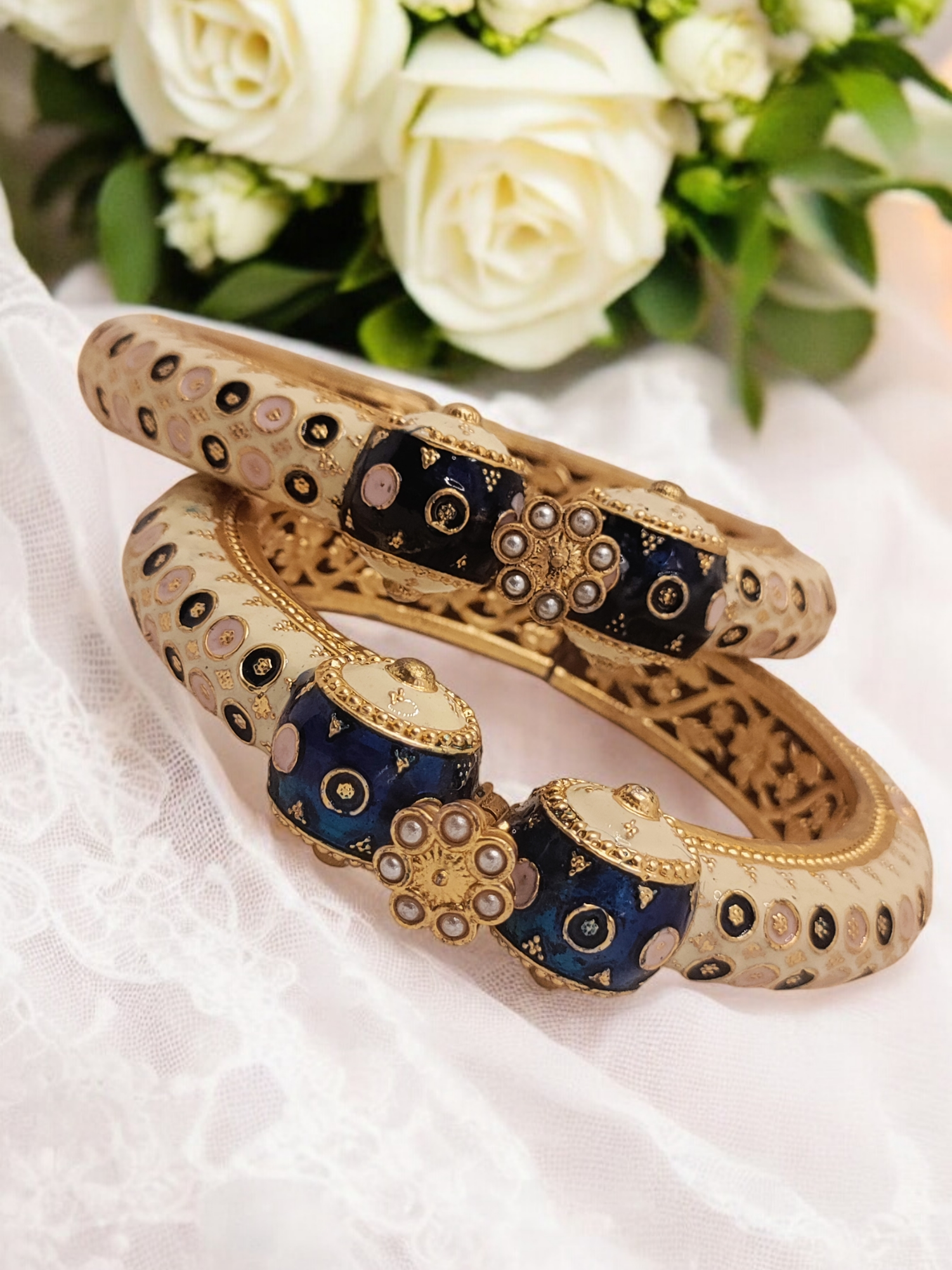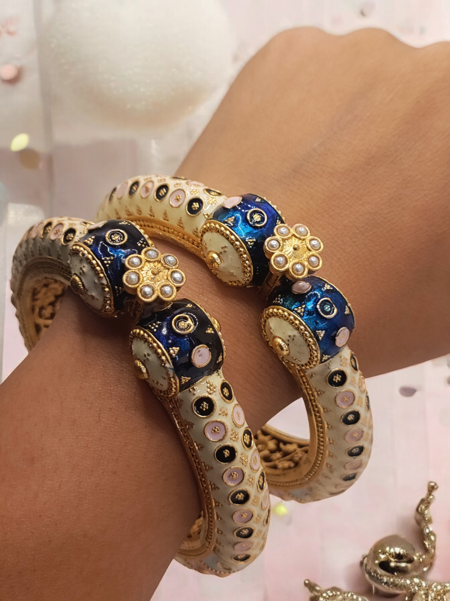 Indulge in the timeless beauty of this exquisite bangle set, designed to add a touch of elegance and tradition to any ensemble. Each bangle is meticulously crafted with a gold-plated base, featuring intricate patterns that exude a royal charm.