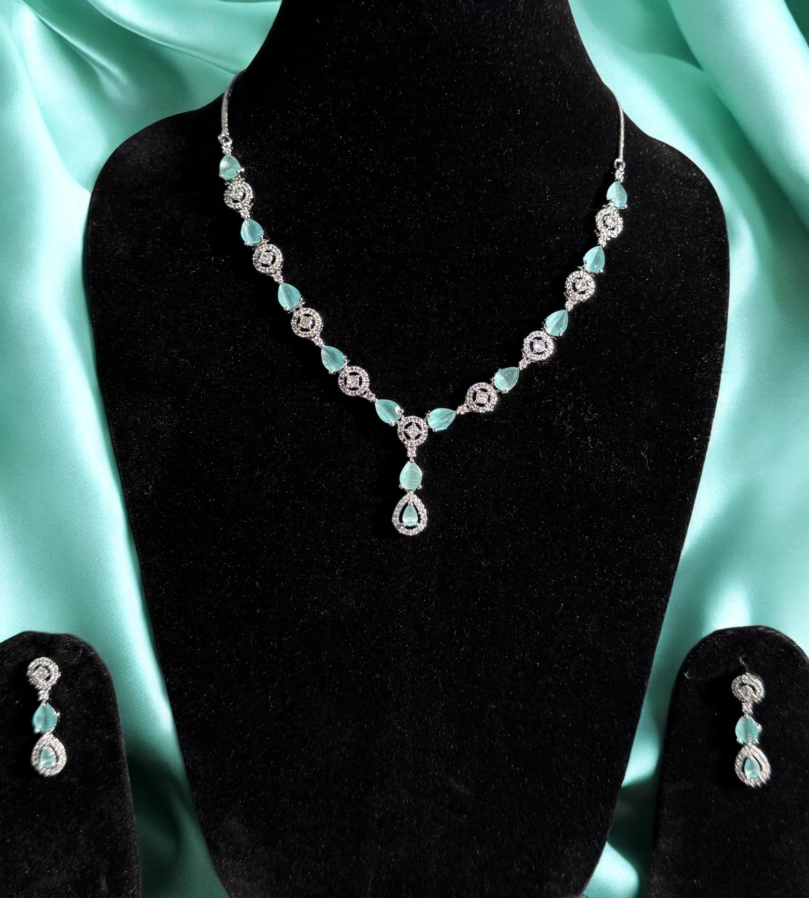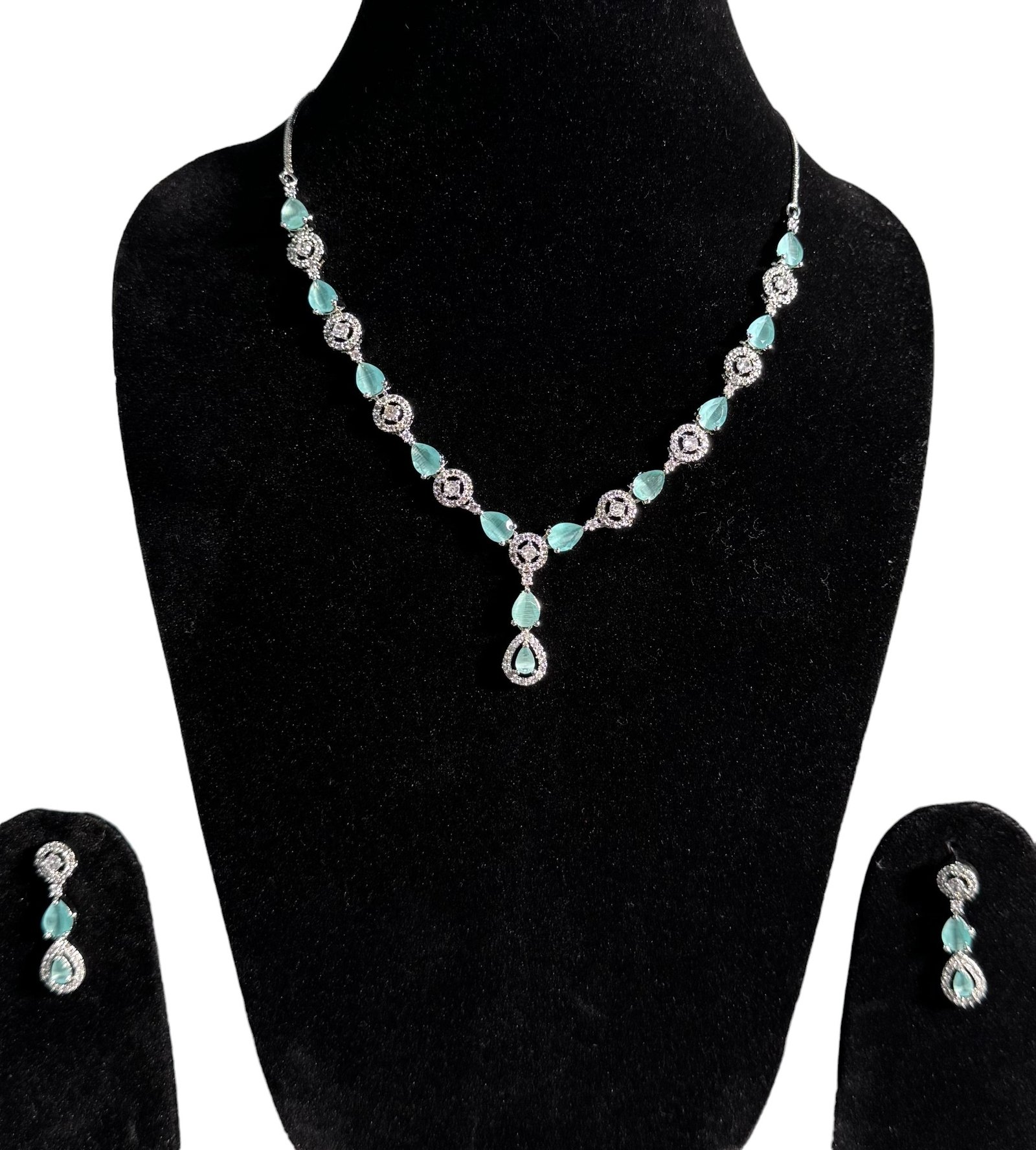 AD Single line necklace set in silver with alternate turquoise and clear cyrstals