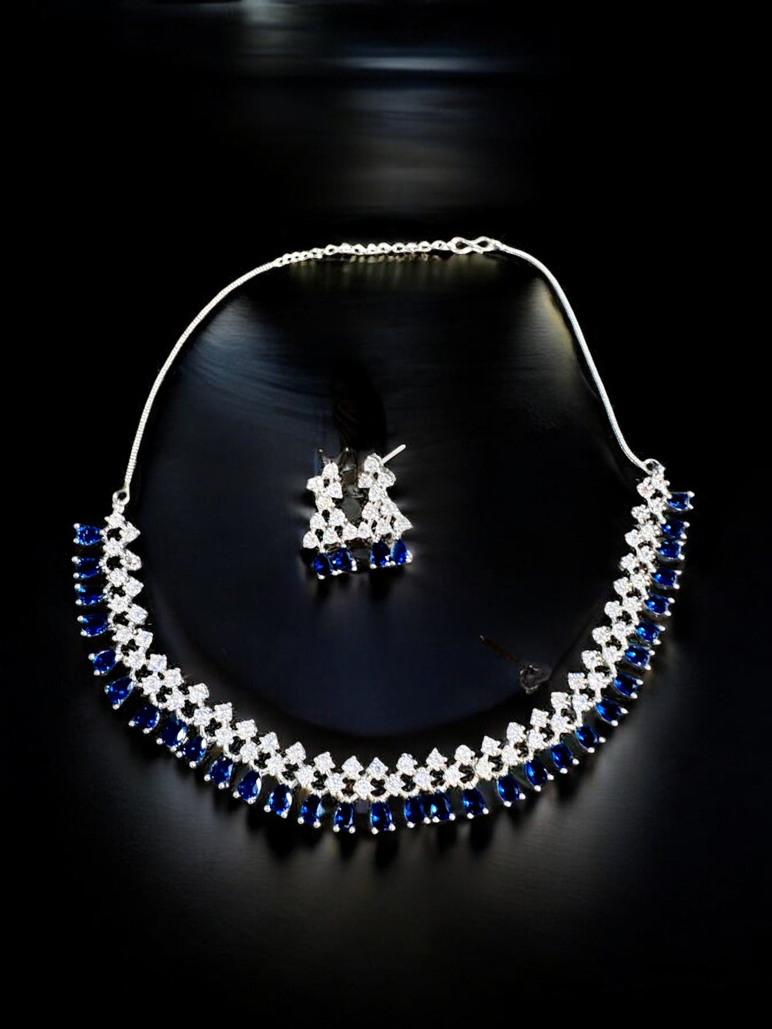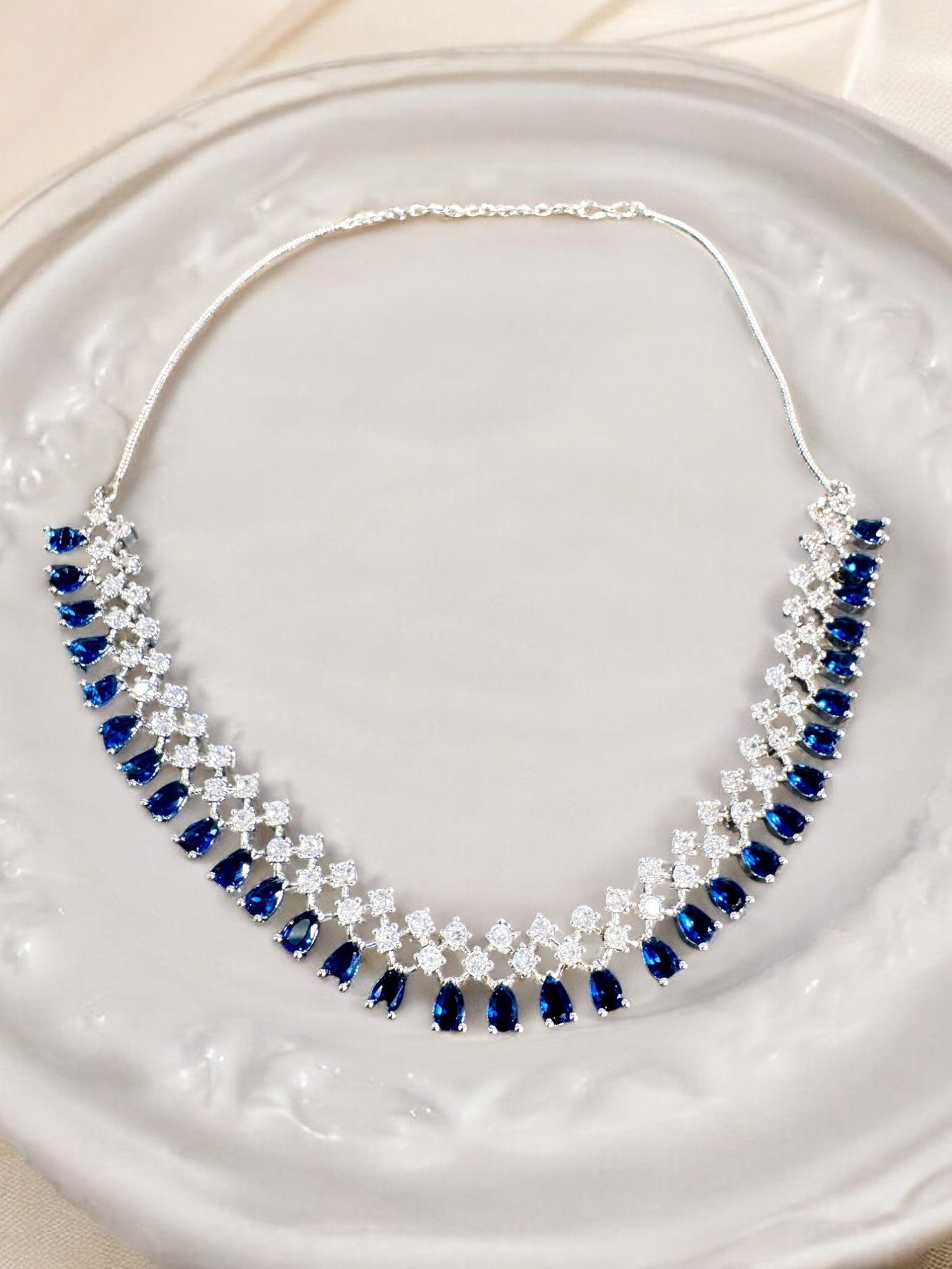 AD silver necklace set with double row of alternate blue and clear cystals