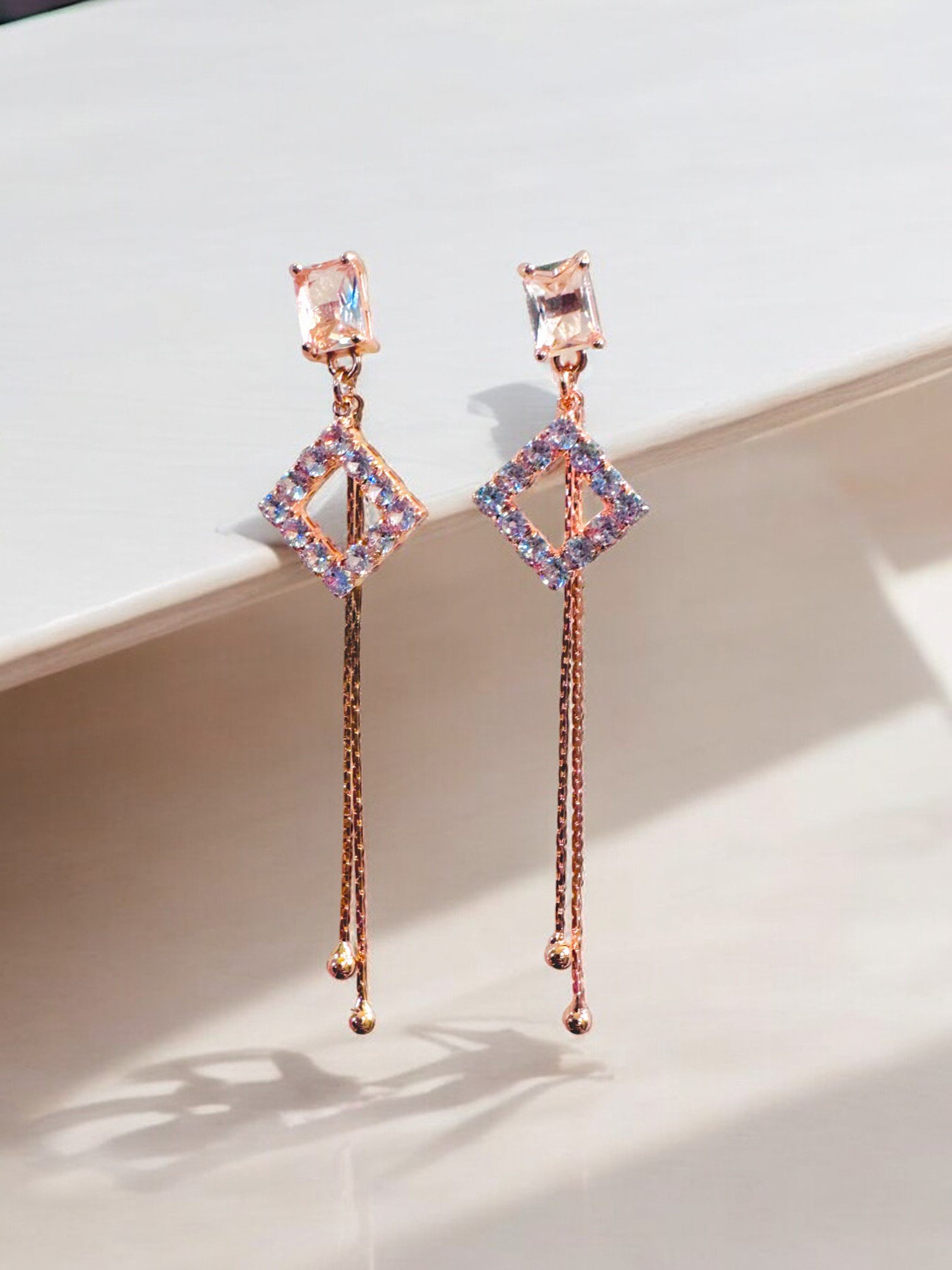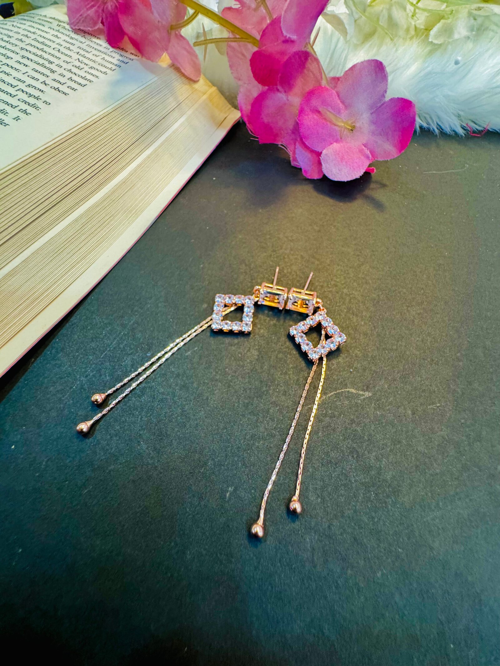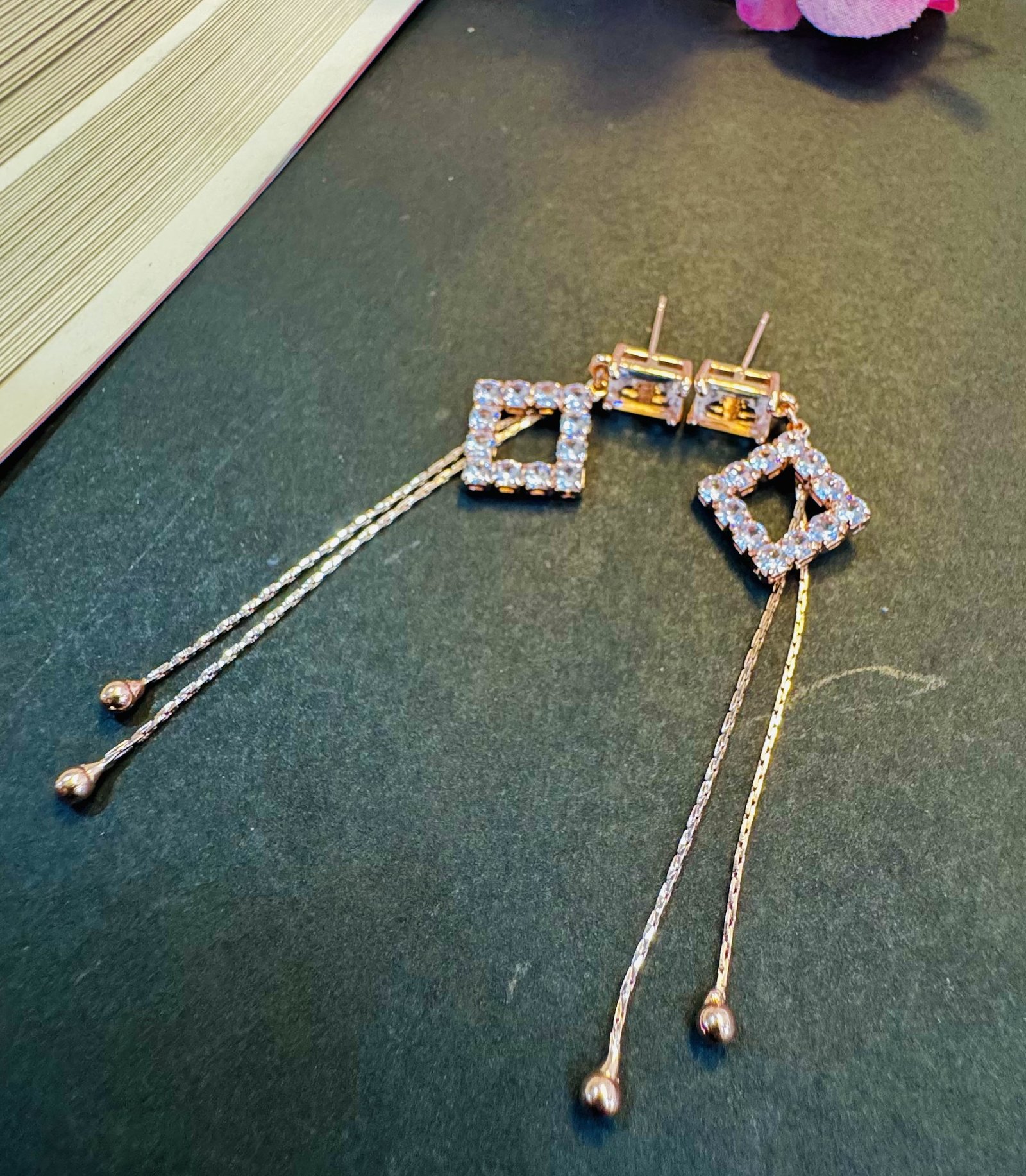 These earrings are delicate and elegant with a modern twist. They feature a square-shaped design with a sparkling square-cut stone at the top, dangling gracefully from a thin chain adorned with tiny beads. The earrings have a minimalist aesthetic with a touch of sparkle, making them versatile for both casual and formal occasions. Color: Rose Gold Size: 7CM Approx. Everyday wear or house parties