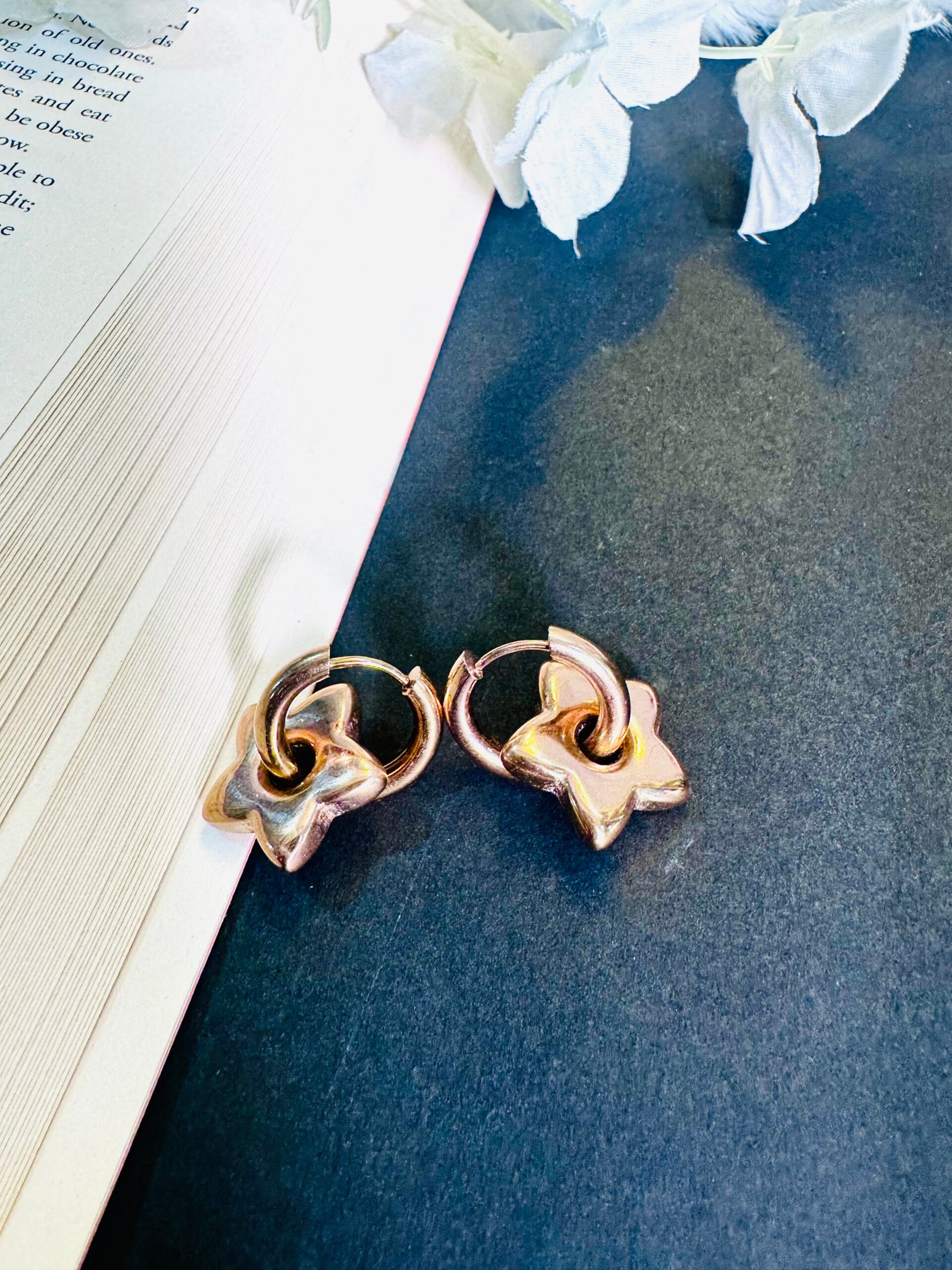 The design is versatile and can be paired with both casual and dressy outfits. they consist of two gold-toned star-shaped charms suspended from thin, circular hoops. The star charms have a slightly textured surface, adding depth and visual interest. The overall look is chic and contemporary.