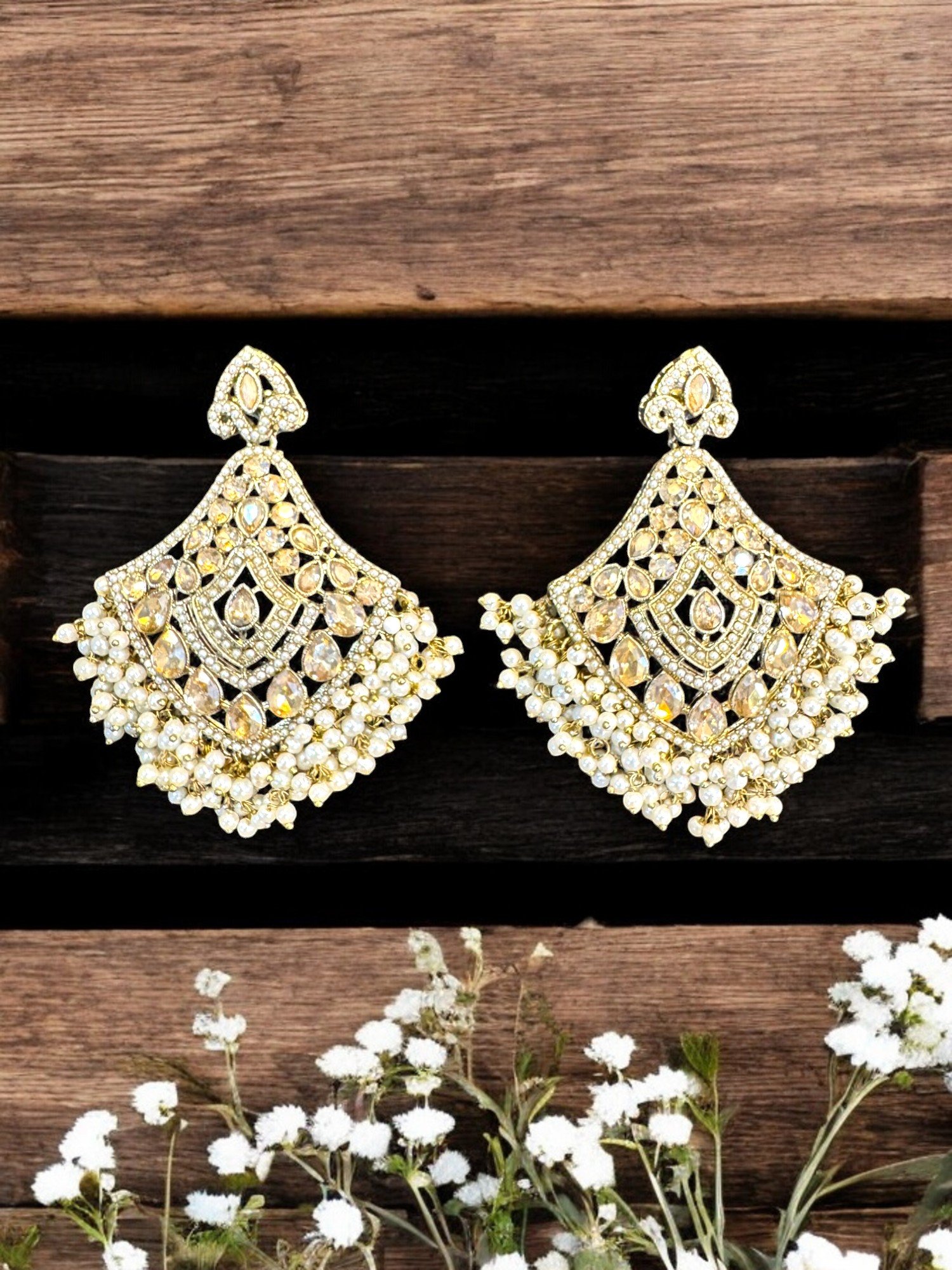 These exquisite jhumkas and maang tikka are crafted with high-quality pearls and adorned with sparkling kundan stones. The multi-layered designs and intricate detailing create a timeless and elegant look.