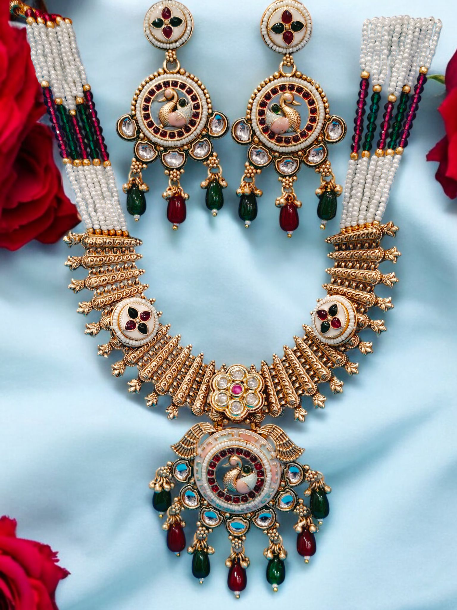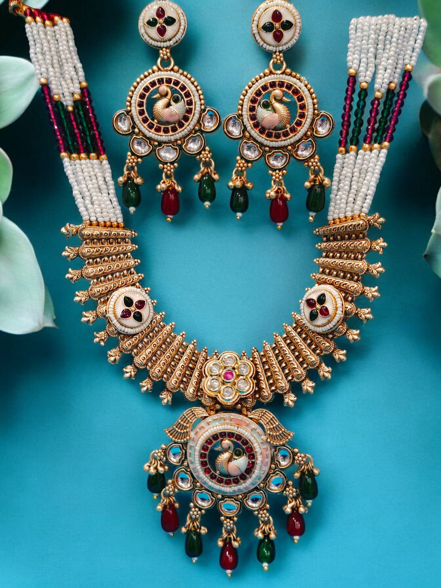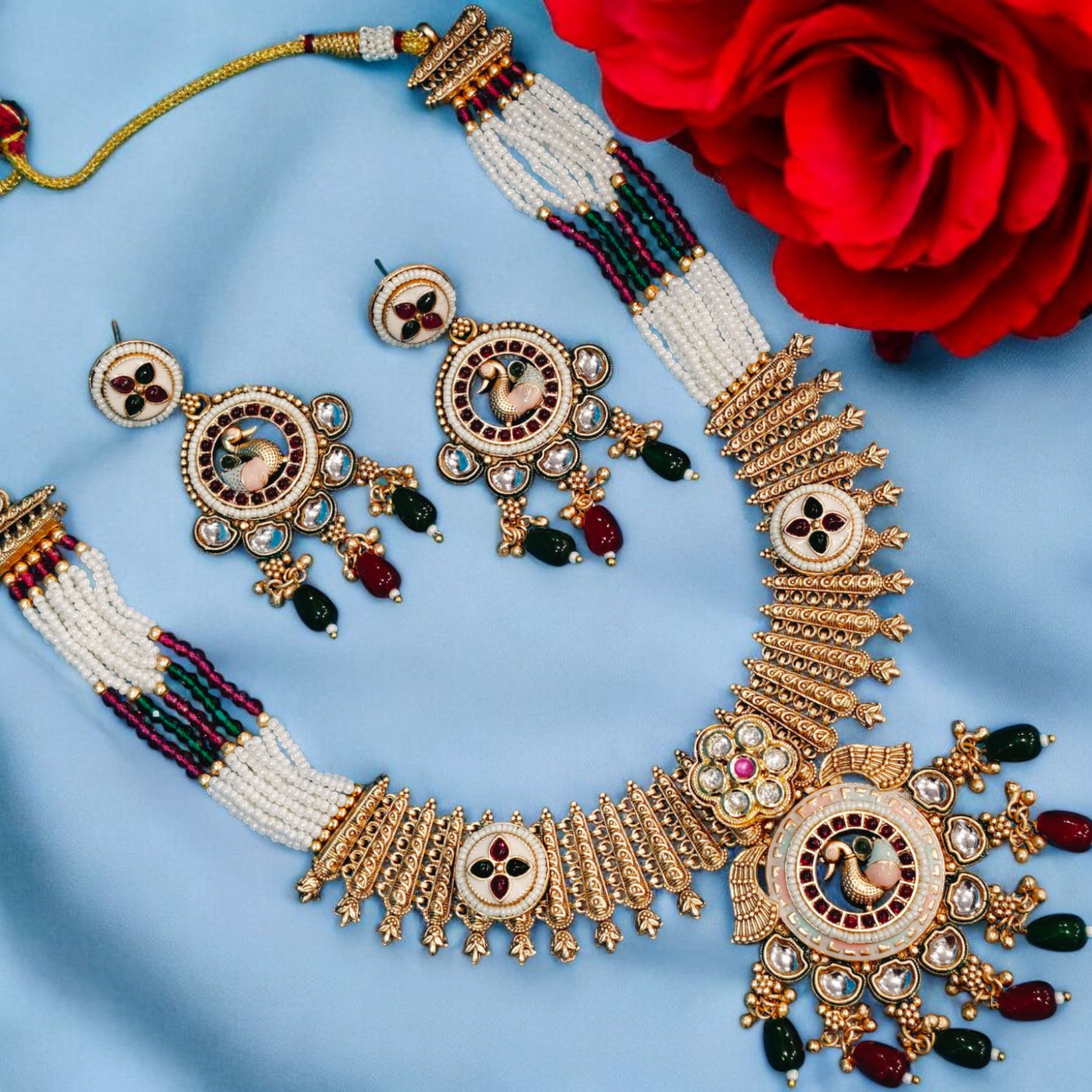* Peacock Motifs: The necklace features captivating peacock motifs, symbolizing beauty, grace, and prosperity. The peacocks are adorned with delicate Kundan stones and enamel work, adding a touch of majestic allure.