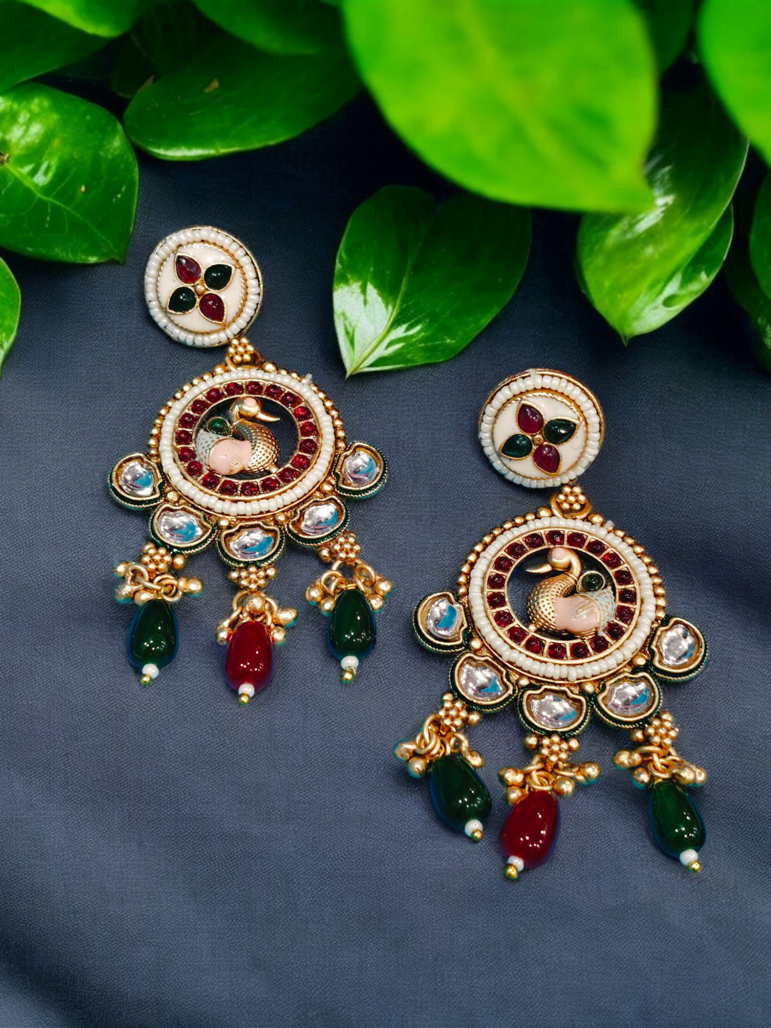 * Statement Earrings: The matching earrings perfectly complement the necklace, featuring smaller yet equally detailed peacock motifs and pearl drops, completing the traditional look.