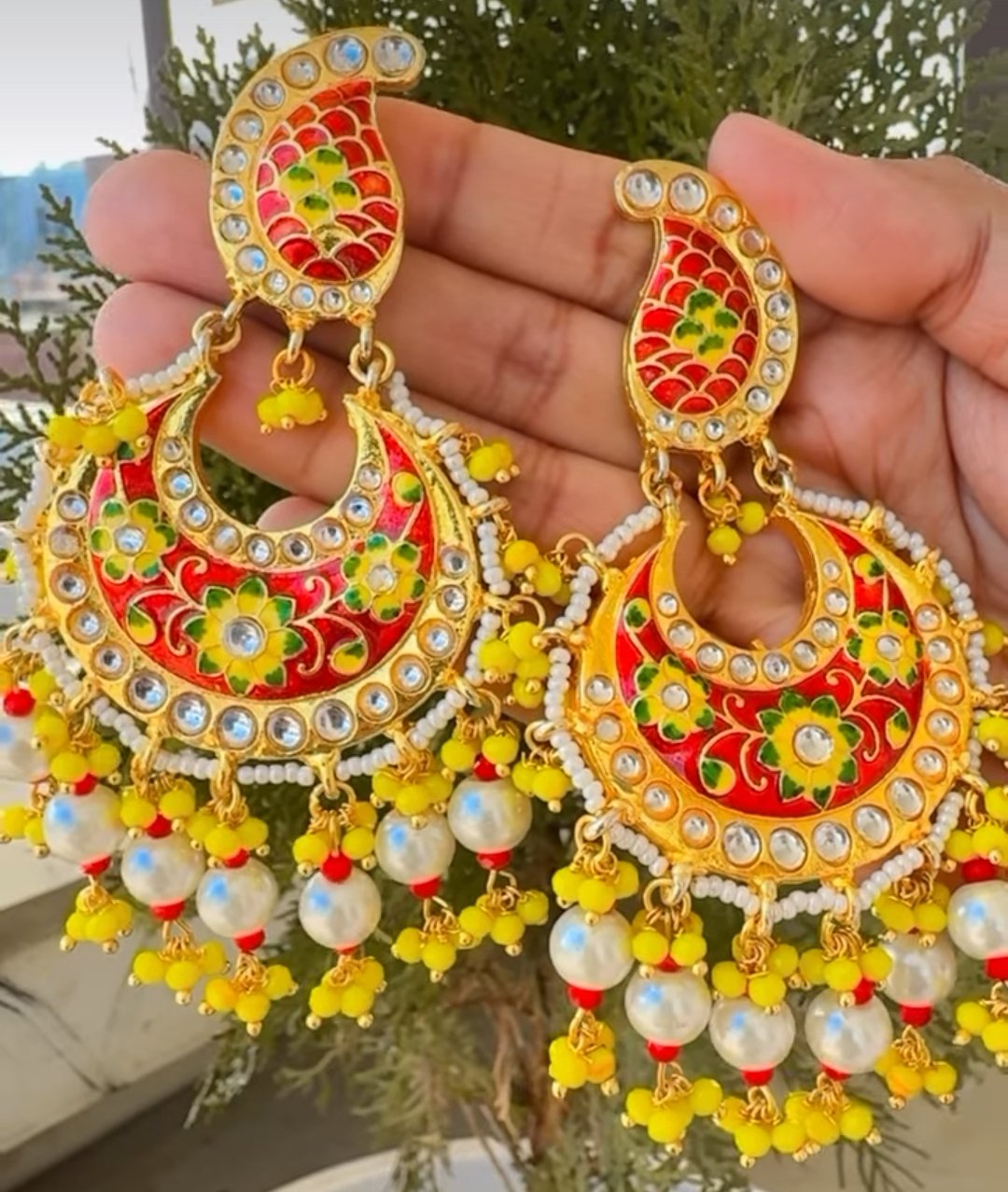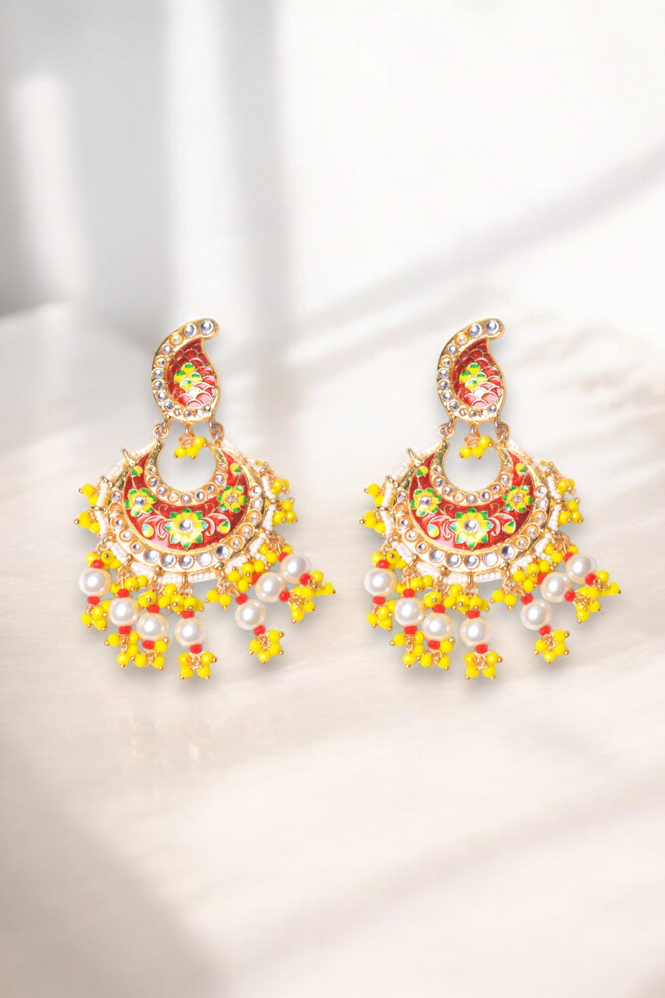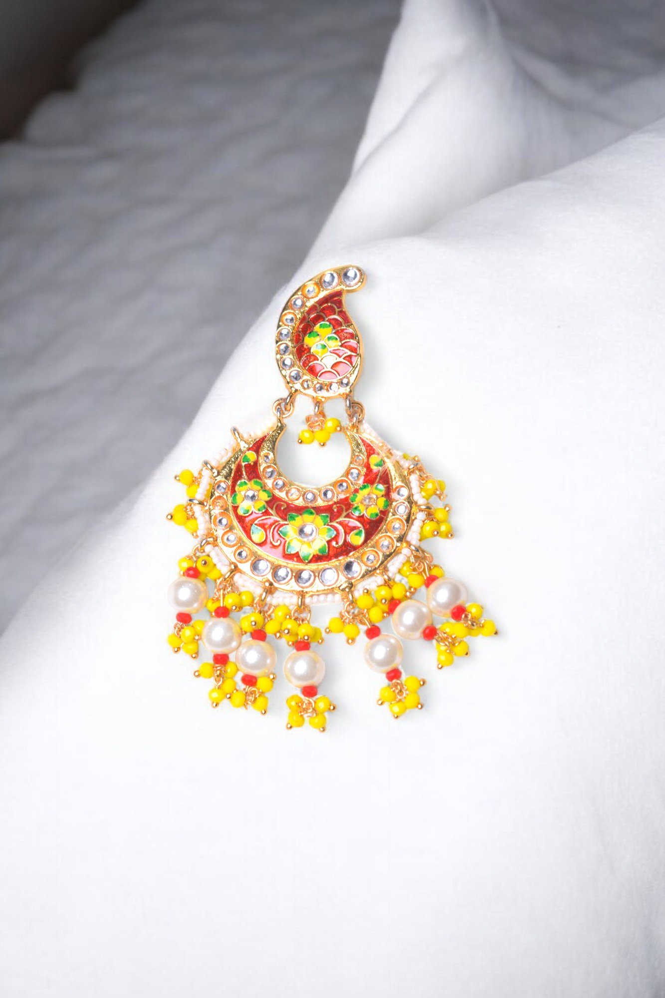 Inspired by the grandeur of Mughal era, these Chandbali earrings are a masterpiece of craftsmanship. The intricate gold-toned metalwork is adorned with vibrant red and yellow enamel work, creating a stunning visual contrast. The delicate pearls and intricate detailing add a touch of elegance and sophistication. These statement earrings are perfect for special occasions and will make you the center of attention.