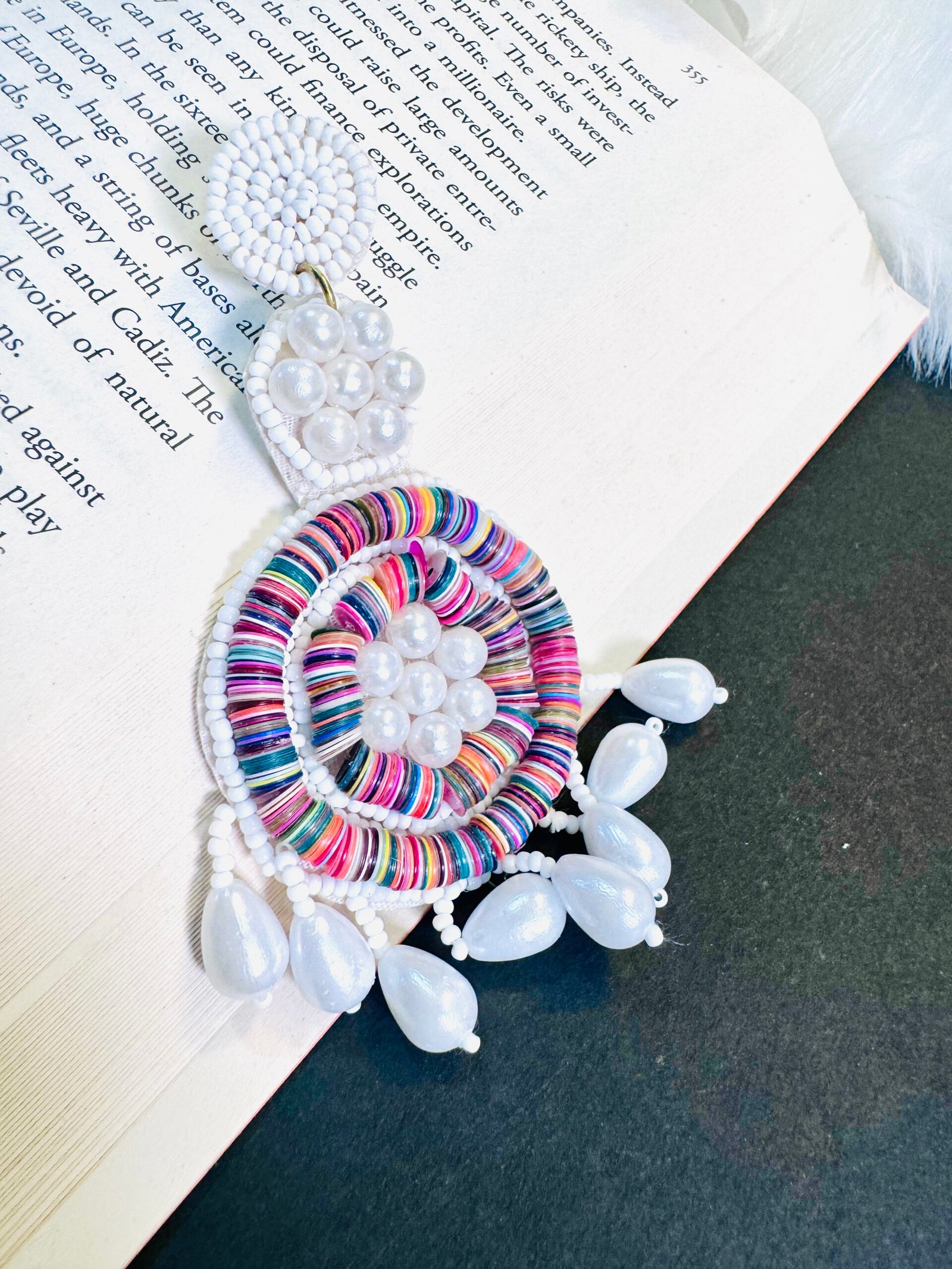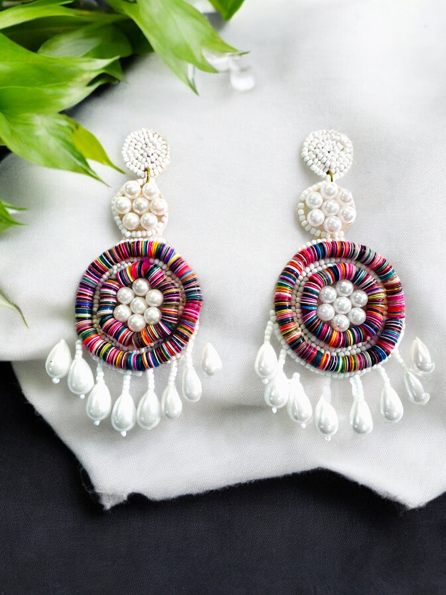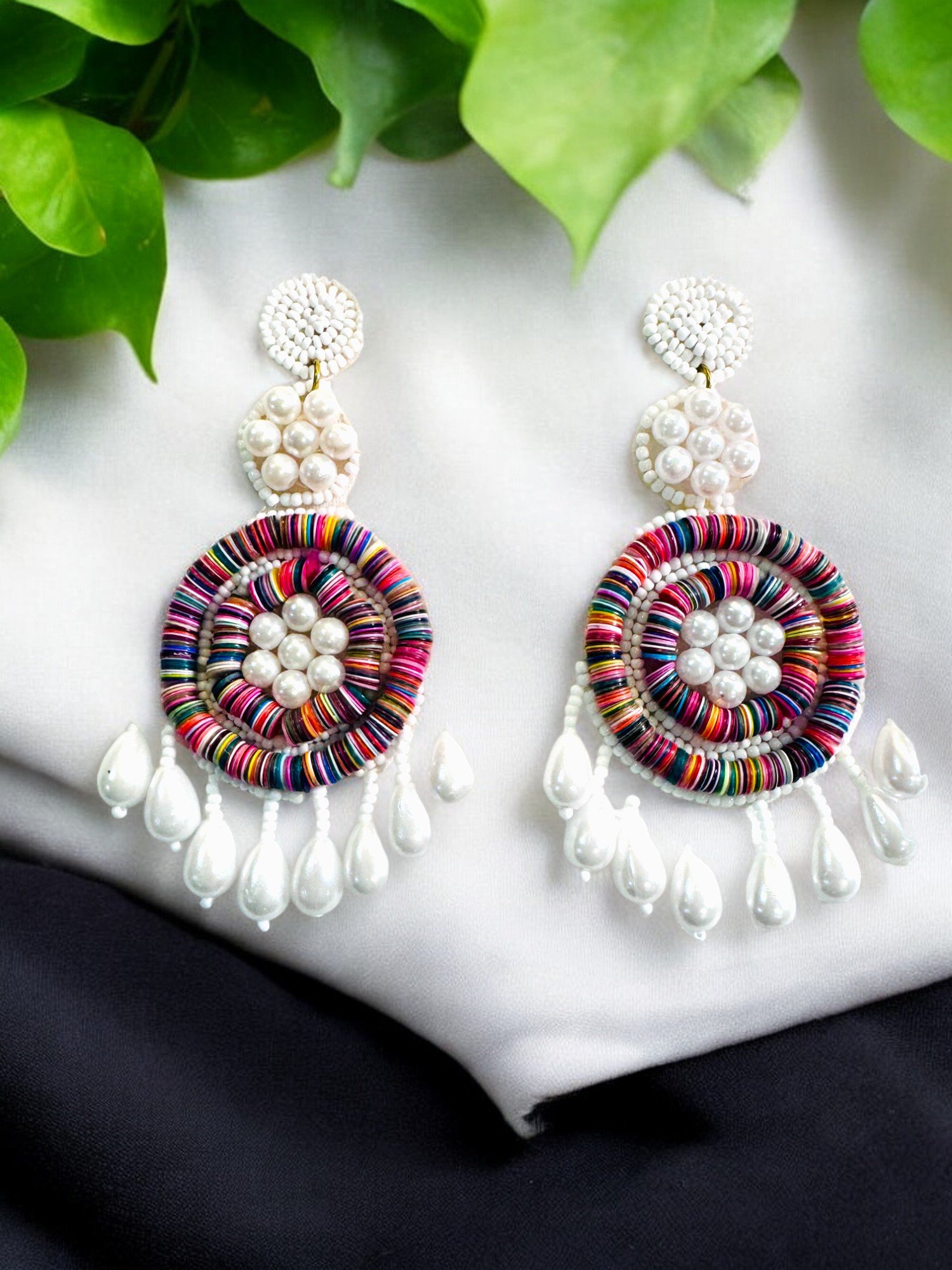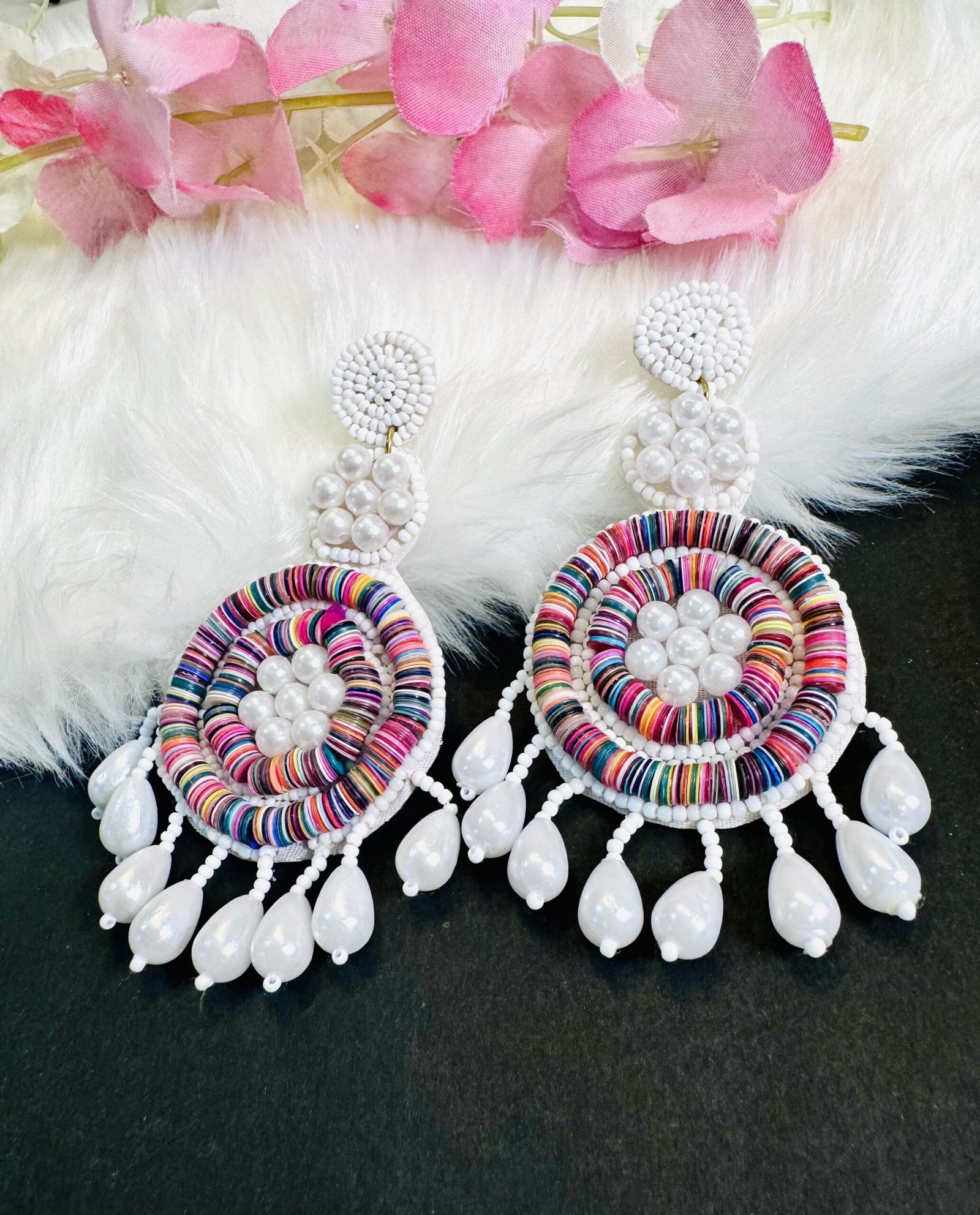 These handmade earrings are a vibrant and playful statement piece. They feature a large, colorful flower design in the center, crafted with multicolored beads. The flower petals have a woven texture, adding depth and dimension. Below the flower, a cascade of white pearls adorns the earrings, creating a beautiful contrast. The overall design is eye-catching and adds a touch of boho-chic style. The earrings are lightweight due to the bead construction. The color palette is versatile and can complement various outfits.Color: Multicolor; Size 3.5 Inc approx.