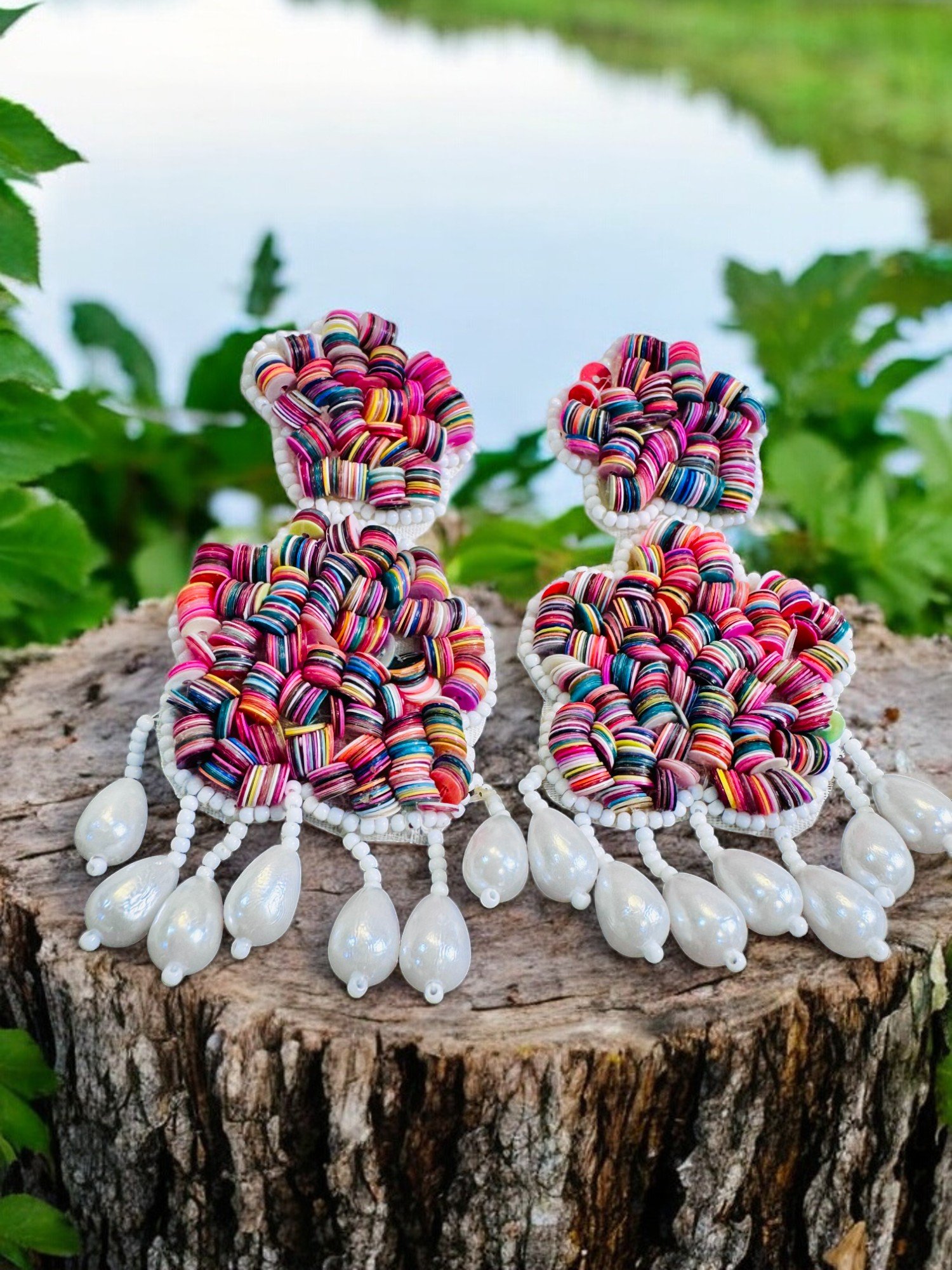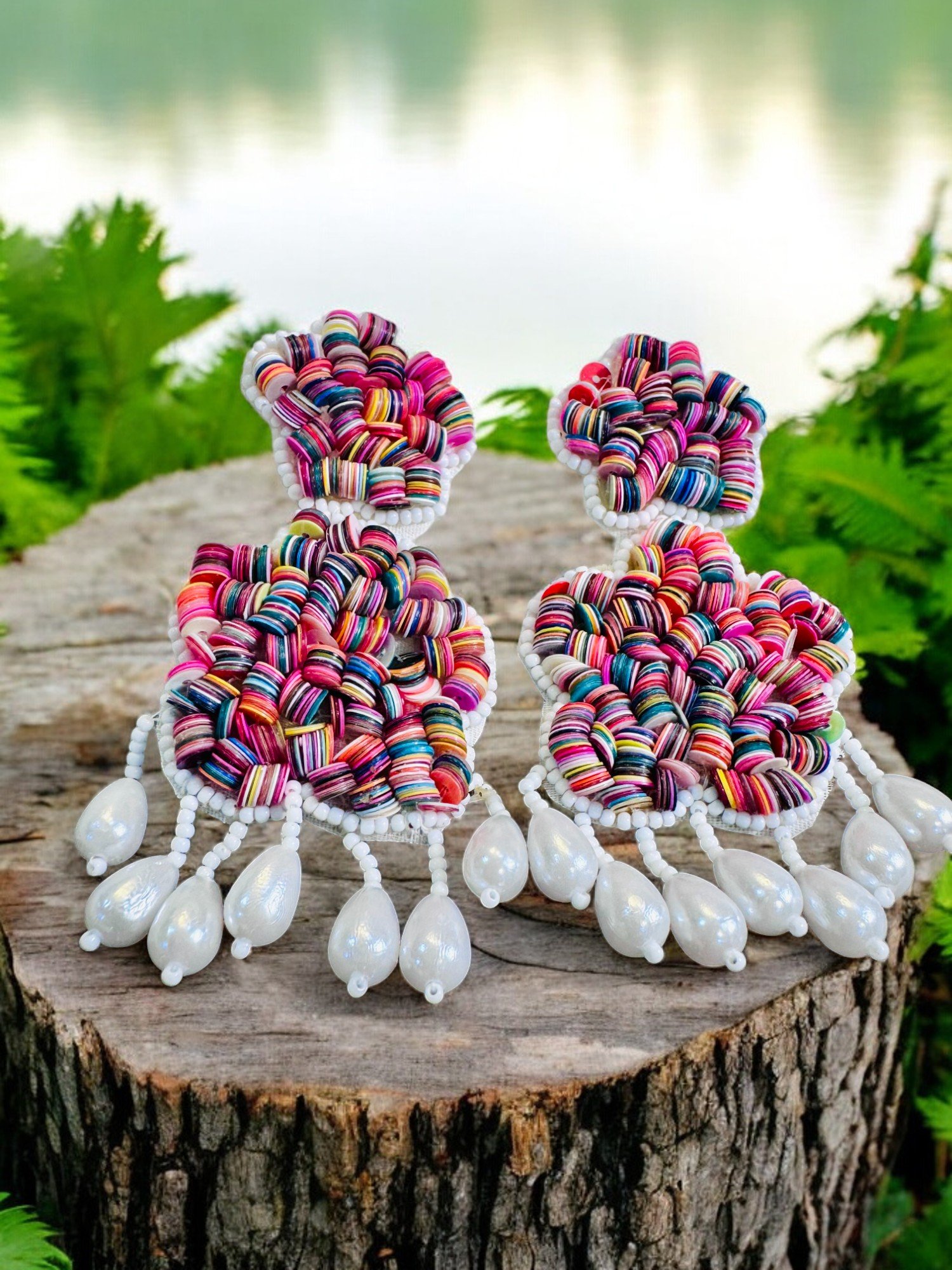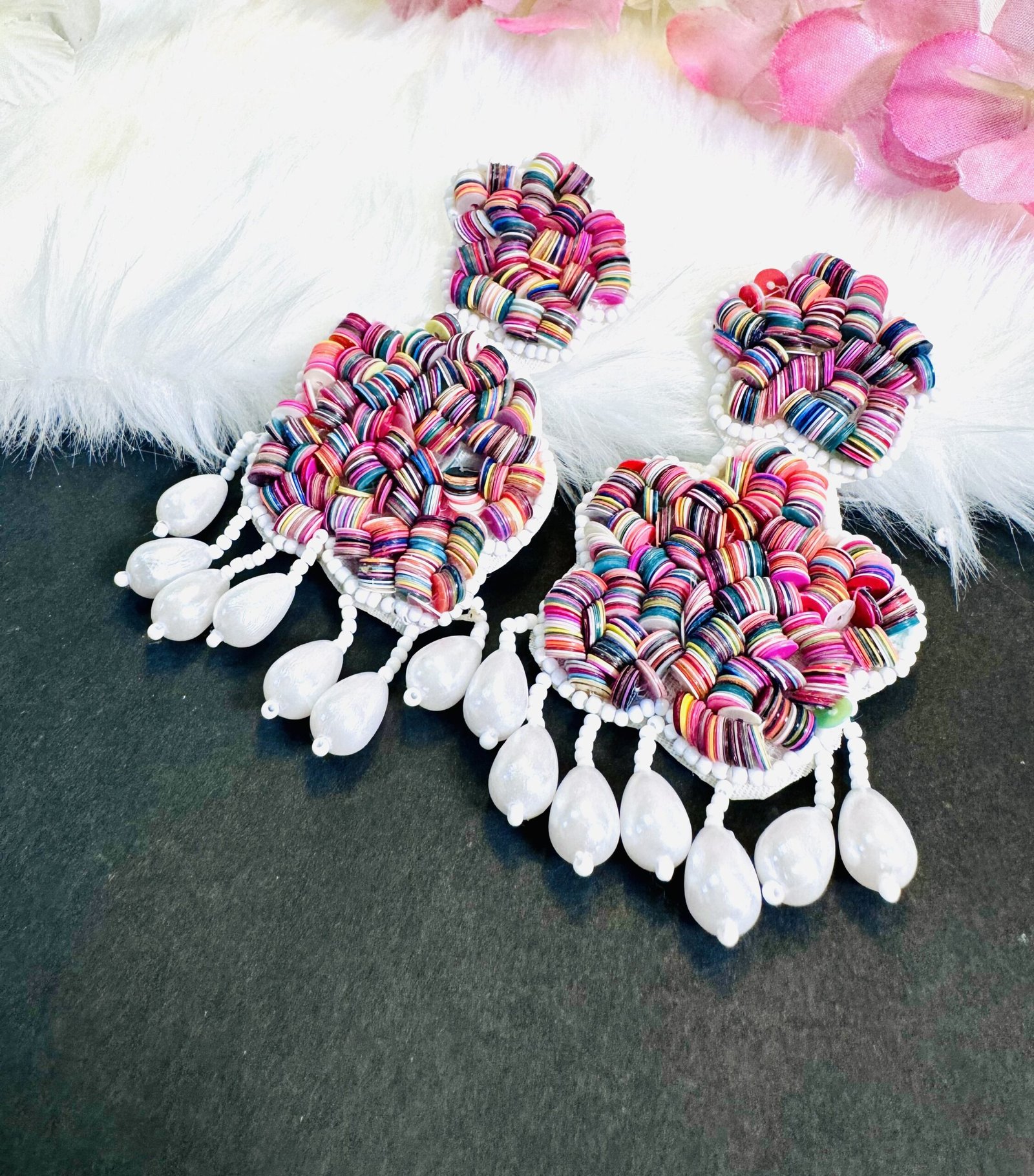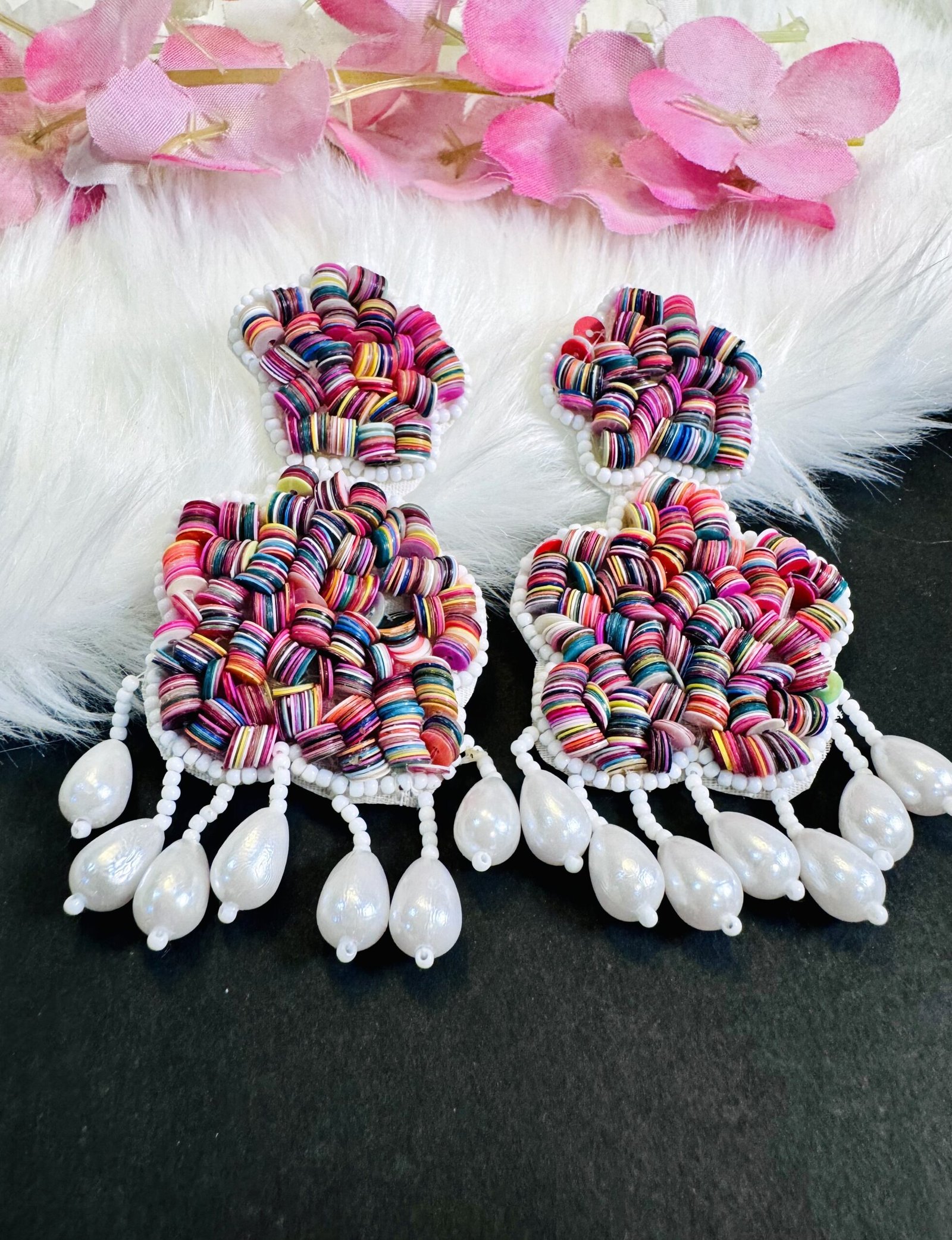 These handmade earrings are a statement piece with a vibrant and playful design. They feature a large, colorful flower-shaped design in the center, with smaller flower-shaped details cascading below. The earrings are made with a mix of colorful beads and white pearls, adding a touch of elegance. They have a dangling design with multiple drops of white pearls, creating a dynamic and eye-catching look.