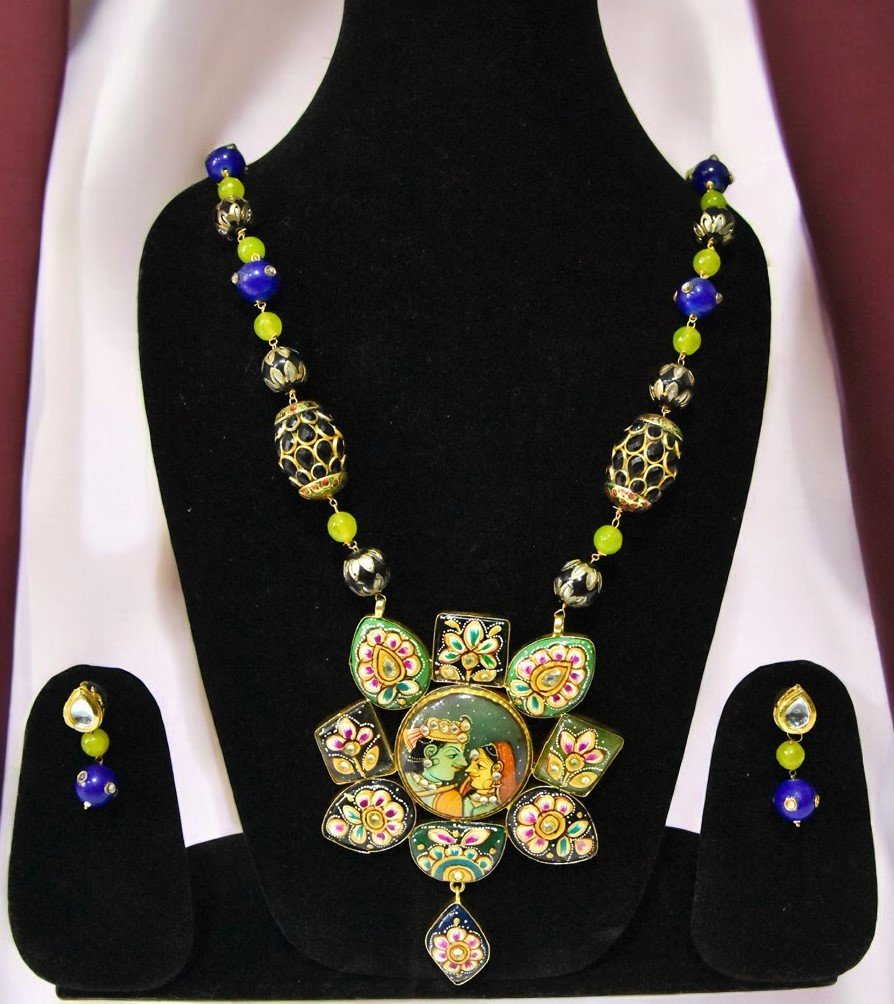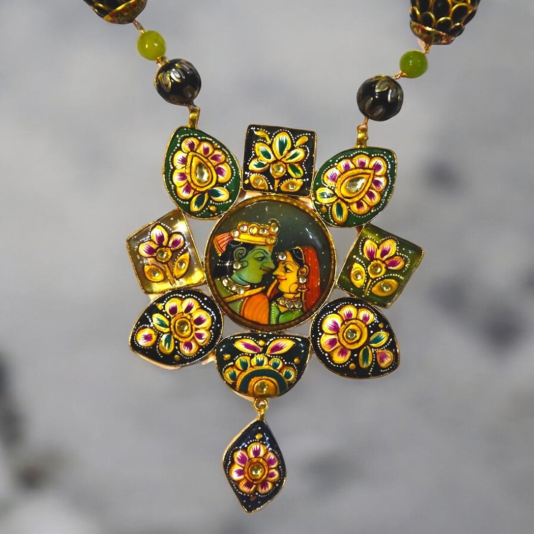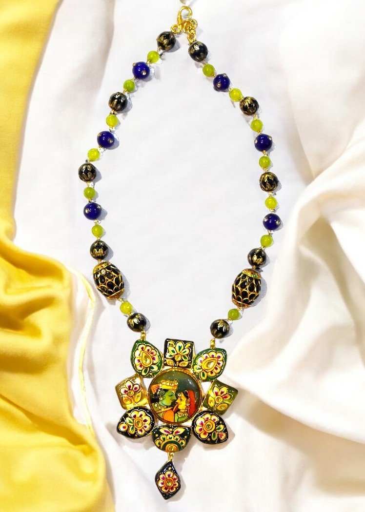 Necklace: Devoted Beautiful Radha Krishna necklace is made of gold-toned metal and features a large, round pendant with a colorful painting of Shri. Radha and Krishna in the center. The pendant is surrounded by smaller, multi-colored beads and intricate floral designs.
