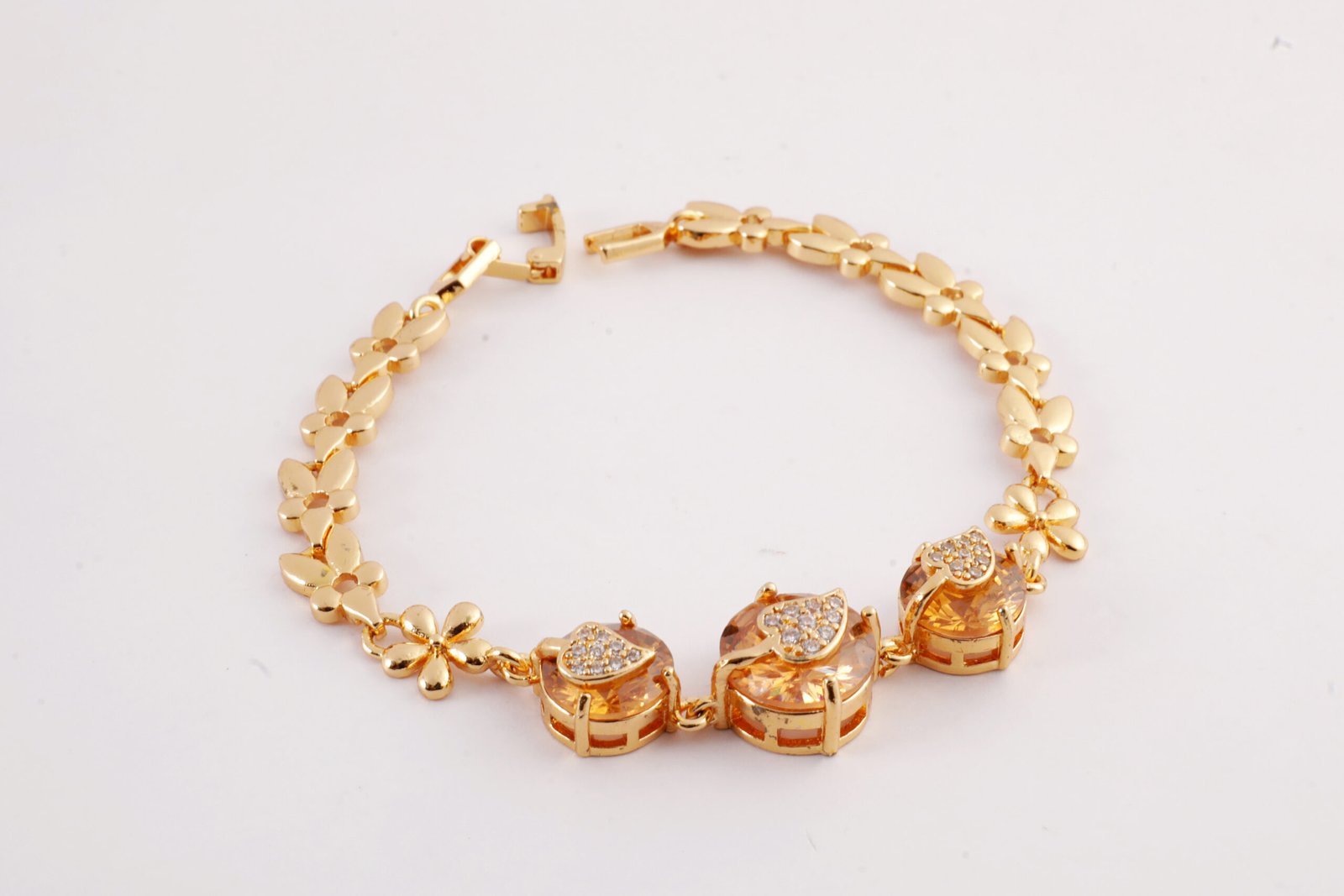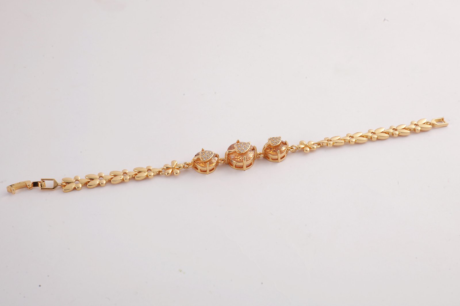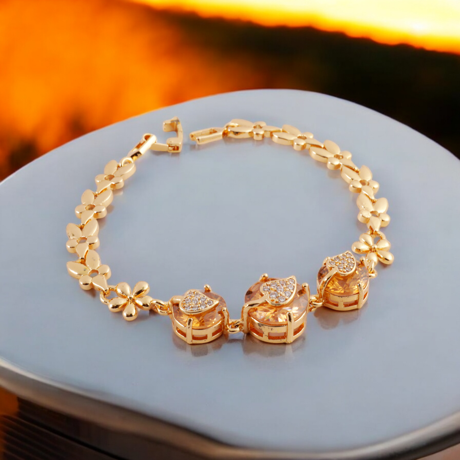 Leaf and flower design bracelet. The bracelet features a chain of interconnected leaves and flowers, with three larger, oval-shaped stones set in the center. The stones are of champagne color and are surrounded by smaller, sparkling stones. The bracelet has a clasp closure and is quite elegant and delicate.