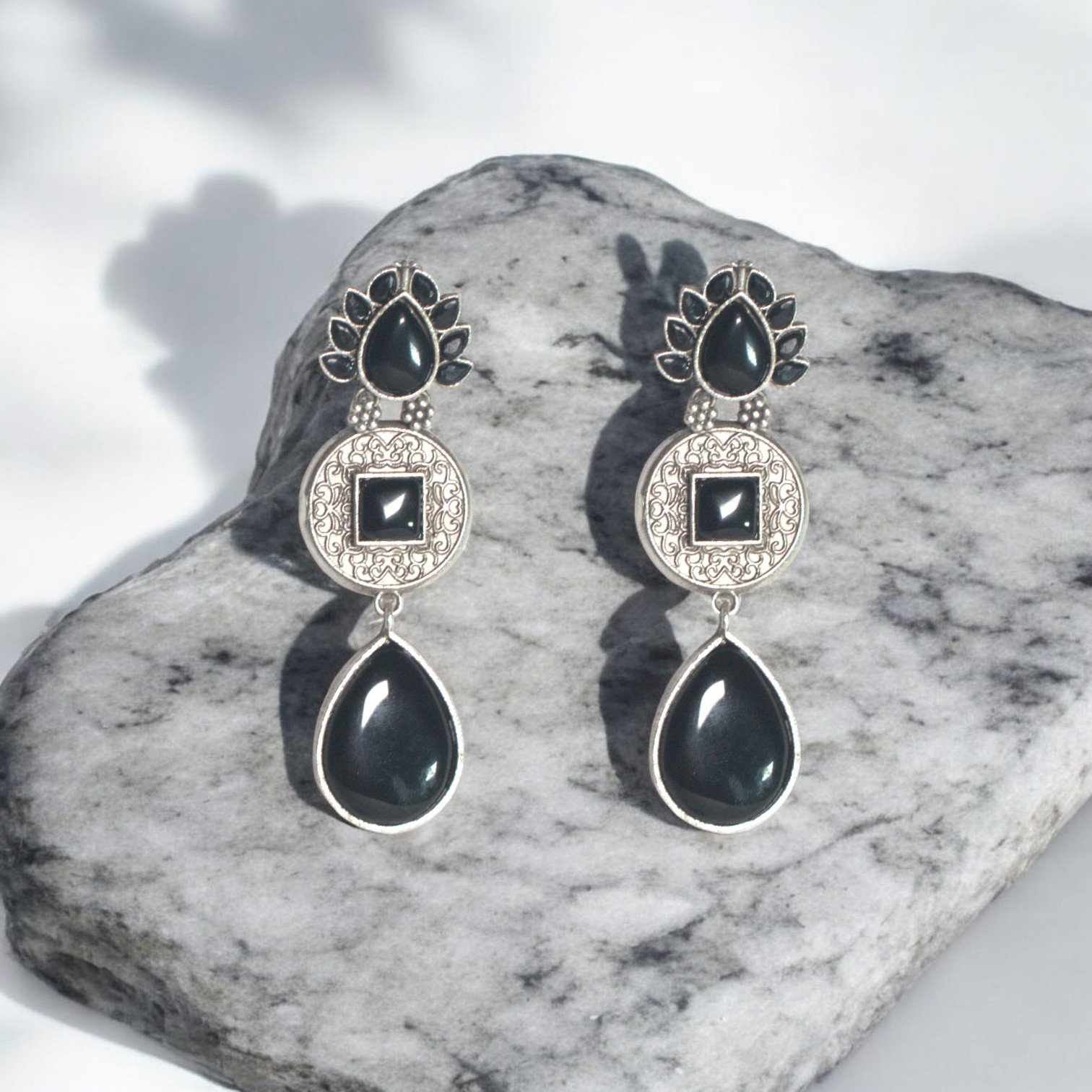 Embrace timeless elegance with our striking three-tier drop earrings, where classic design meets contemporary sophistication. Each piece features a graceful progression from a lotus-inspired crown set with black onyx, flowing through an intricately etched silver medallion, and culminating in a dramatic teardrop stone that captures the mystery of the night.