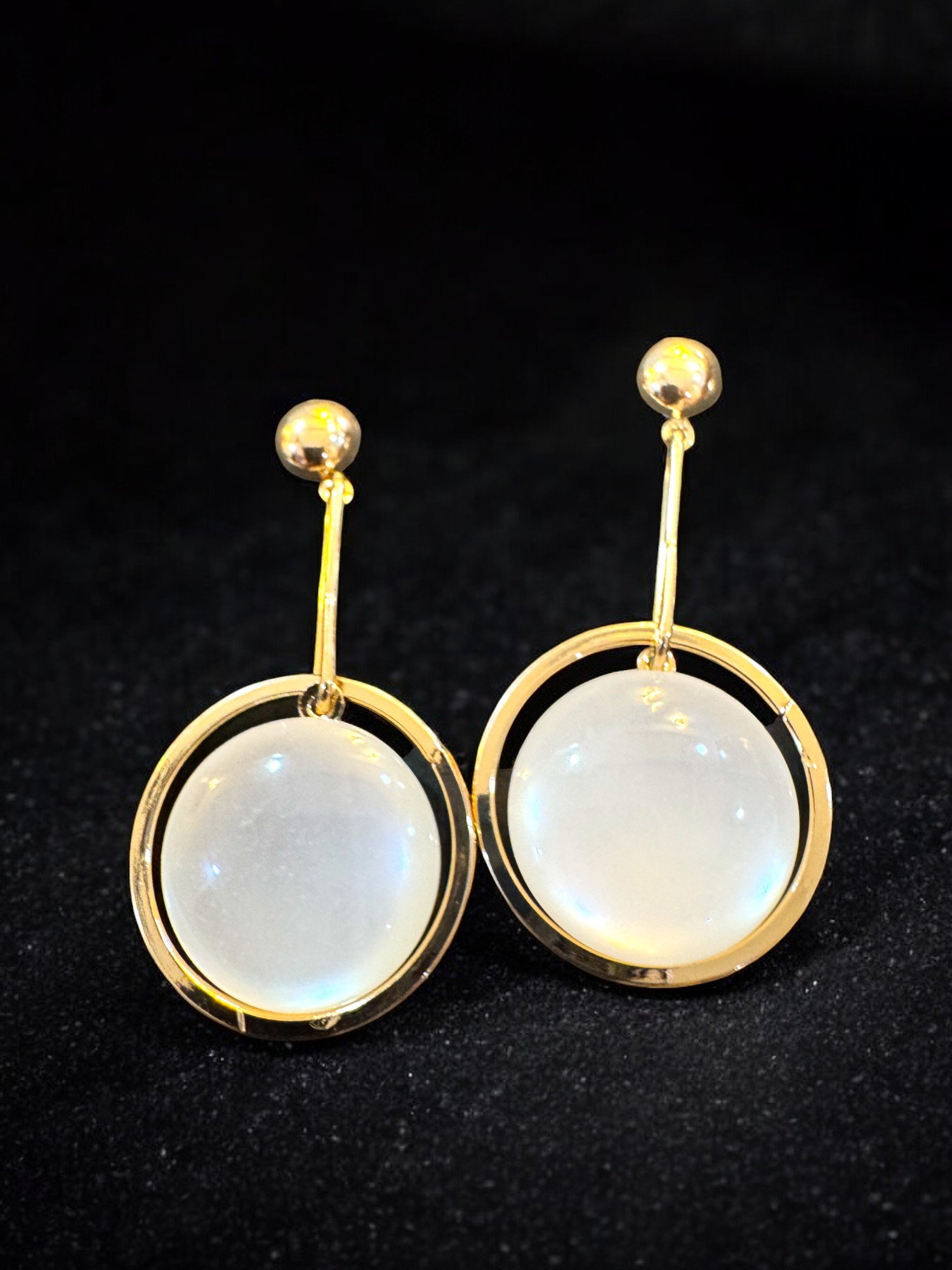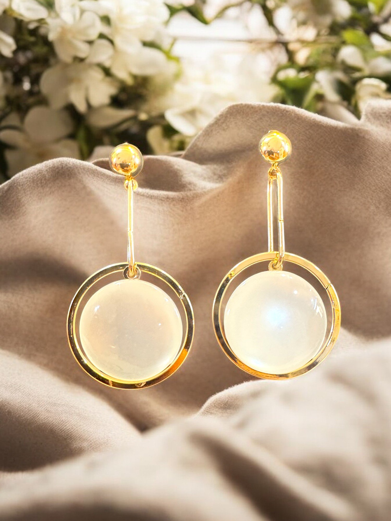 Shimmering Moonstone Earrings – Crafted with a unique circular design and featuring a captivating moonstone gemstone. These earrings are perfect for adding a touch of ethereal beauty to any outfit