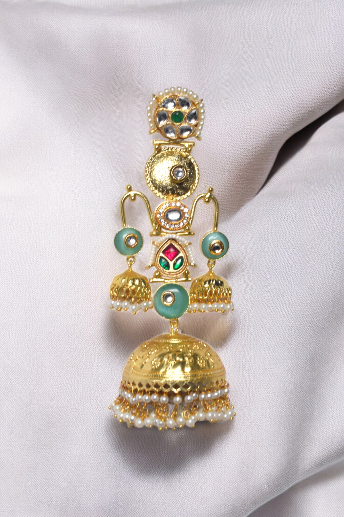 These exquisite Jhumka earrings are a stunning fusion of traditional craftsmanship and modern style. The intricate gold-toned metalwork is adorned with a vibrant array of colorful stones and pearls, creating a captivating visual contrast. The jhumka design with cascading elements adds a touch of elegance and movement. These statement earrings are perfect for special occasions and will make you the center of attention.