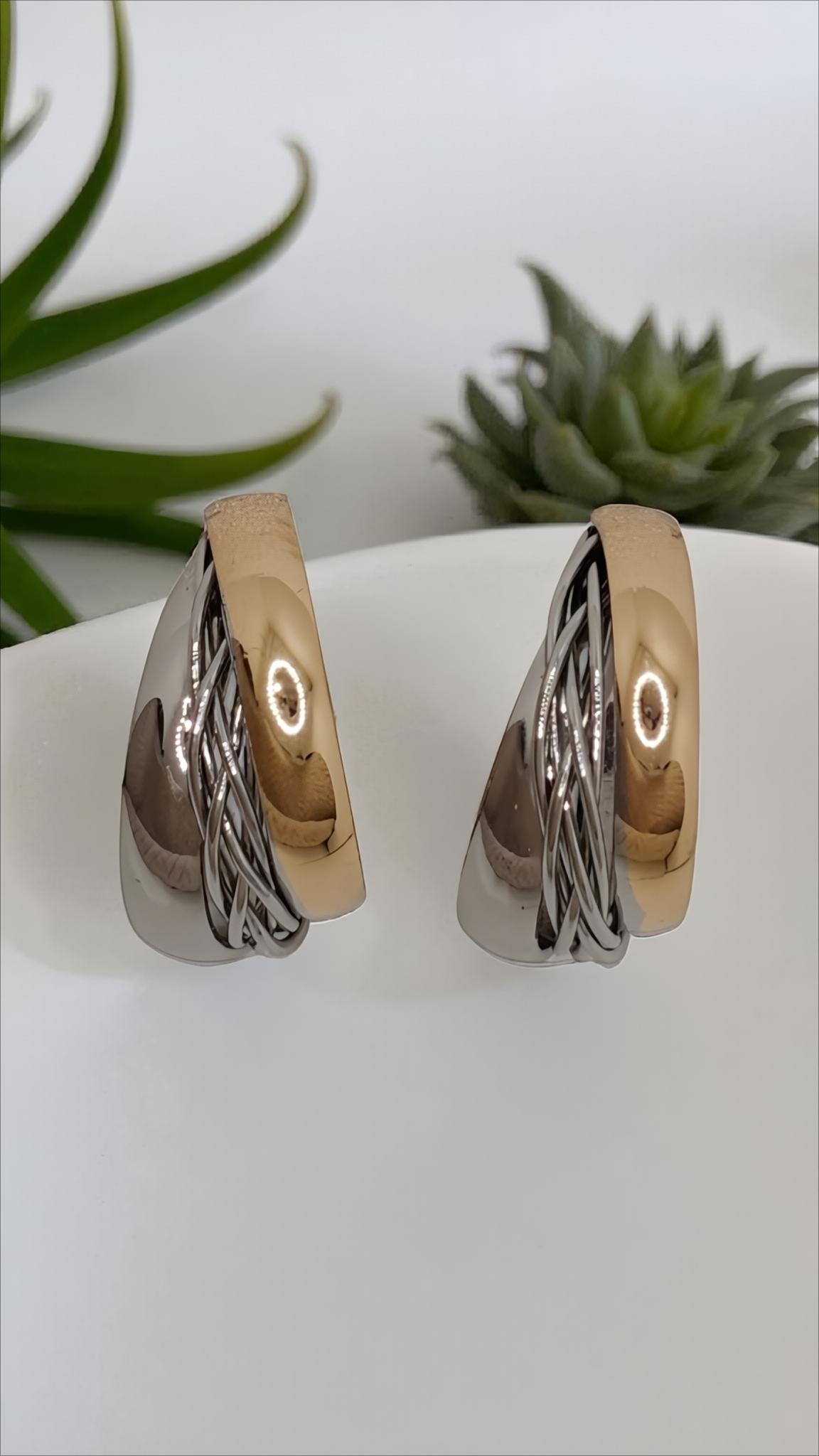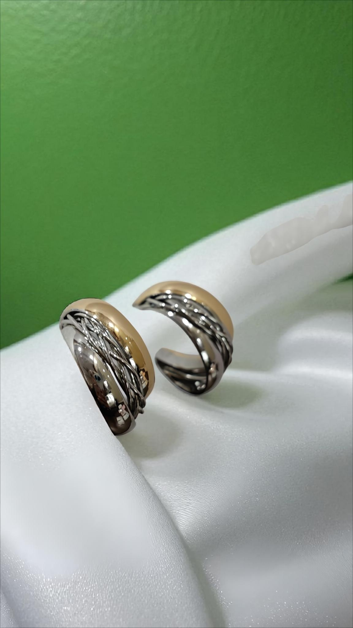 Discover the sleek elegance of this unique pair of earrings. Each cuff showcases a captivating design with a smooth, polished gold-tone section complemented by multiple intricately twisted or rope-like silver-tone strand