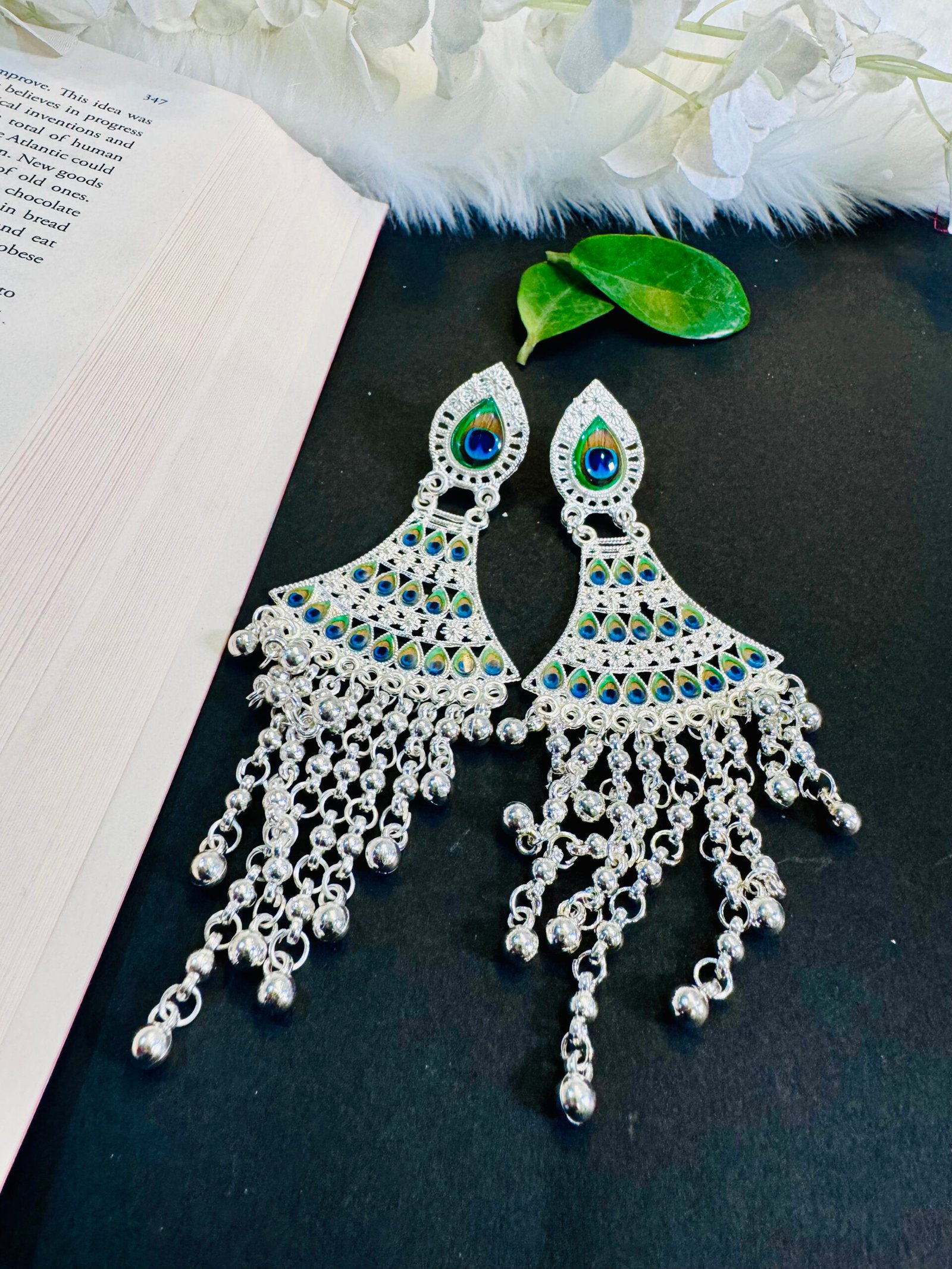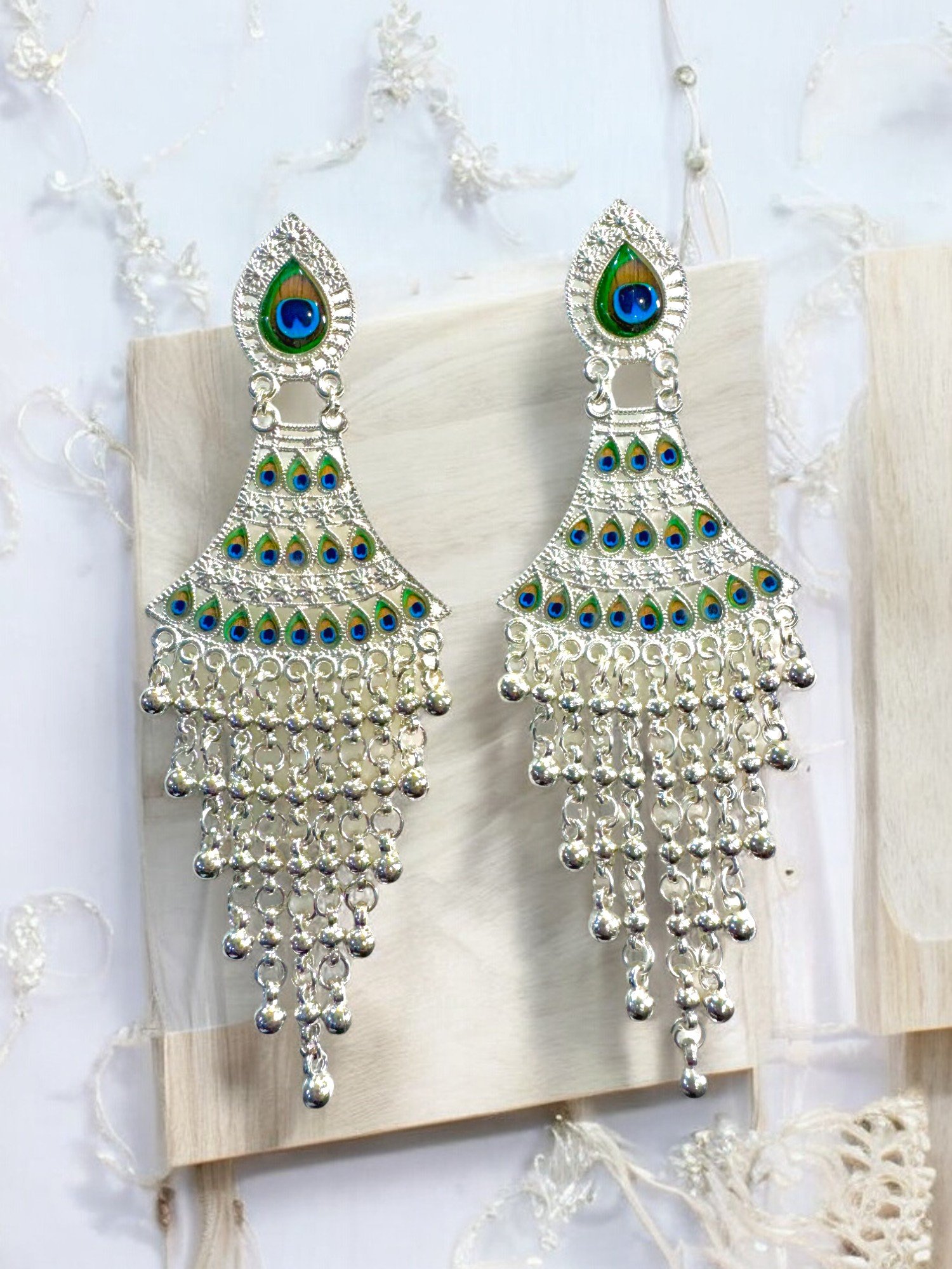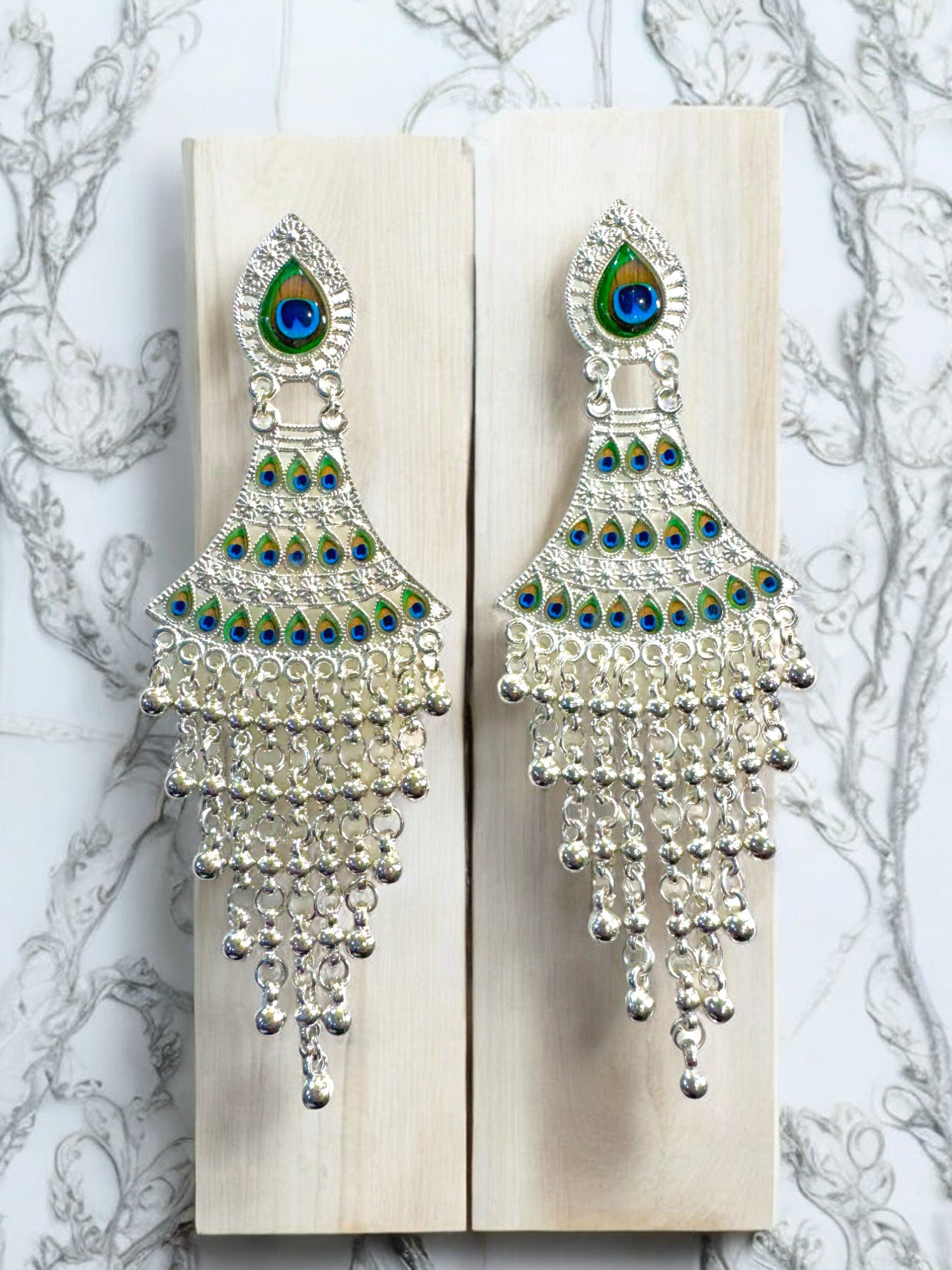 These earrings are a stunning and intricate piece of jewelry with a distinct peacock-inspired design. The earrings feature a silver-toned metal base with multiple layers of cascading beads, creating a beautiful waterfall effect. At the top, there is a prominent peacock eye motif adorned with vibrant green and blue enamel, adding a pop of color to the design. The overall style is reminiscent of traditional Indian jhumka earrings with a contemporary twist. size 10 cm approx