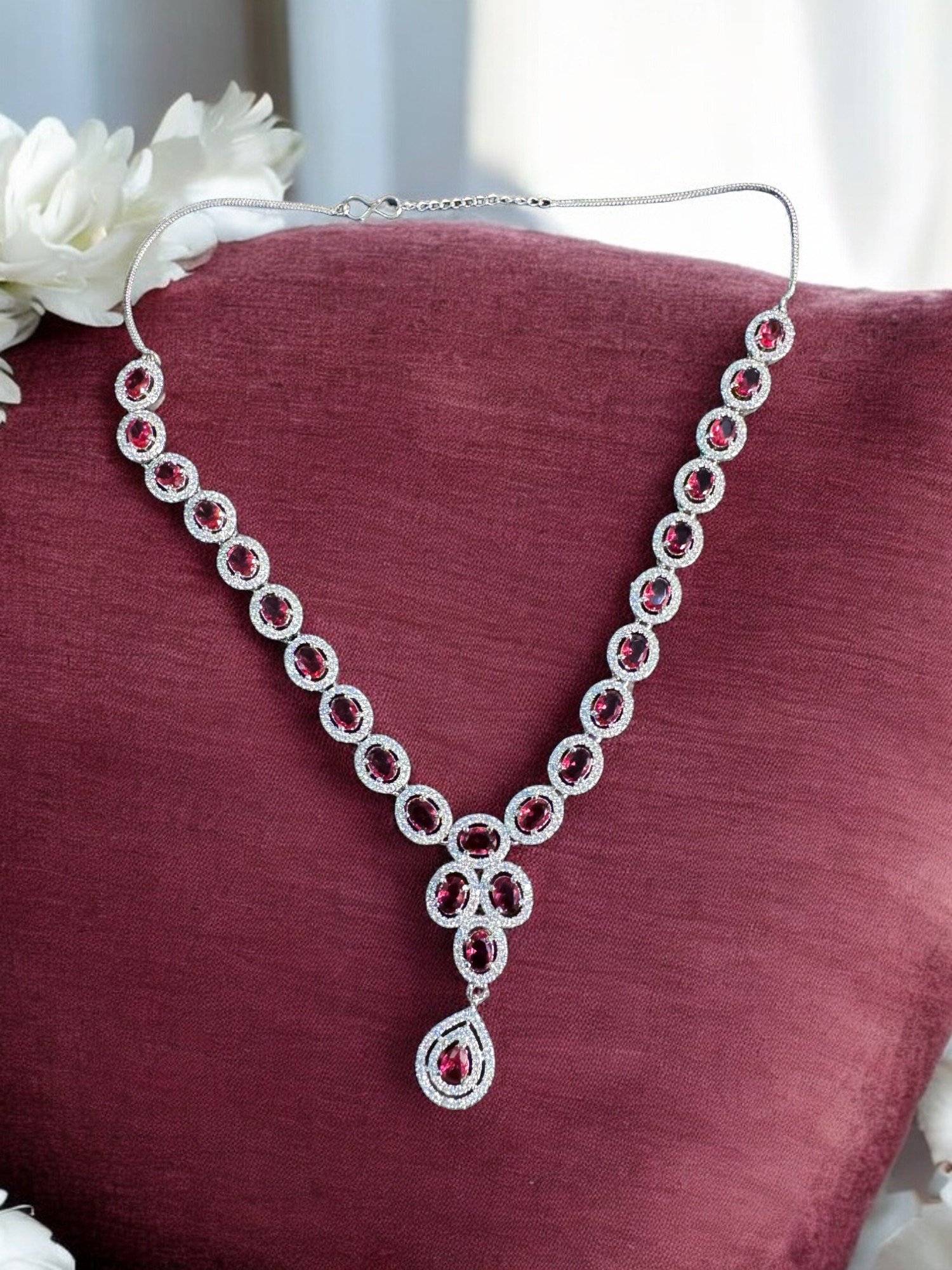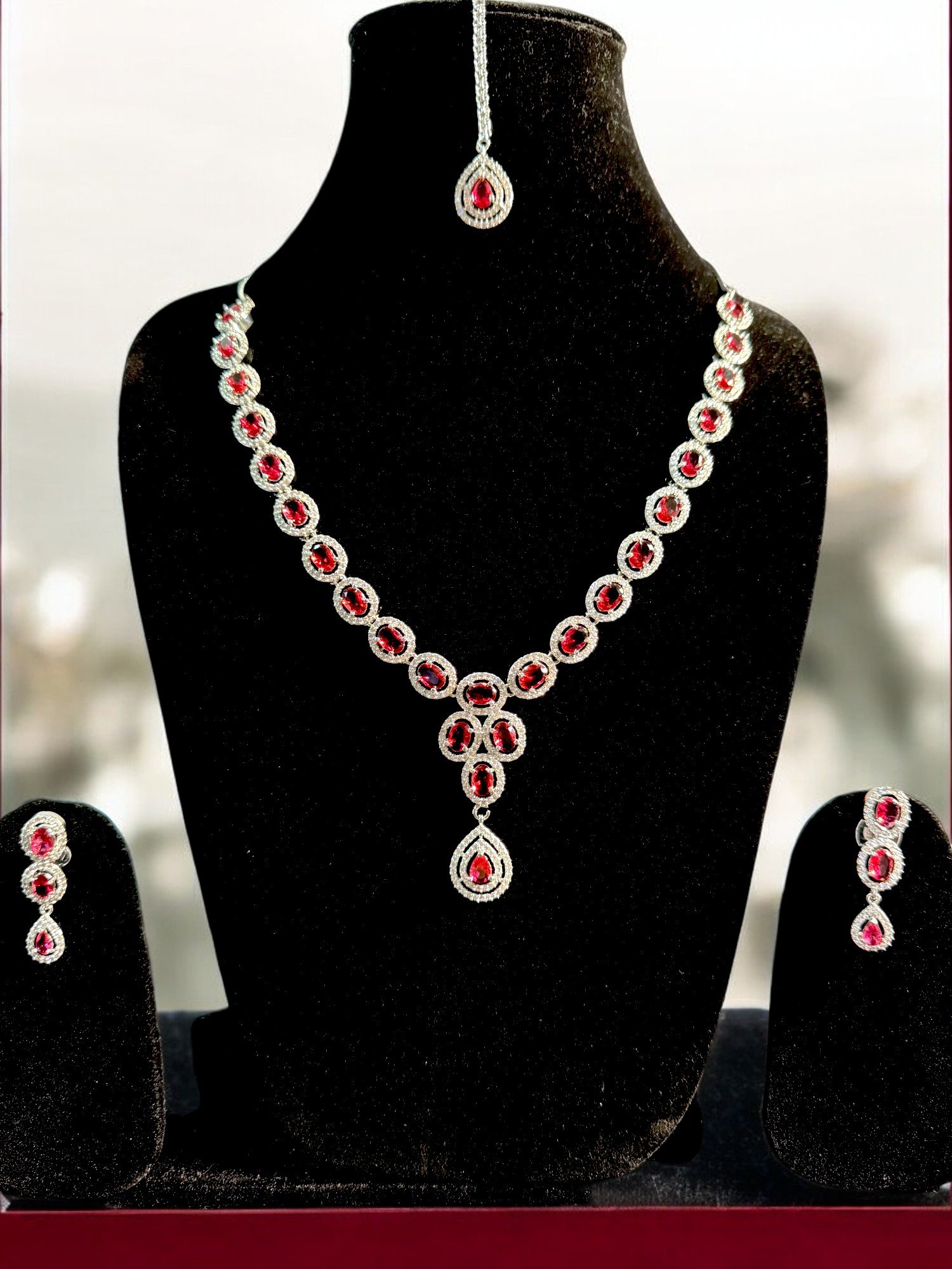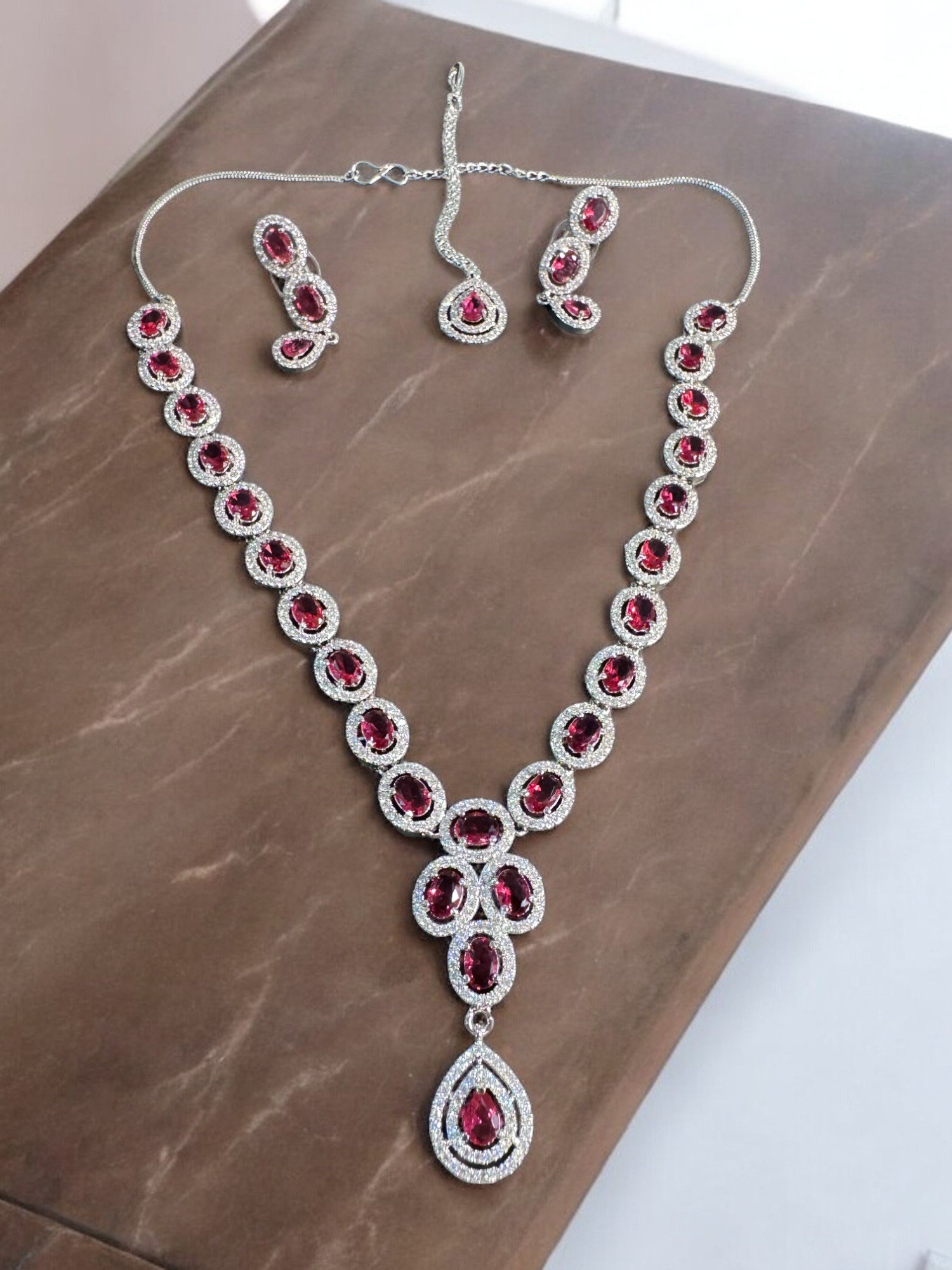 AD premium silver necklace set in maroon stones, with earrings and mang tikka