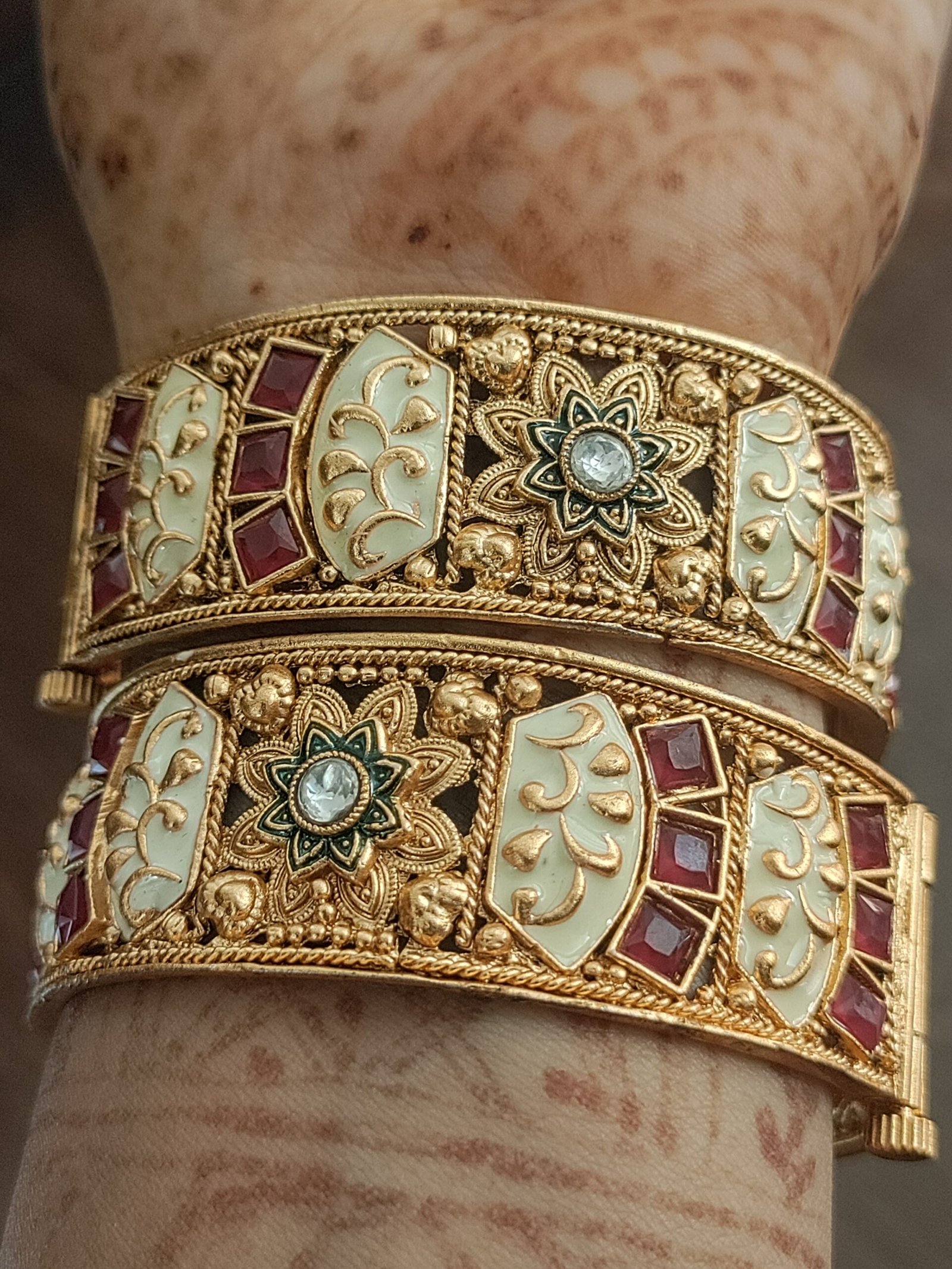 • Intricate Enamel Work: The bangles feature a captivating floral motif, complemented by a central design showcasing a green stone, symbolizing prosperity and good fortune.