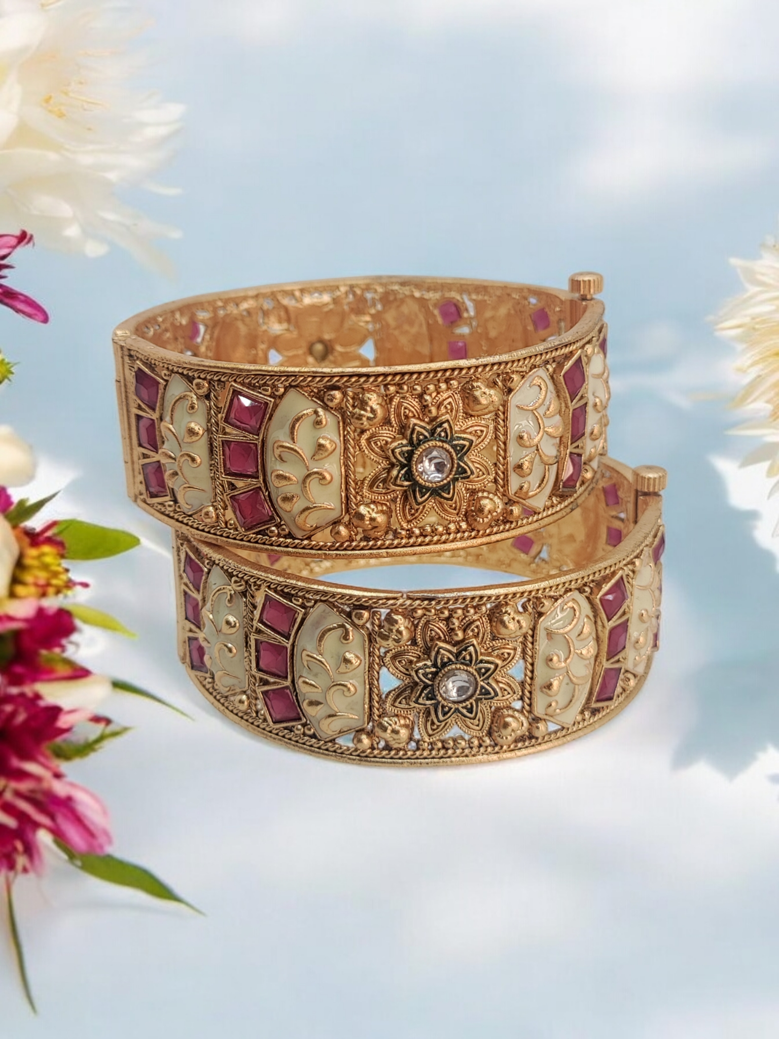 • Vibrant Colors: The enamel work in shades of pink, white, and green adds a touch of vibrancy and elegance to the set.