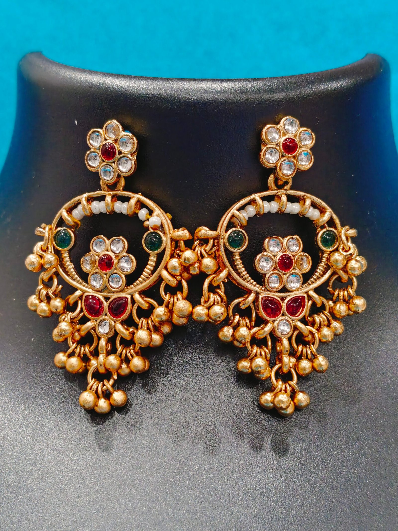 * Earring Style: Matching drop earrings with gold filigree and stone detailing.