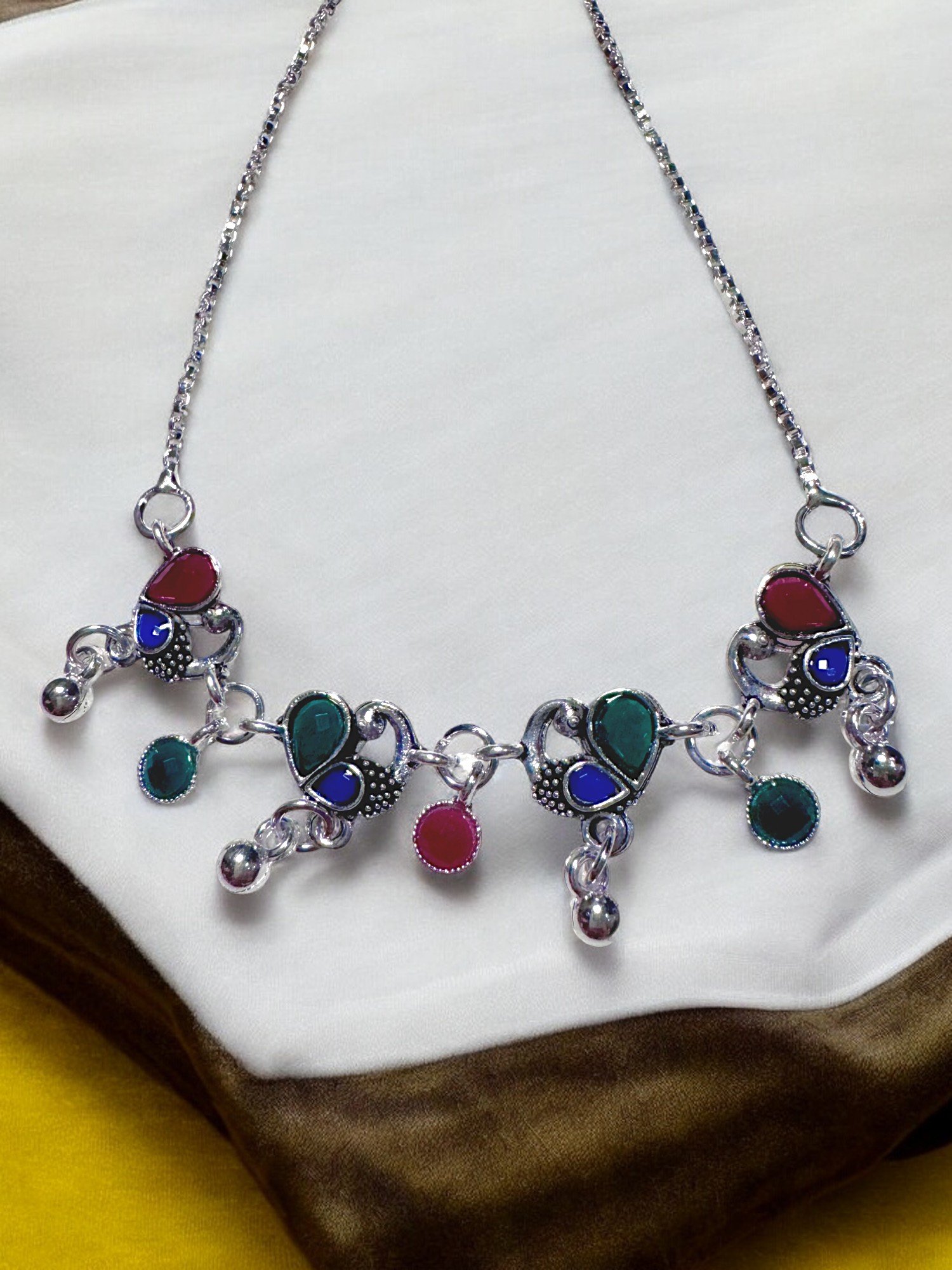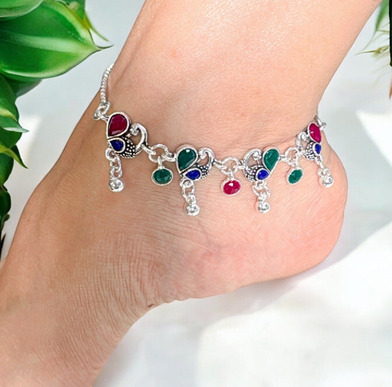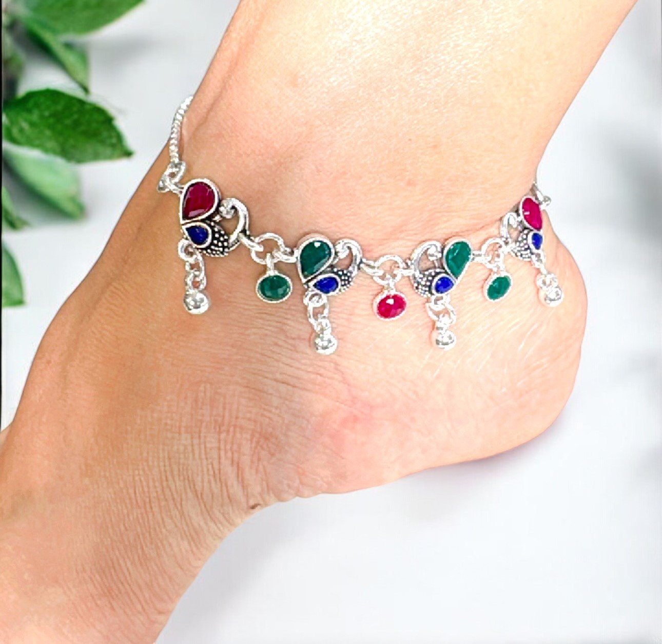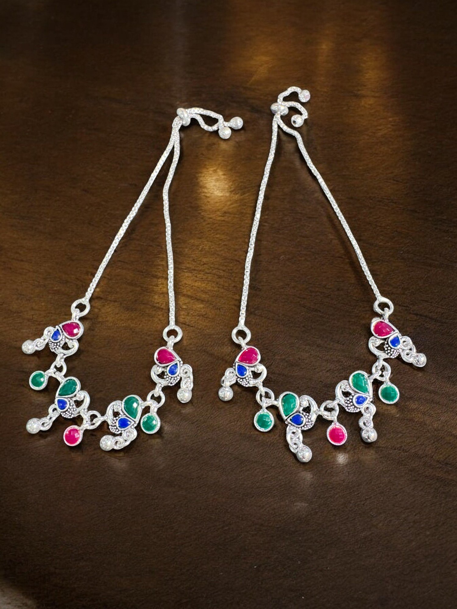 Silver anklet with peacock motifs and colorful gemstones. The anklet has a chain design with a series of peacock-shaped pendants. Each pendant is adorned with green, red, and blue gemstones. The anklet also has dangling charms with green and blue gemstones.