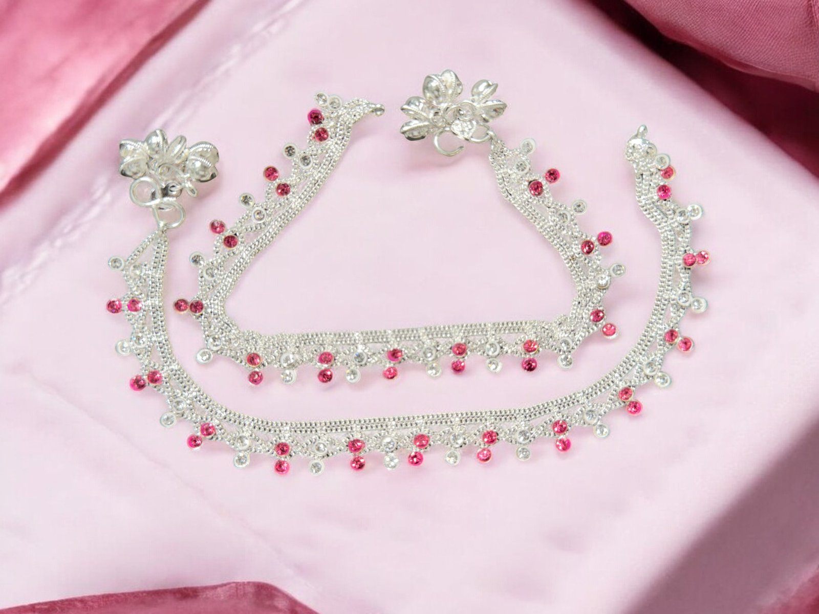 Pair of silver anklets with pink gemstones. The anklets have a thick chain design with rows of pink beads. The anklets also have a flower-shaped clasp and a decorative toggle closure.