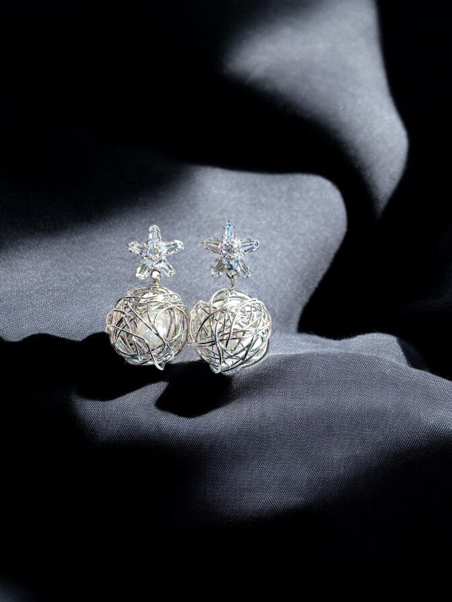 Contempary locked pearl round shape with sparkling star earrings. Perfect for everyday wear or parties. These earring feature pearl wrapped with steel color wires, dangling from star above.