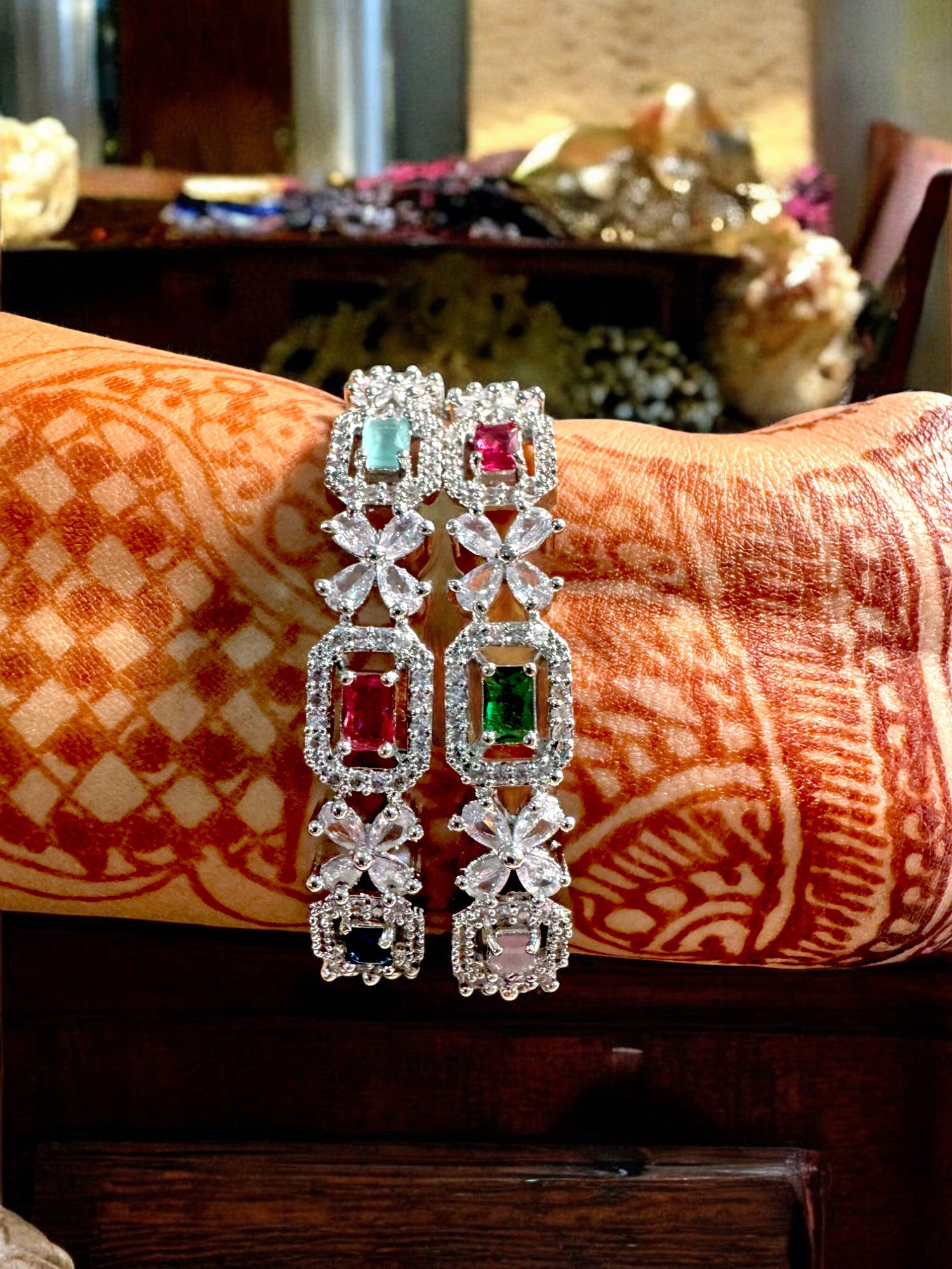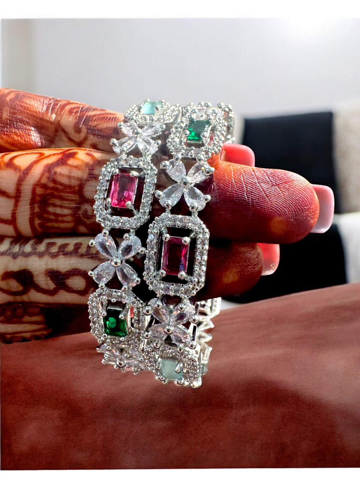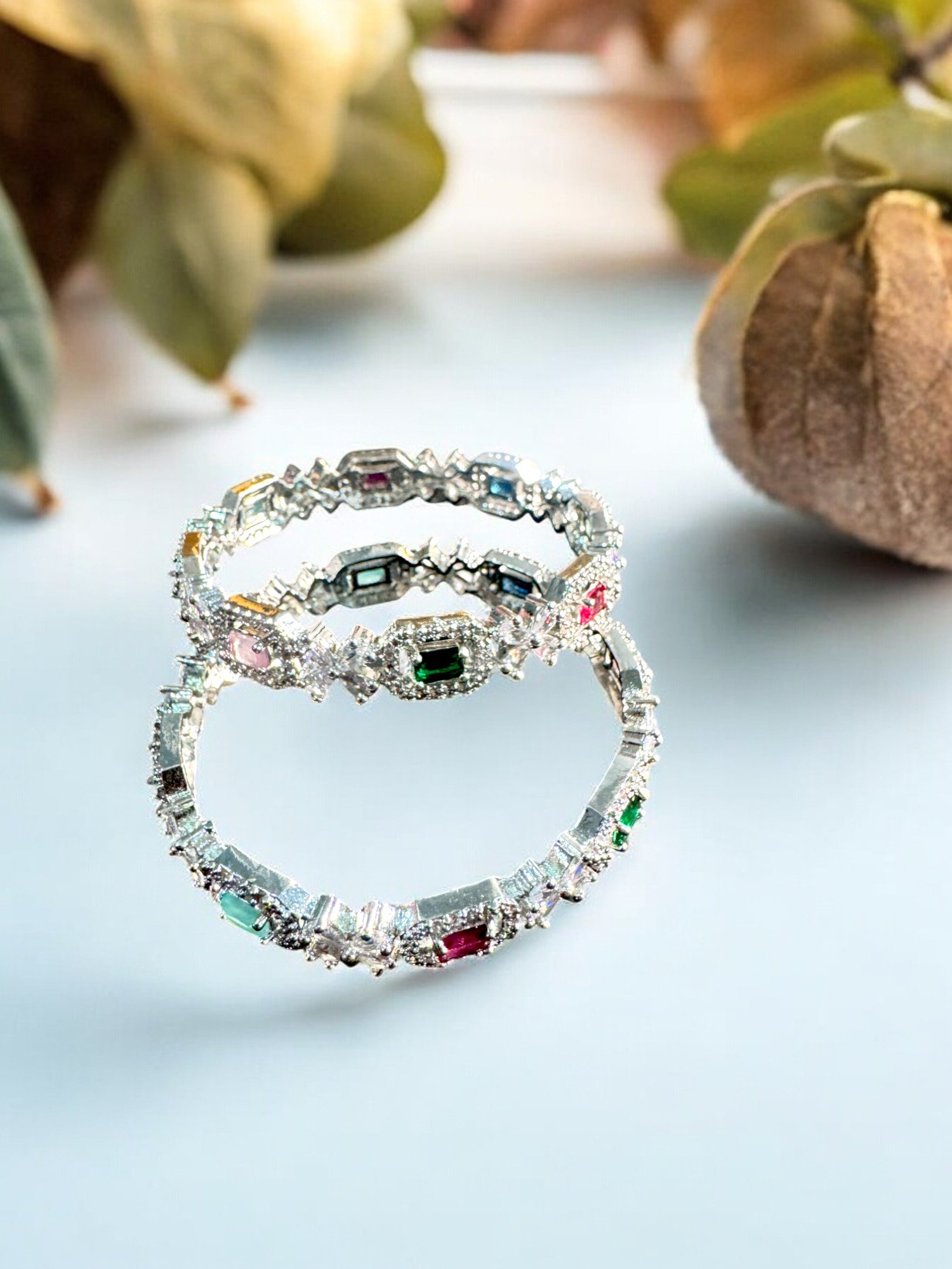 Indulge in the opulence of this exquisite American Diamond Bangle, a masterpiece designed to add a touch of glamour to any outfit. Crafted with meticulous attention to detail, this bangle features a mesmerizing array of sparkling American diamonds, set in a timeless silver-toned design.