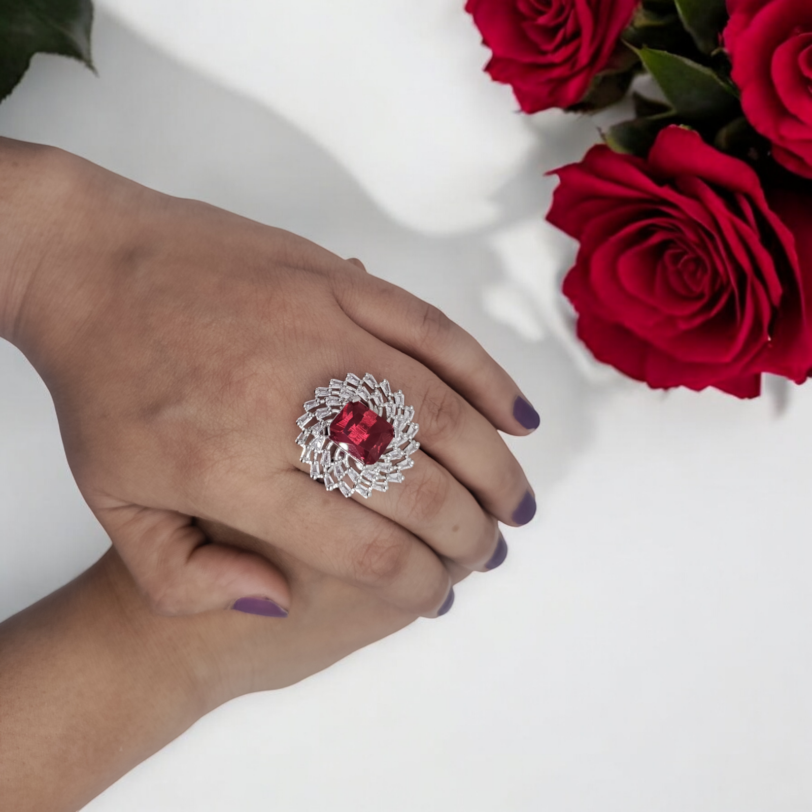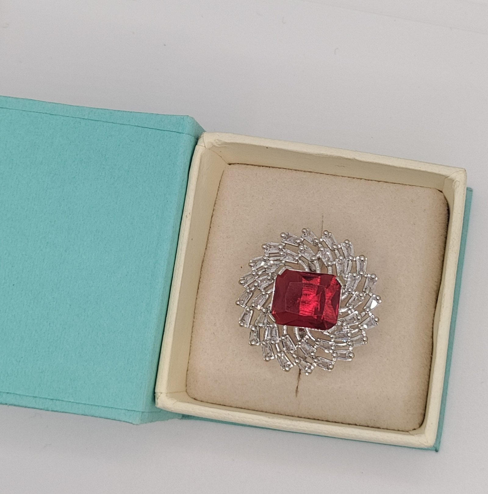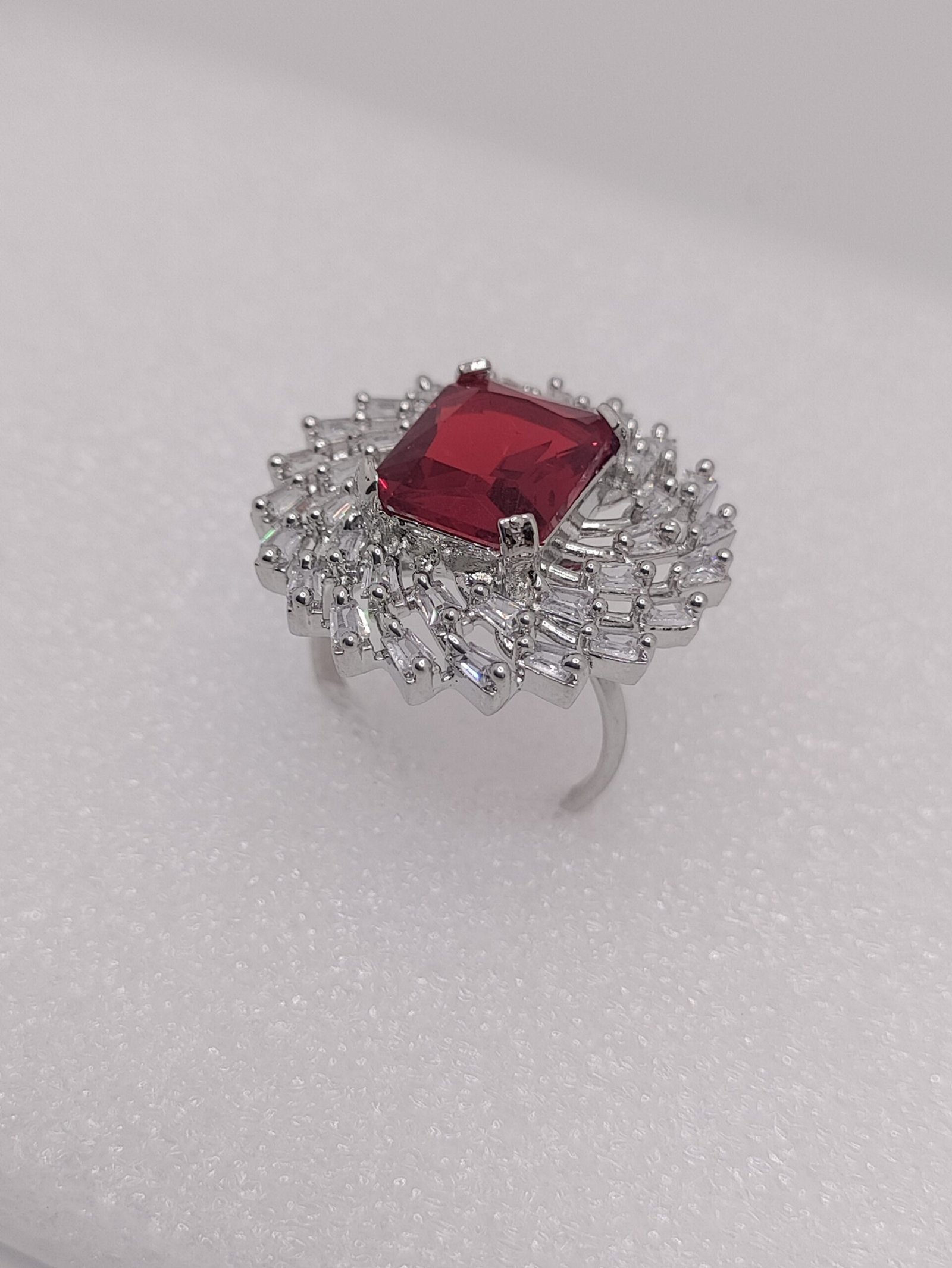 Elevate your style with this exquisite silver ring featuring a vibrant red gemstone surrounded by sparkling diamond accents. The intricate design and high-quality materials make this ring a true statement piece. Perfect for any occasion, this ring is a timeless addition to your jewelry collection.