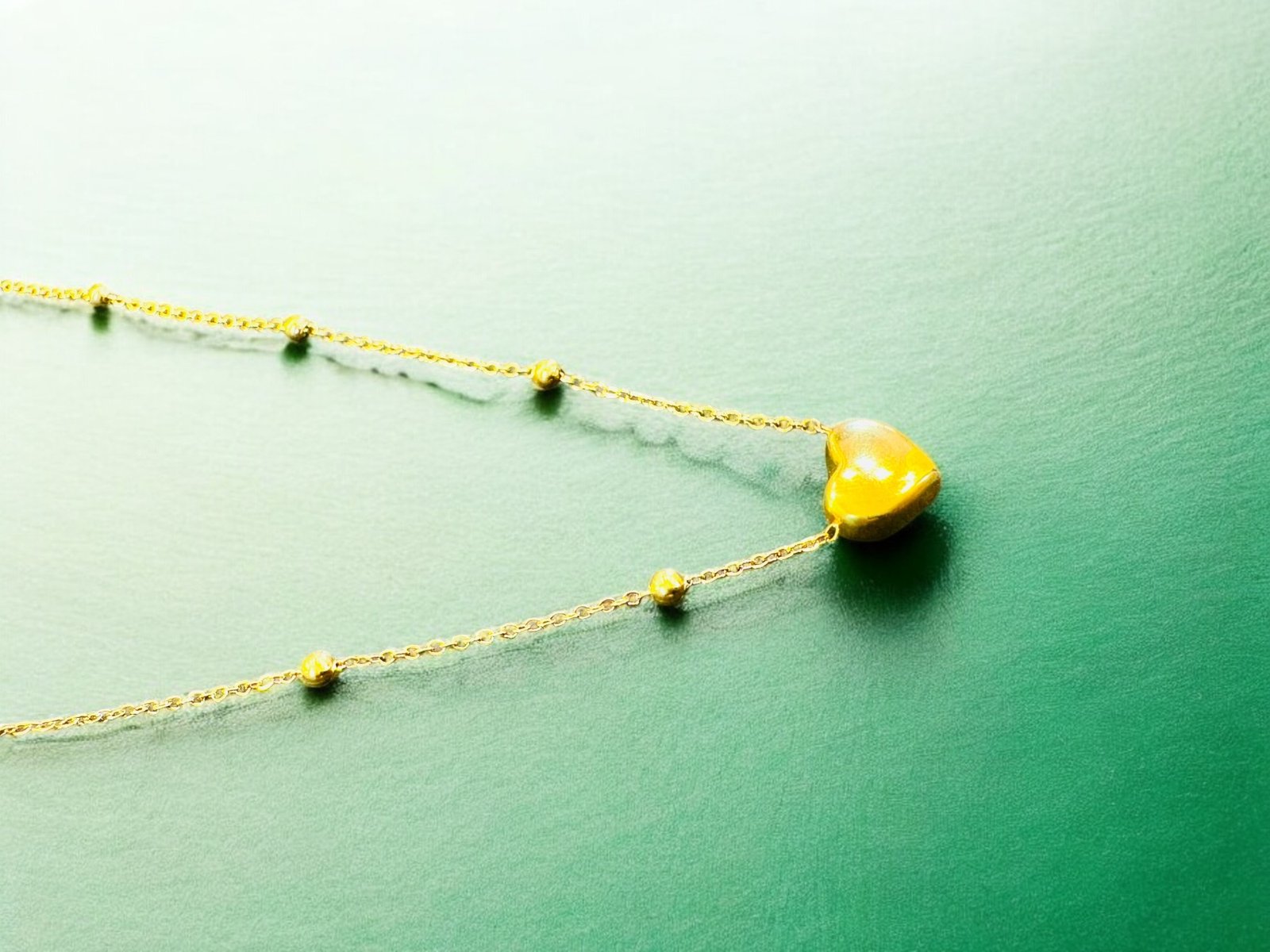 This dainty gold necklace features a heart pendant adorned with sparkling cubic zirconia. Perfect for adding a touch of sunshine and elegance to any outfit.