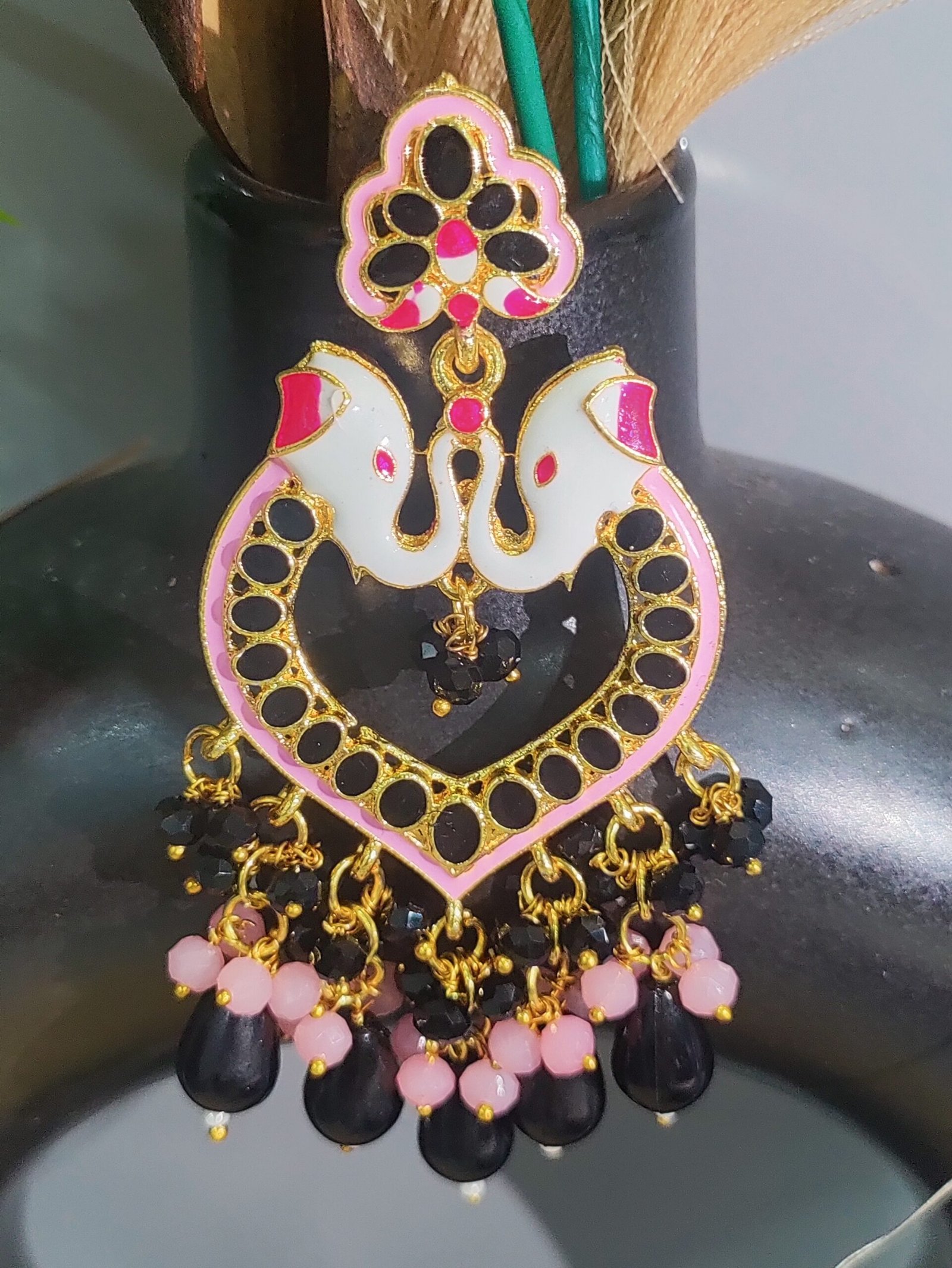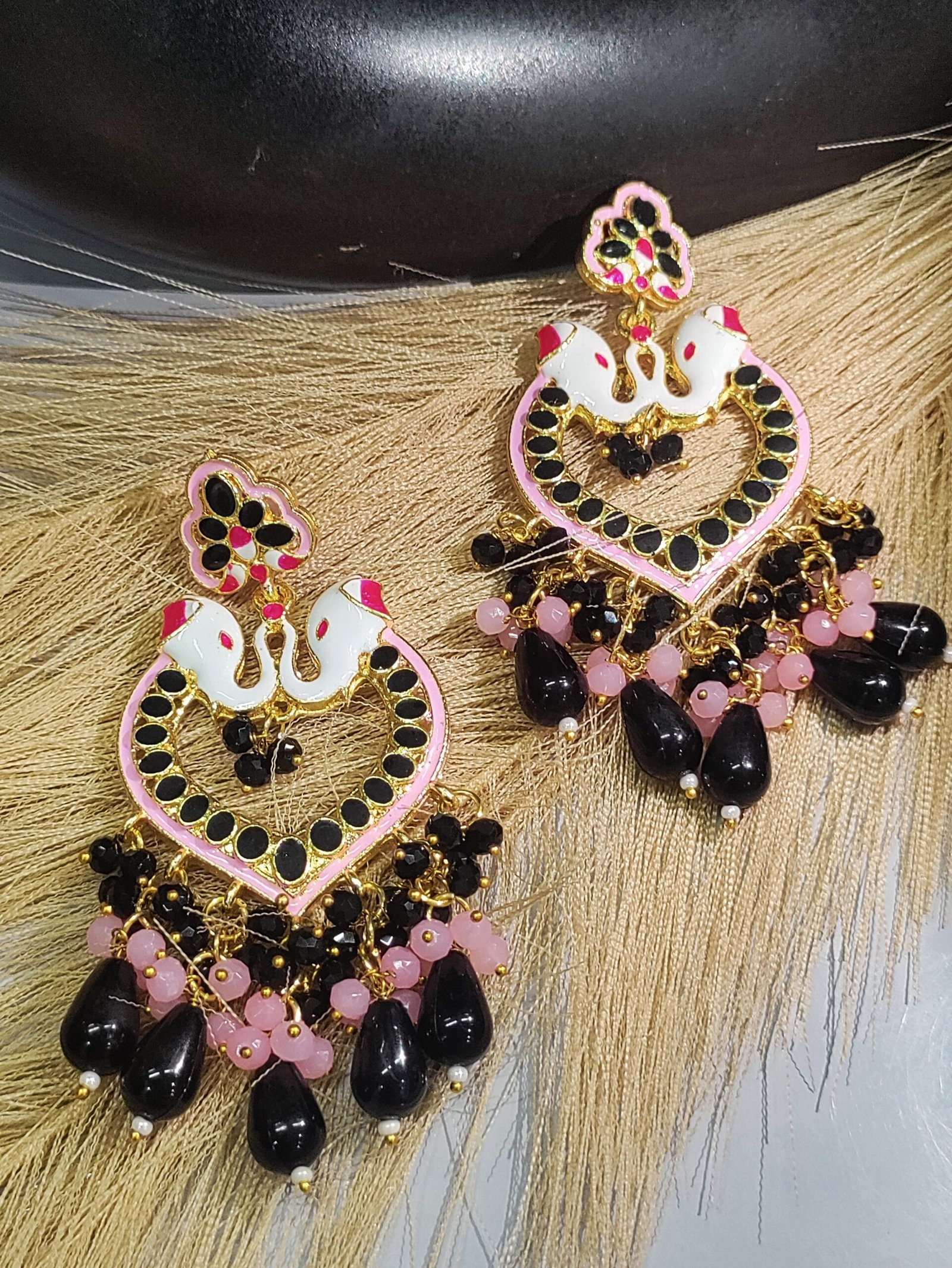 Traditional Elephant Earrings with an Array of Delicate Pink and Black Beads Capped with Golden Base to Add a Toch of Modern Elegance