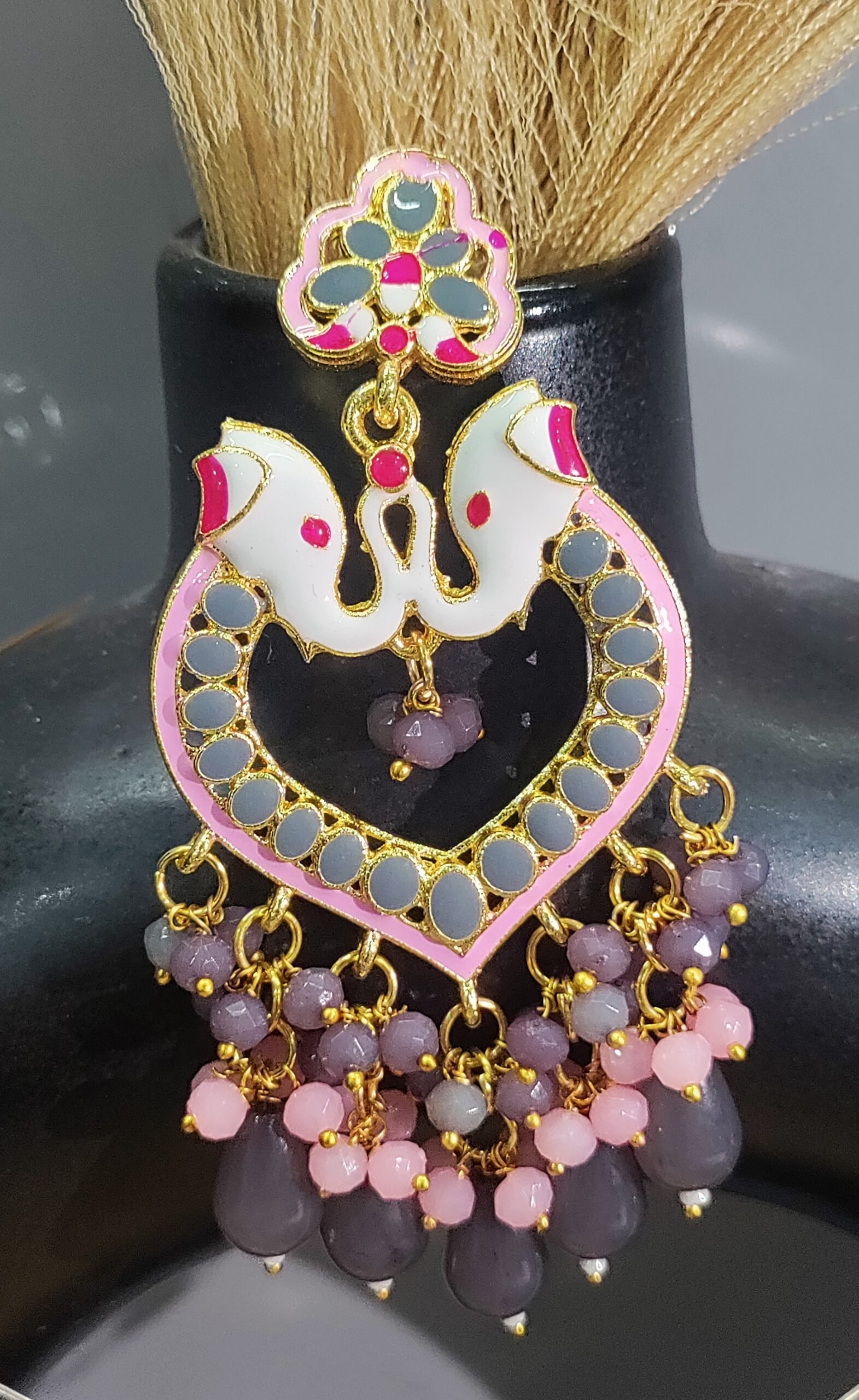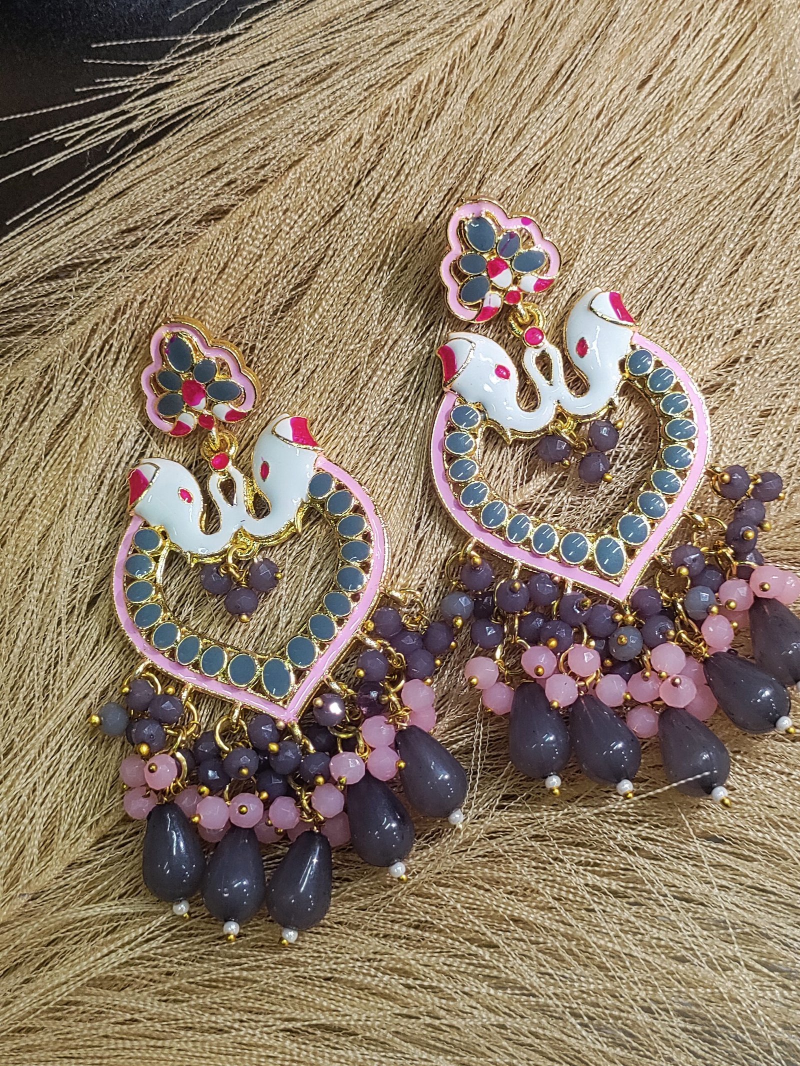 Traditional Elephant Earrings with an Array of Delicate Pink and Purple Beads Capped with Golden Base to Add a Toch of Modern Elegance